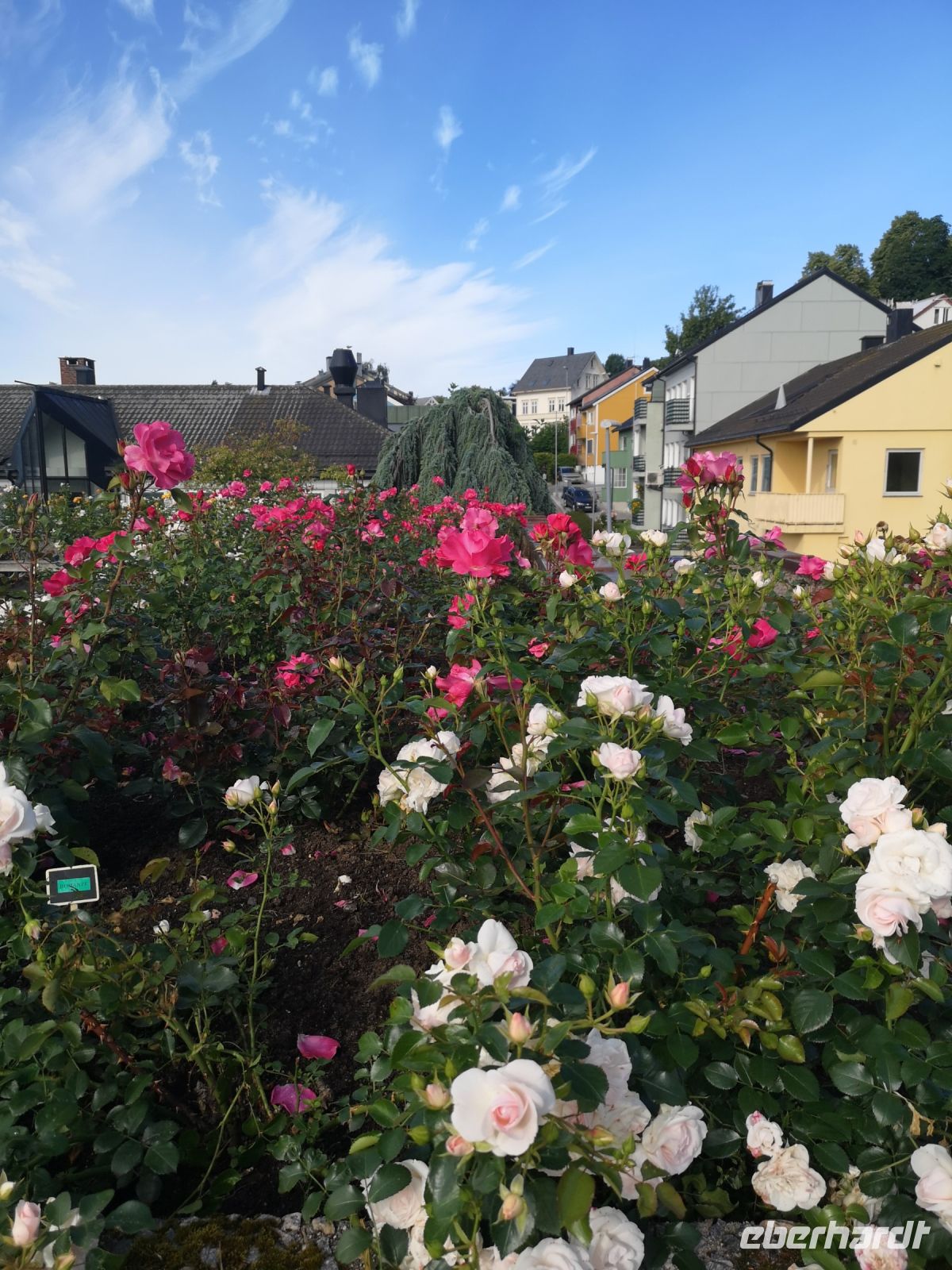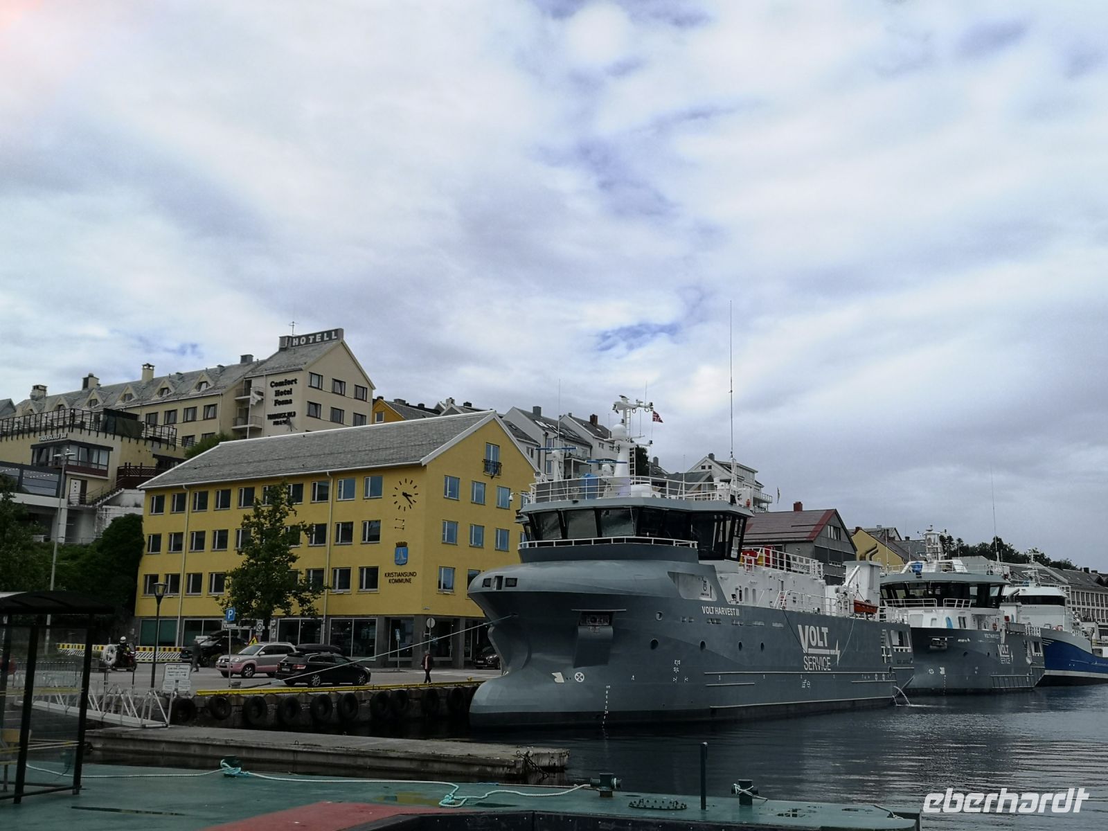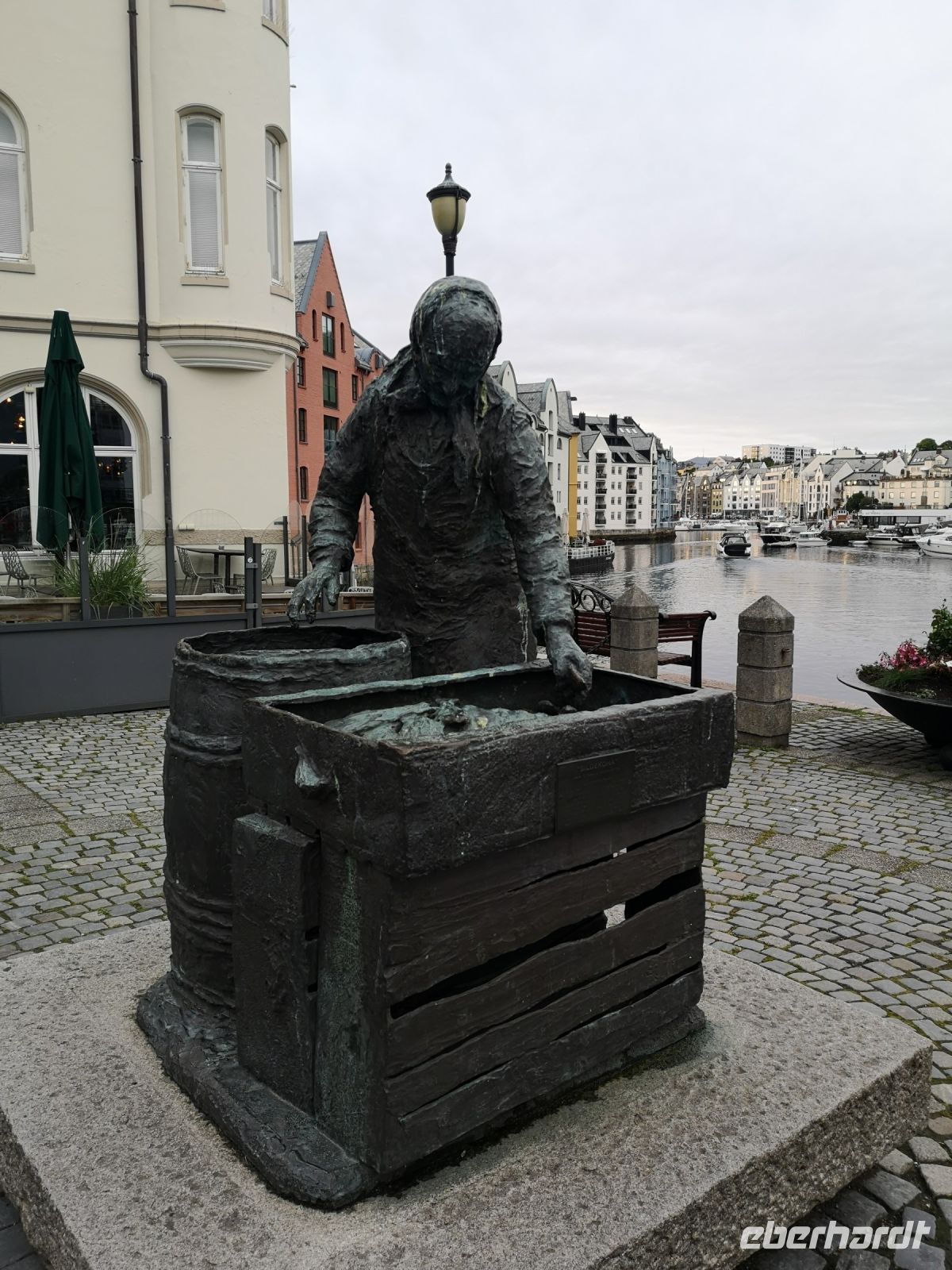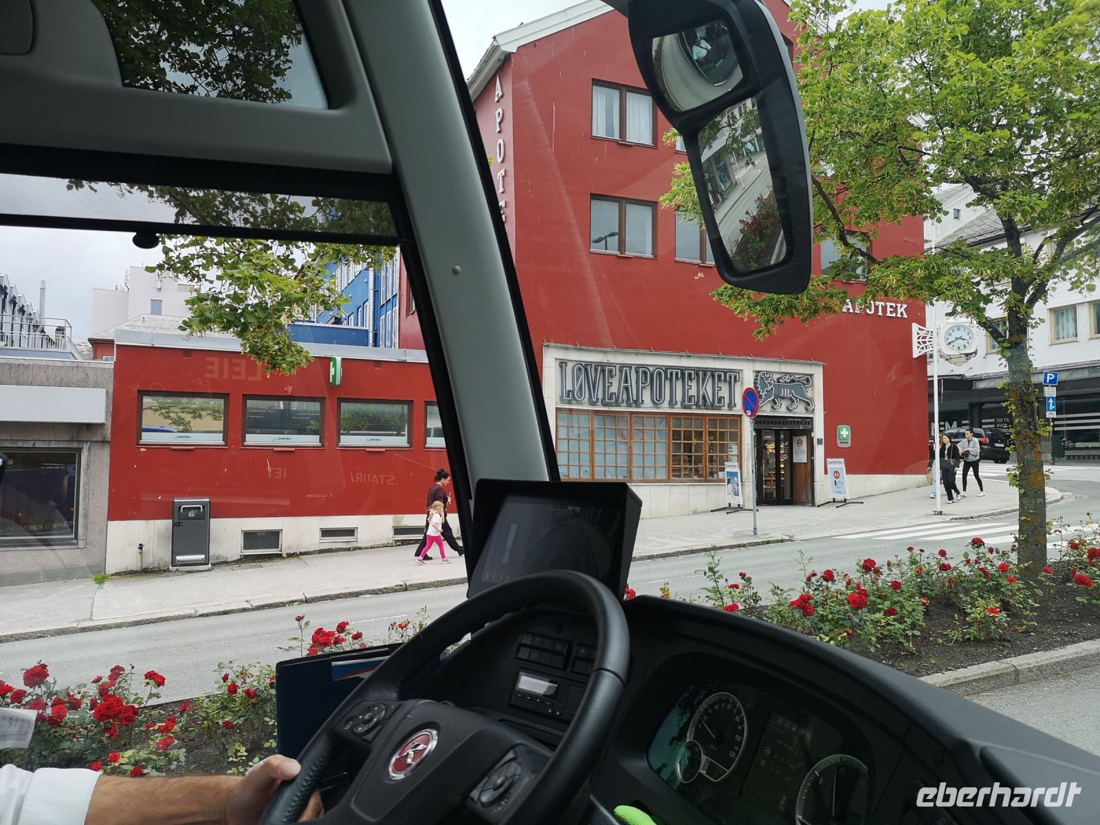 Molde stand an diesem Morgen da wie ein Mädchen, gehüllt in Rosen, Rosenduft und Sonnenschein. Zwar nicht für lange Zeit aber lange genug um einen wunderschönen Blick vom Varden auf die Stadt und den umliegenden Bergkranz genießen zu konnten. Dafür hüllte sich einige Stunden später der Trollstigen in die Regenwolken und herabkommende Nässe. Nix da, wir sind schon regengeprüft und die gute Stimmung im Bus konnte dadurch nicht gestört sein. Paar Hupfer über Gudbrandsjuvet (na ja, man nutzte doch die Brücken…:-)), ein Stopp in Valldal – schließlich ist Erdbeerzeit und man muss doch testen, was so hochgepriesen ist – und mit einer Fjordüberquerung kamen wir nach Alesund, genau gesagt fuhren wir direkt auf Aksla. Berühmtes Postkartenmotiv bot sich uns allemal. Und wenn man abends zu Fuß durch die Stadt mit einer so reichen Geschichte wie Alesund schlendert, findet man viele erstaunliche Dinge und es geht kein Weg vorbei, um sich in diese Stadt zu verlieben. Und wenn der liebe Leser von diesem Bericht, die/der Alesund noch nicht kennt, jetzt fragt: „Ja, was kann man denn da sehen?“ dann sage ich: „Komm und entdecke es selbst, du wirst es nicht bereuen.“
