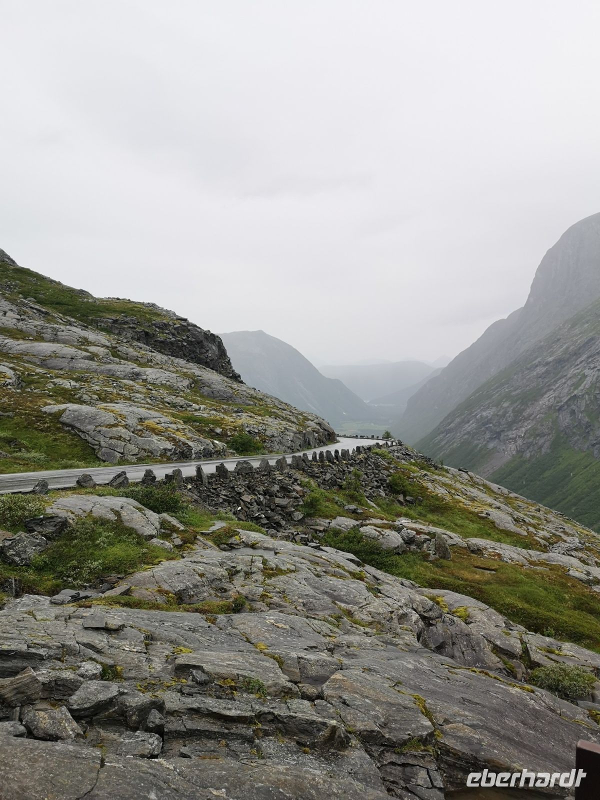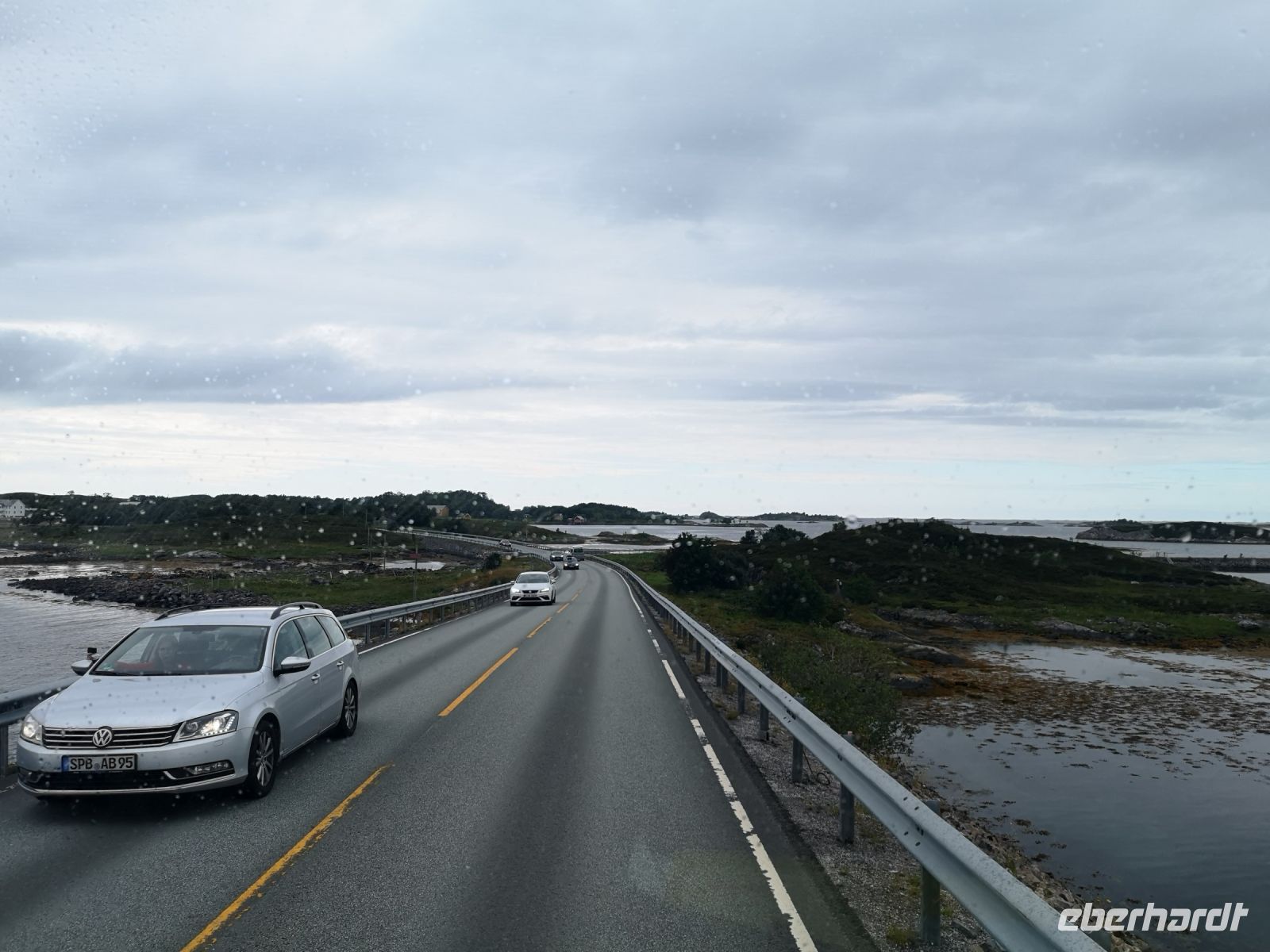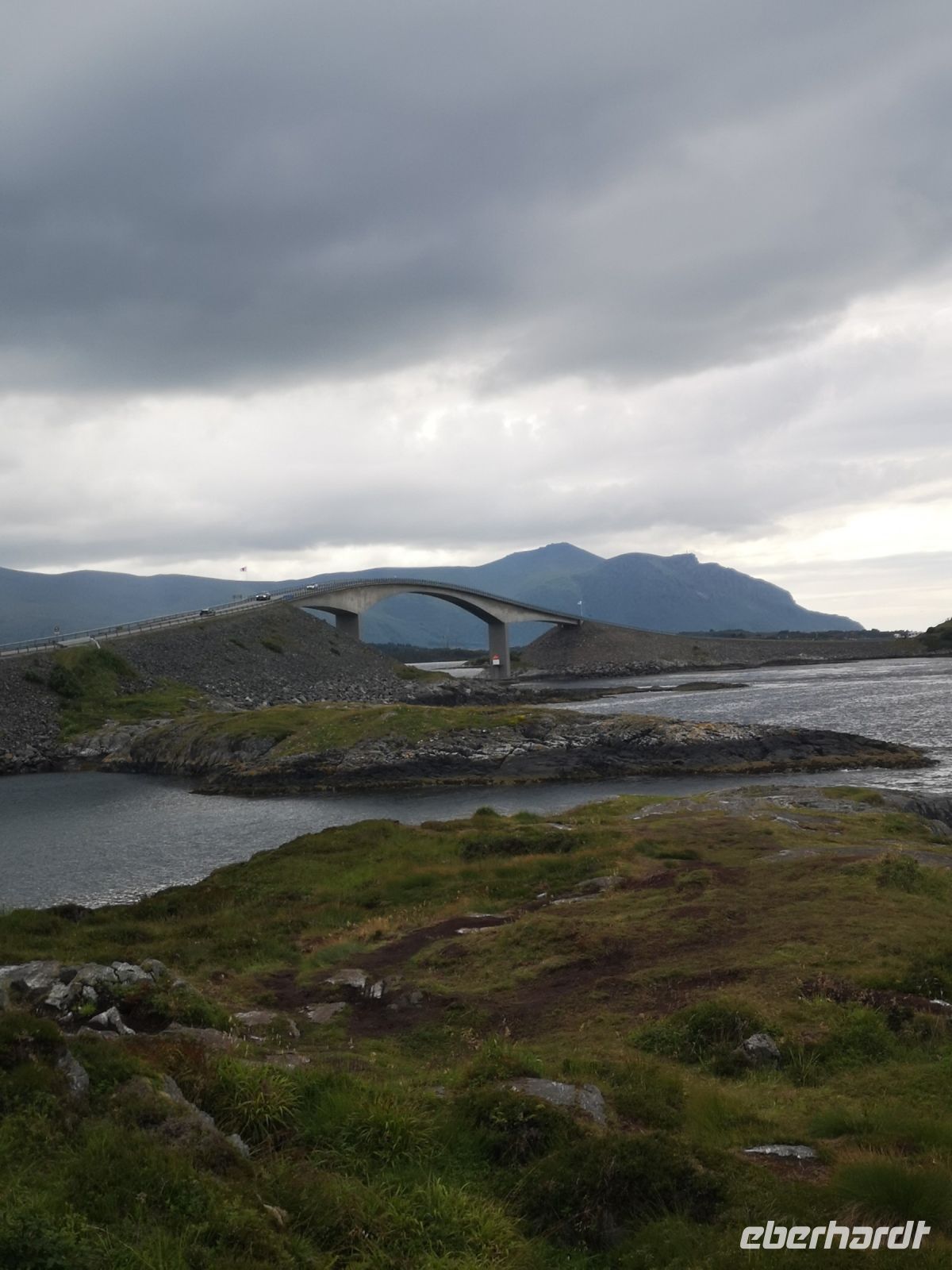 Kurzer Stopp in Kristiansund, ein obligatorischer Besuch beim Klippfischweib und dann weiter der Atlantikstrasse entgegen. Harald Schönhaar konnte sich damals in seinem Traum nicht vorstellen, was einmal die Menschenmengen so anziehen wird. Schlängelnd über das Schären und Inselchen, und wenn man eine oder die andere Pause macht und sich die kleinsten Ornamente der Natur anschaut, dann bietet die Straße eine unheimliche Freude und Bewunderung. Und noch die Storseisundbrua: was James Bond kann, das können wir auch ??.