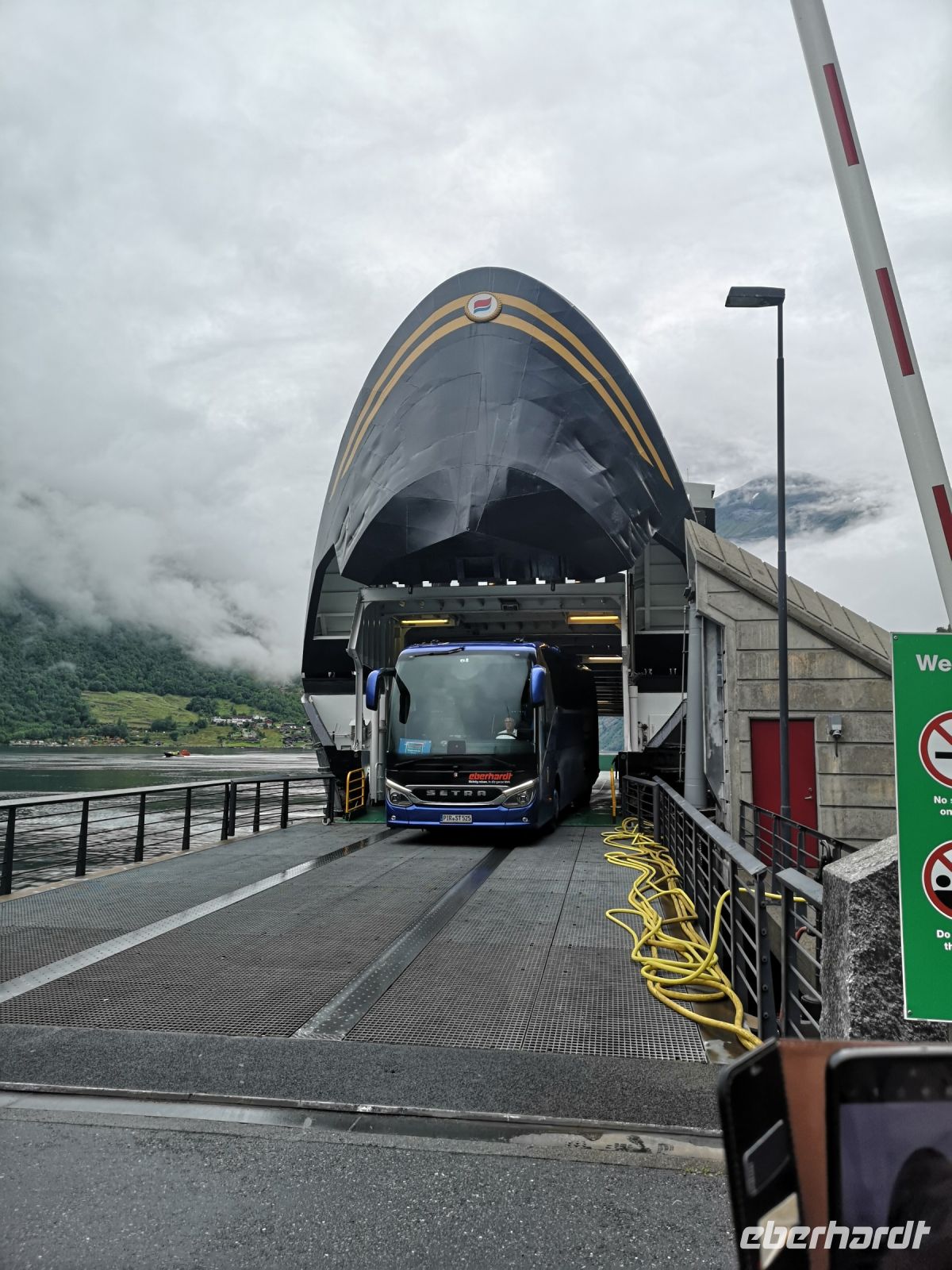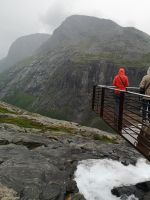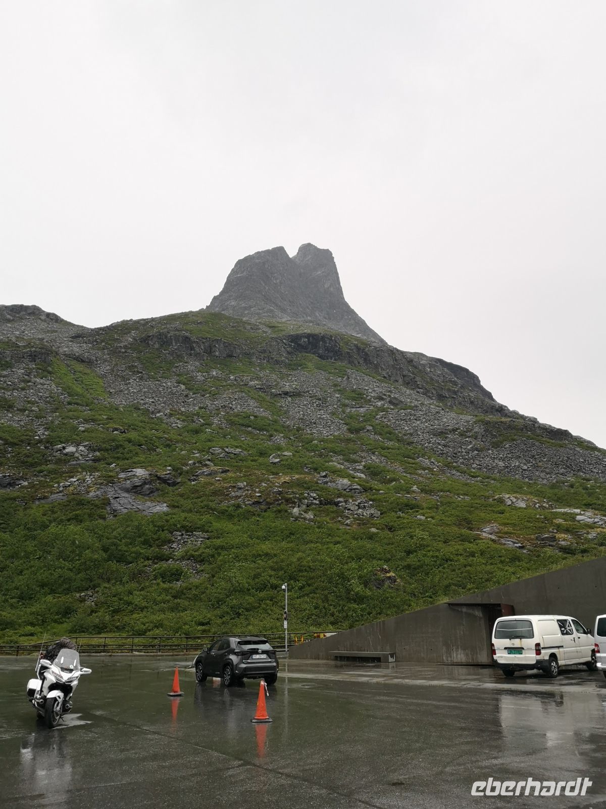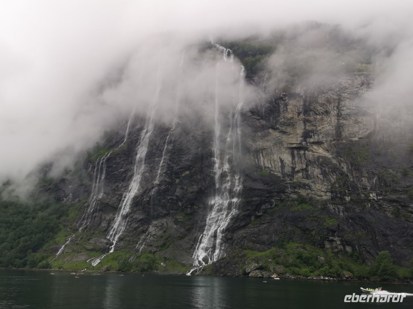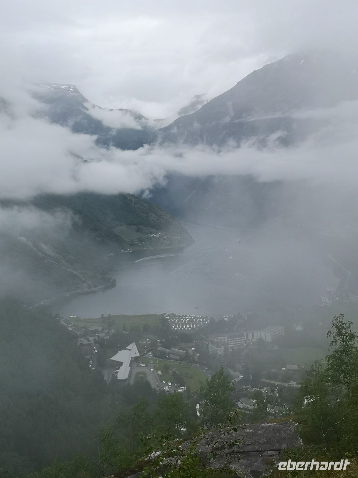 Schon von weiten sah ich die Nebelschwaden tief über dem Geiranger Ort hängen. Flydalsjuvet war nicht zu erkennen. Ich hatte es mir so gewünscht, meinen Gästen den wunderschönen Blick über die Ortschaft und den Fjord zu bieten, aber die Hoffnung darauf schwand mit jedem Meter, den wir hoch auf der Geirangerstrasse geschafft haben. „Na ja, zumindest Königin Sonja´s Stuhl musste man sehen“ habe ich mir gedacht, aber siehe mal, ein Wunder: die Nebelschwaden rissen für einigen Minuten auf und der Fjord präsentierte sich vor unseren Augen in aller Pracht. Ob man dieselbe große Freude und Dankbarkeit verspüren würde, wenn man die ganze Zeit nur ein schönes Wetter gehabt hätte?