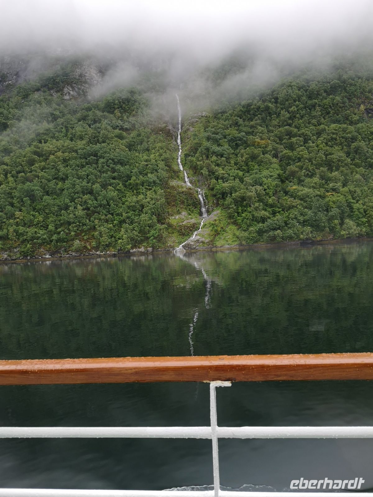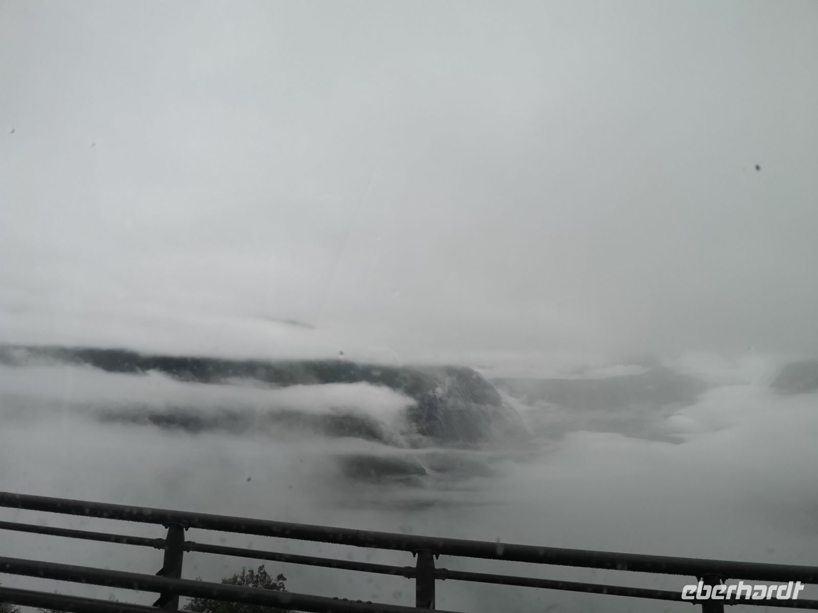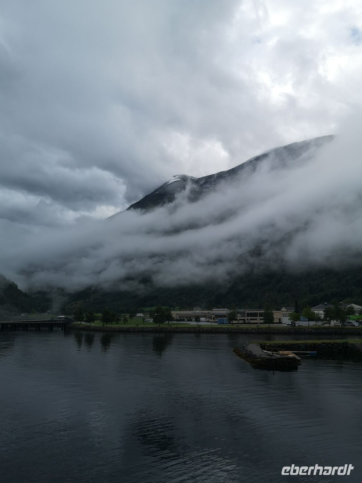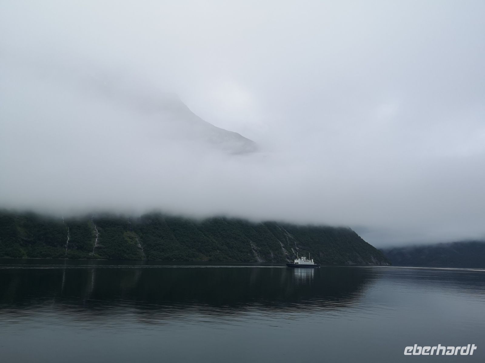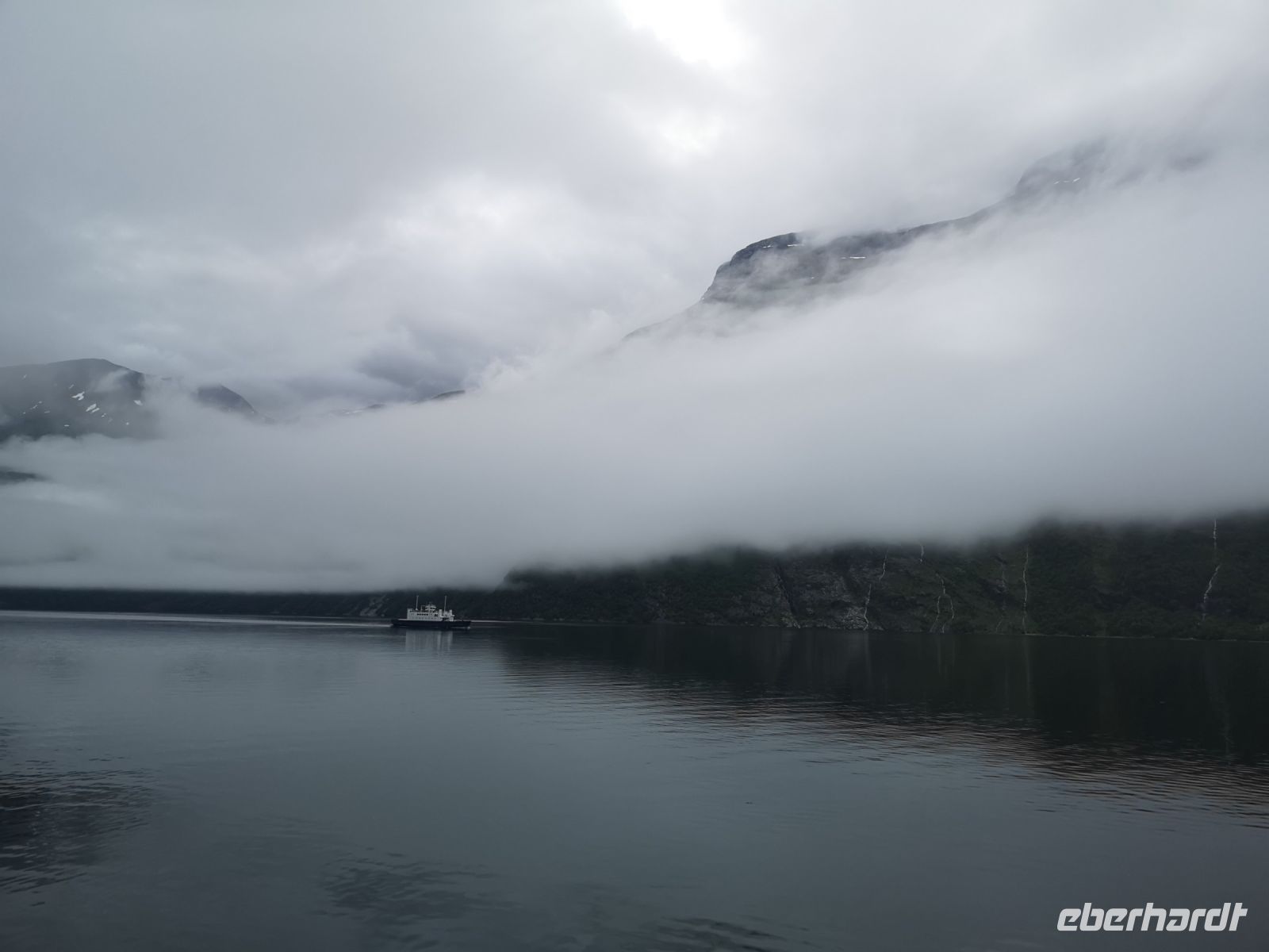 Trolliges Wetter – wie soll auch anders sein – wir sind im Land der Trolle. Wenn es bei der Abfahrt in Alesund noch regnete, verwehrten uns später die Wolken den Blick auf die Umarmung von 2 Fjorden: Sunnylyvenfjord/Geirangerfjord. Auch am Geirangerfjord hingen die Regenwolken ganz tief über dem Wasser – das ganze wirkte ziemlich mysteriös und wunderschön zugleich. Ich denke, kein Gast blieb emotional bei dieser Fahrt mit der Fähre von Hellesylt nach Geiranger unberührt.