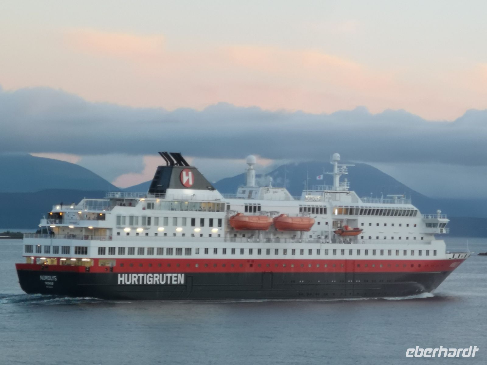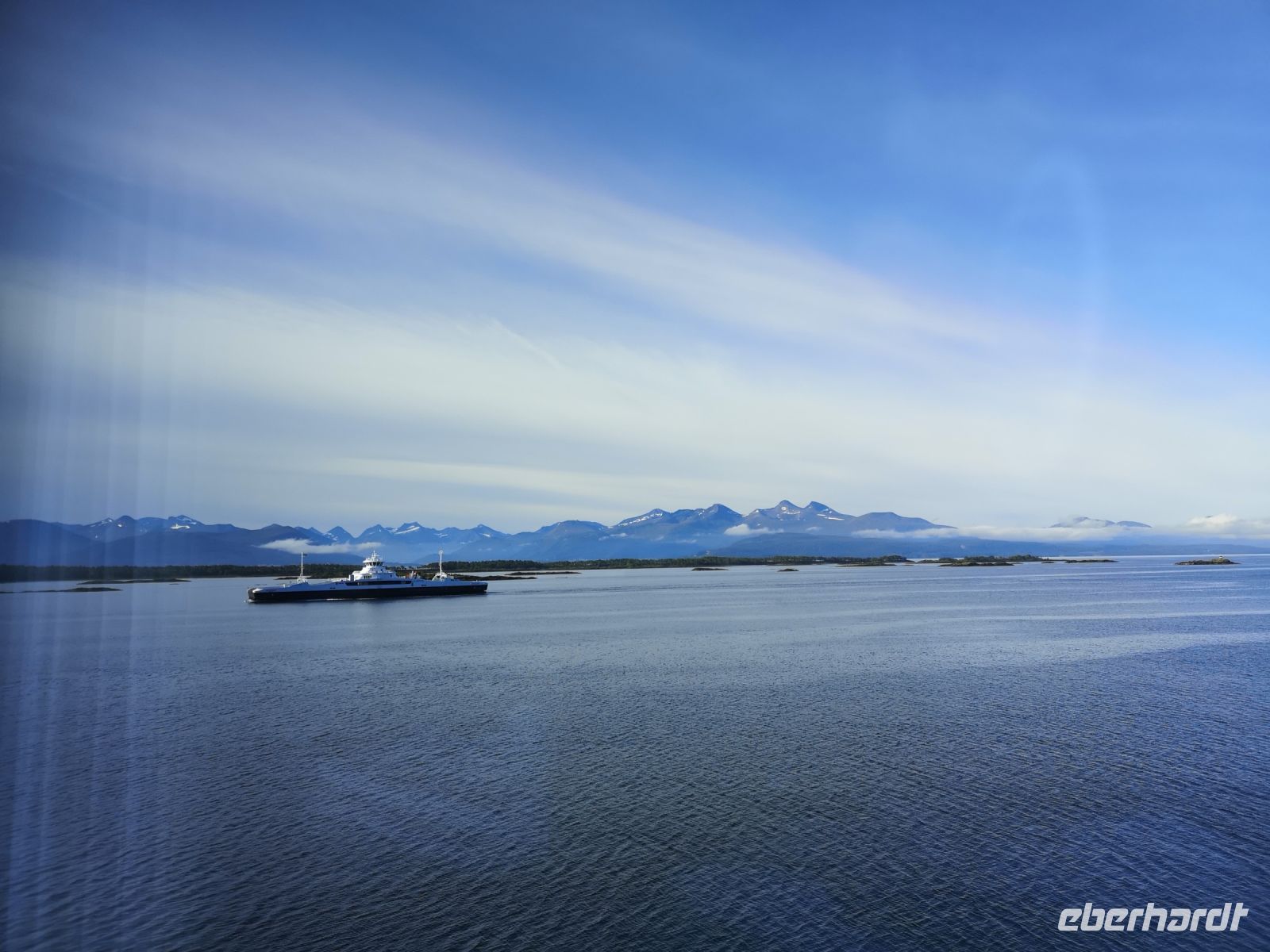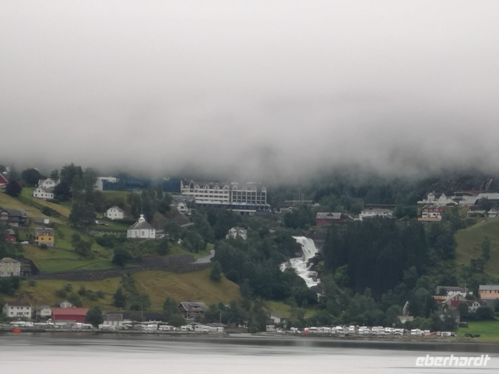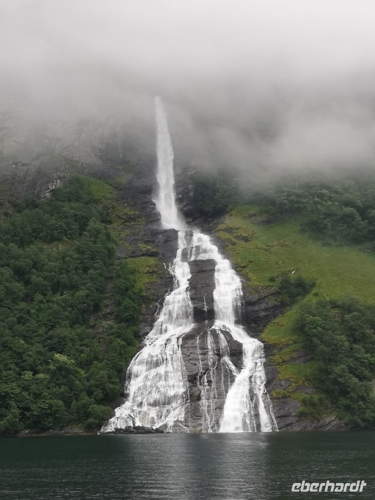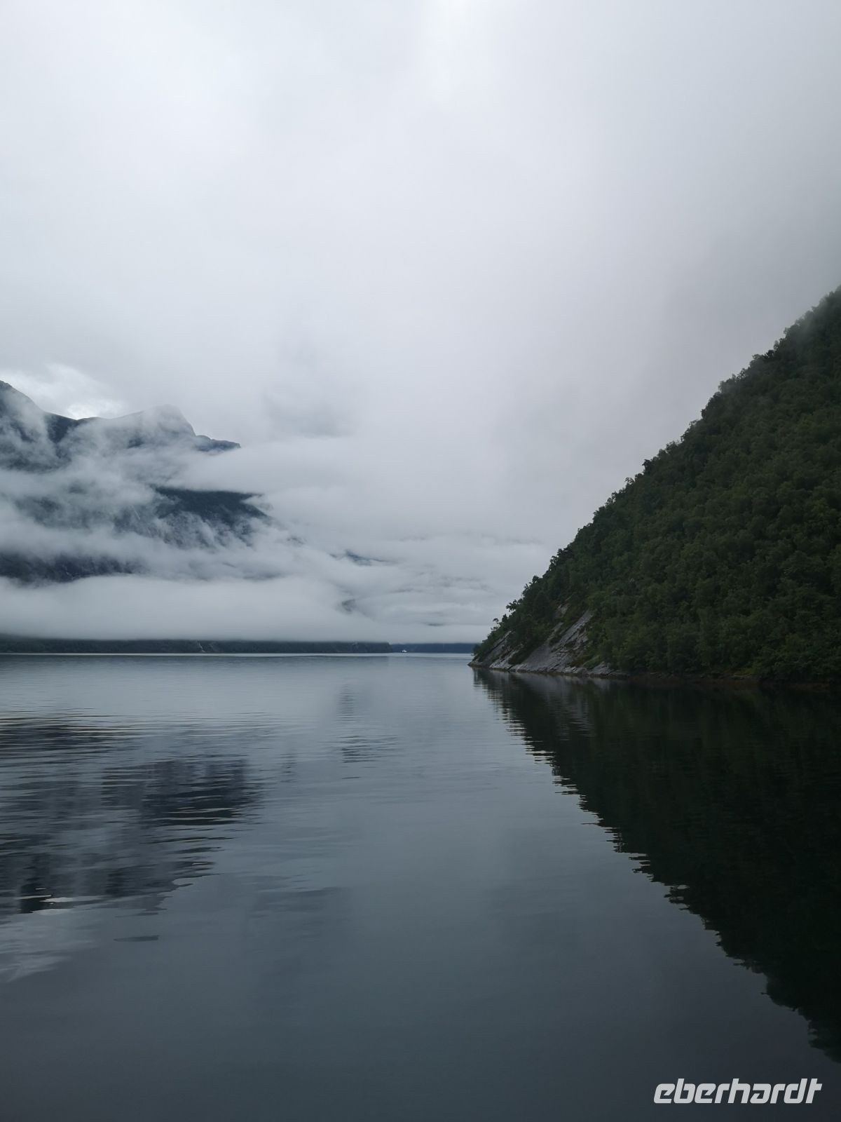 Trolliges Wetter – wie soll auch anders sein – wir sind im Land der Trolle. Wenn es bei der Abfahrt in Alesund noch regnete, verwehrten uns später die Wolken den Blick auf die Umarmung von 2 Fjorden: Sunnylyvenfjord/Geirangerfjord. Auch am Geirangerfjord hingen die Regenwolken ganz tief über dem Wasser – das ganze wirkte ziemlich mysteriös und wunderschön zugleich. Ich denke, kein Gast blieb emotional bei dieser Fahrt mit der Fähre von Hellesylt nach Geiranger unberührt.