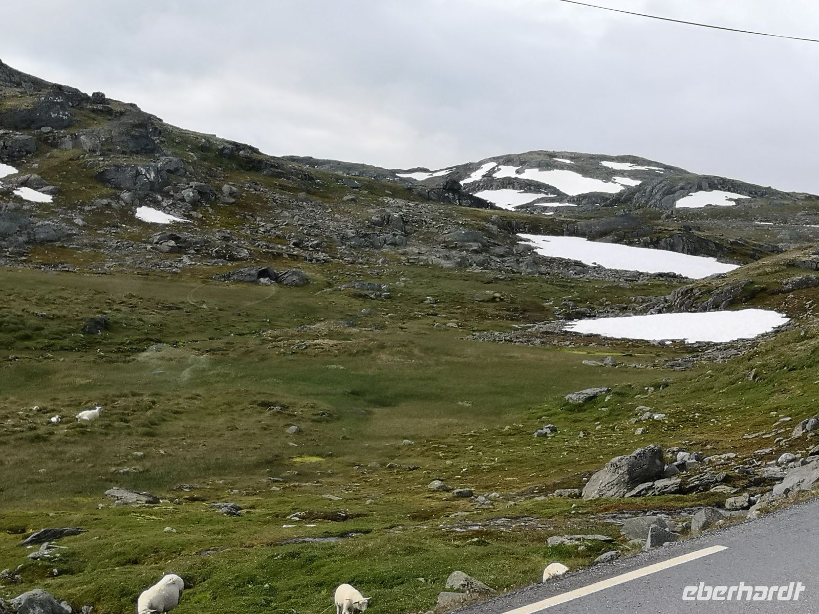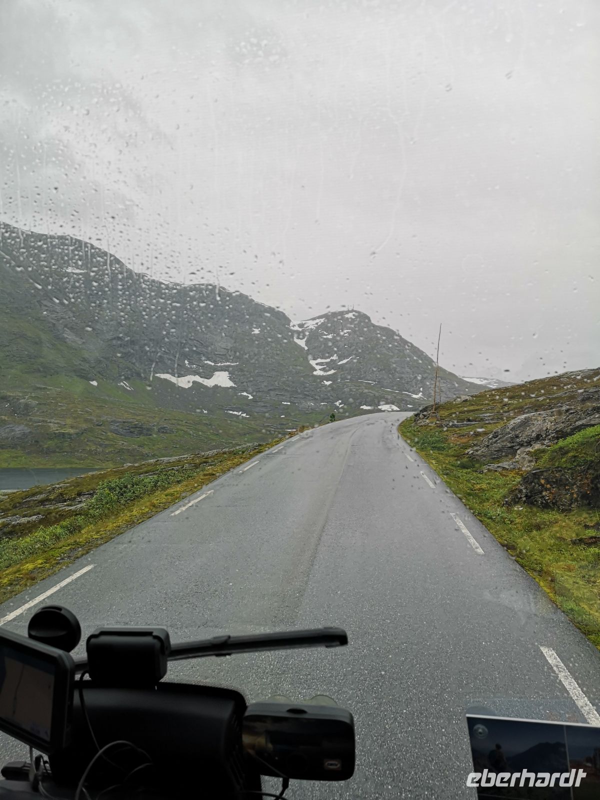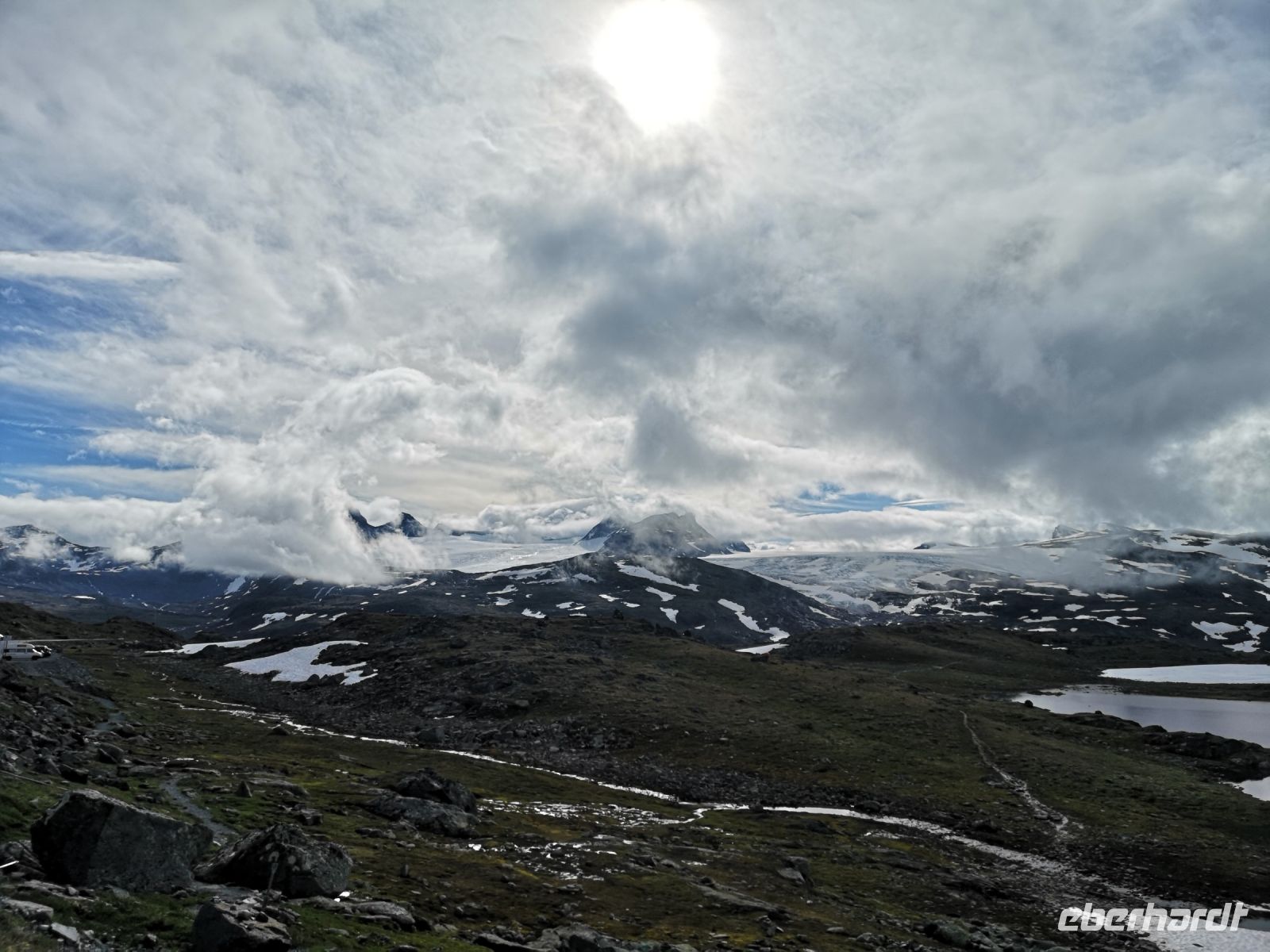 Schaute der Anfang dieser Welt, dieser Zeit, dieser Erde so aus? Berge, Schnee, Gletscher, Bergseen…… Man würde sagen: Fifty Shades of blue and grey, verziert durch einzelne Sonnenstrahlen. Das ist Sognefjell, ein Teil Jotunheimens, des Landes der Riesen (und Trollen…) Rauh, riesig, gewaltig, weit und hoch…… Die Fahrt dadurch ist wahrlich ein Erlebnis per se.