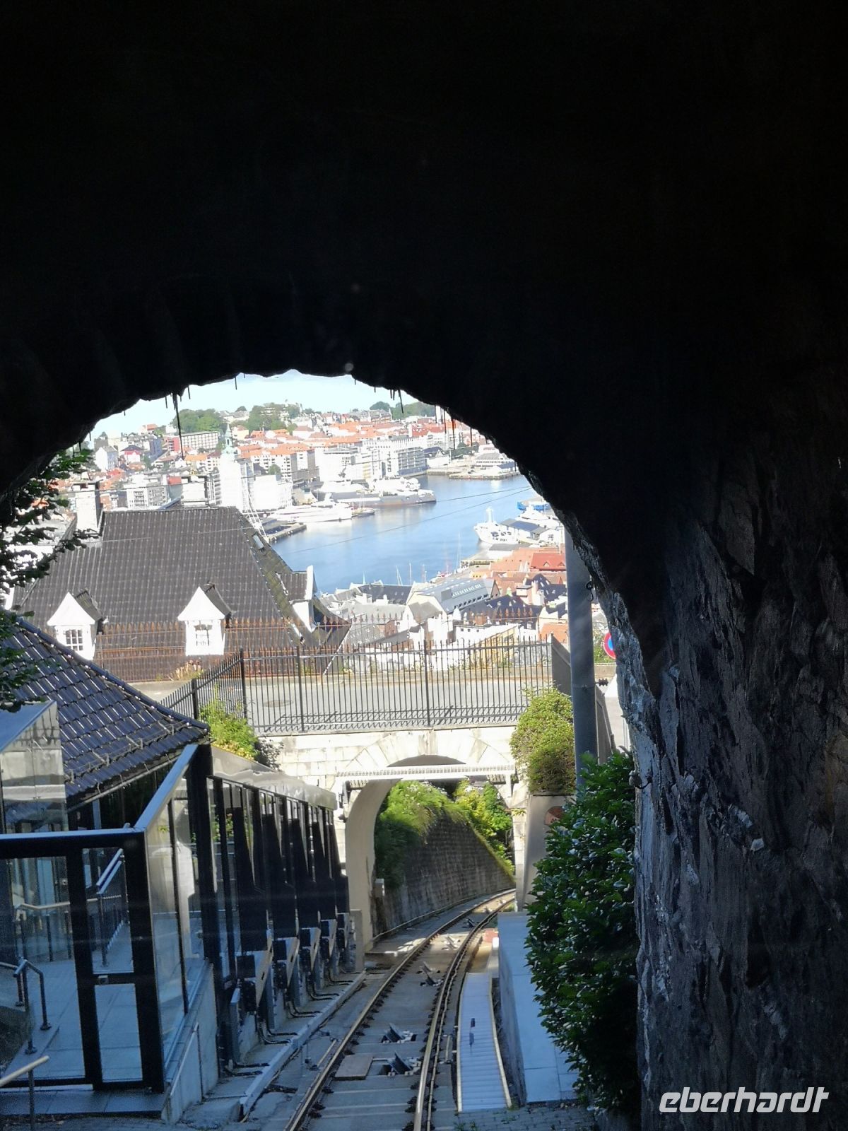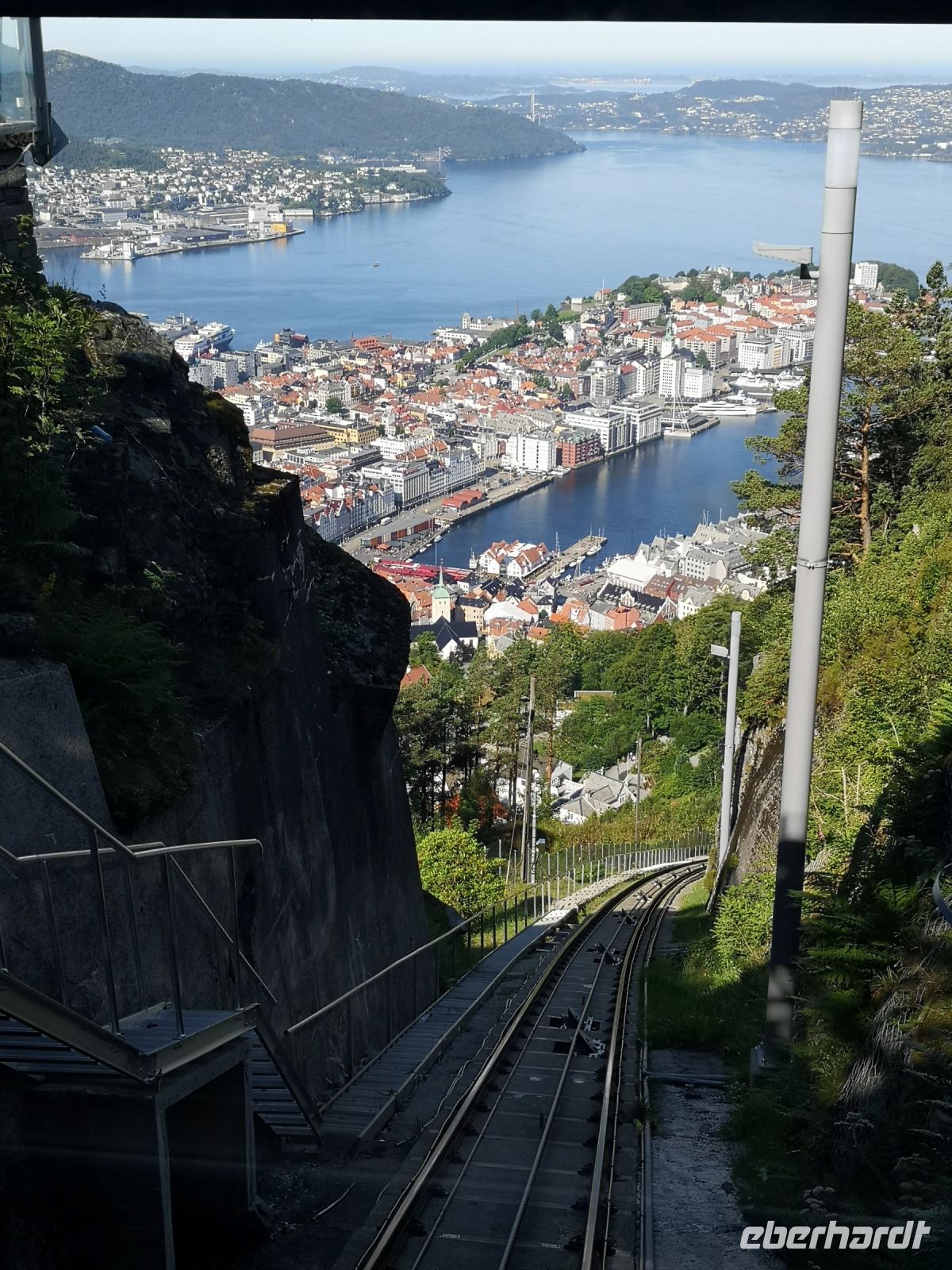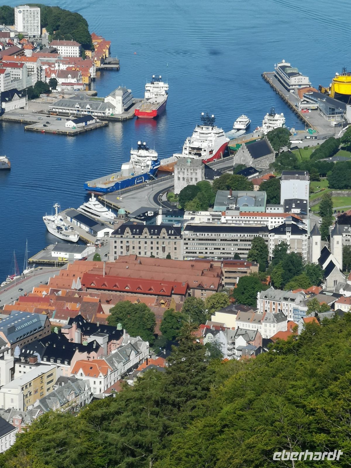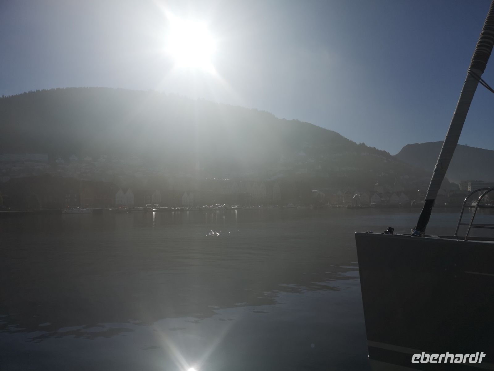 In Flam angekommen verspürten wir zum ersten Mal, was eine touristische Saison bedeutet – im schmalen Hafen lag ein Kollos von einem Kreuzfahrtschiff – natürlich brachte er auch die Mengen von Menschen mit, die sich in der kleinen Ortschaft überall verteilen. Ein Gedränge, wohin man ging. Trotzdem kann man das Flair des Dorfes wahrnehmen, wo eine Fahrt mit der Flambahn nach Myrdal und weiter nach Bergen oder mit einem Schiff über den Naeroyfjord beginnt. Aber unsere ging weiter mit dem trauten Bus und unserem Andreas nach Bergen. Ein obligatorischer Stopp am imposanten Tvindefoss, weiter der E16 entlang durch Dale mit den berühmten Strickwarenhersteller Dale of Norway und nach unzähligen Tunneln bei schönem Wetter nach Bergen angekommen. Das ist wie ein 6er im Lotto. Schönes Wetter in der Stadt, wo Regen samt all seinen Kindern daheim ist. Es wäre fast eine Sünde, die Stadt am Abend nicht zu erkundigen.