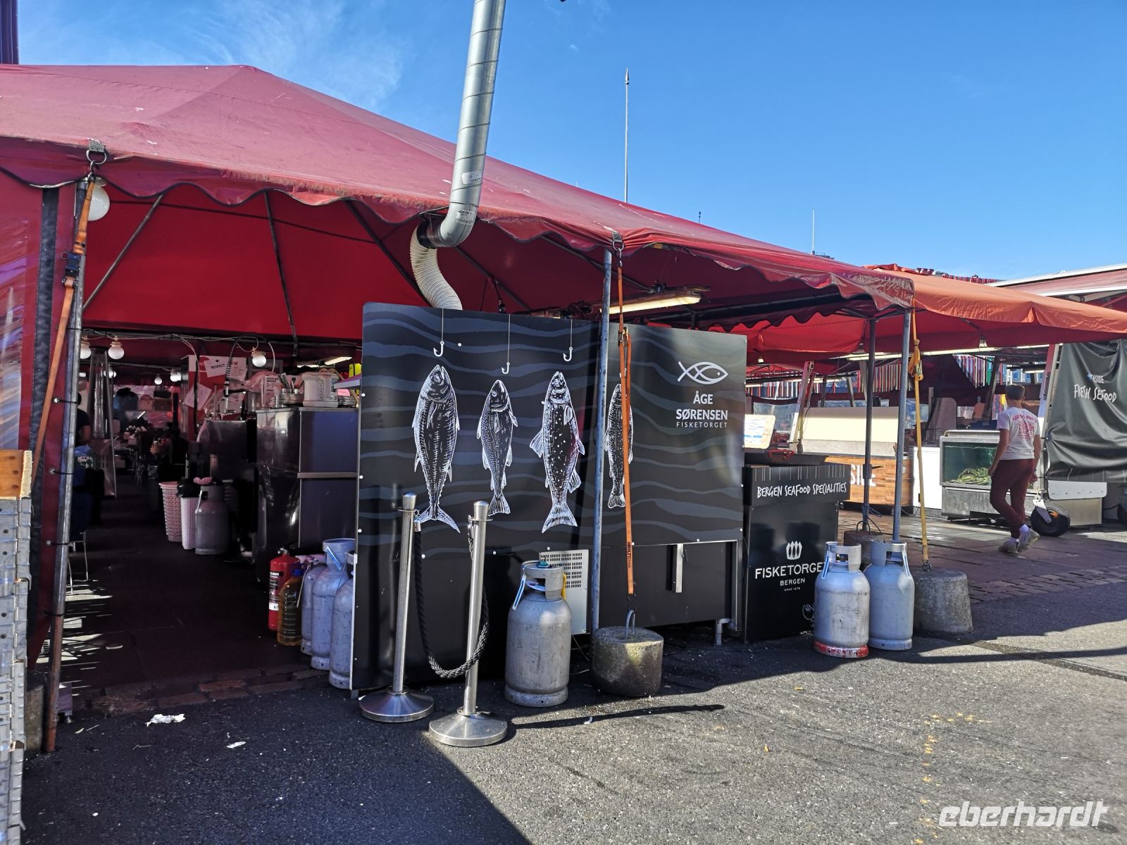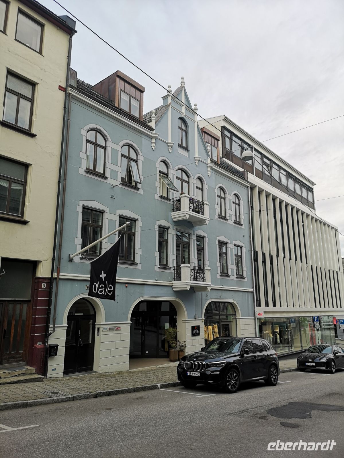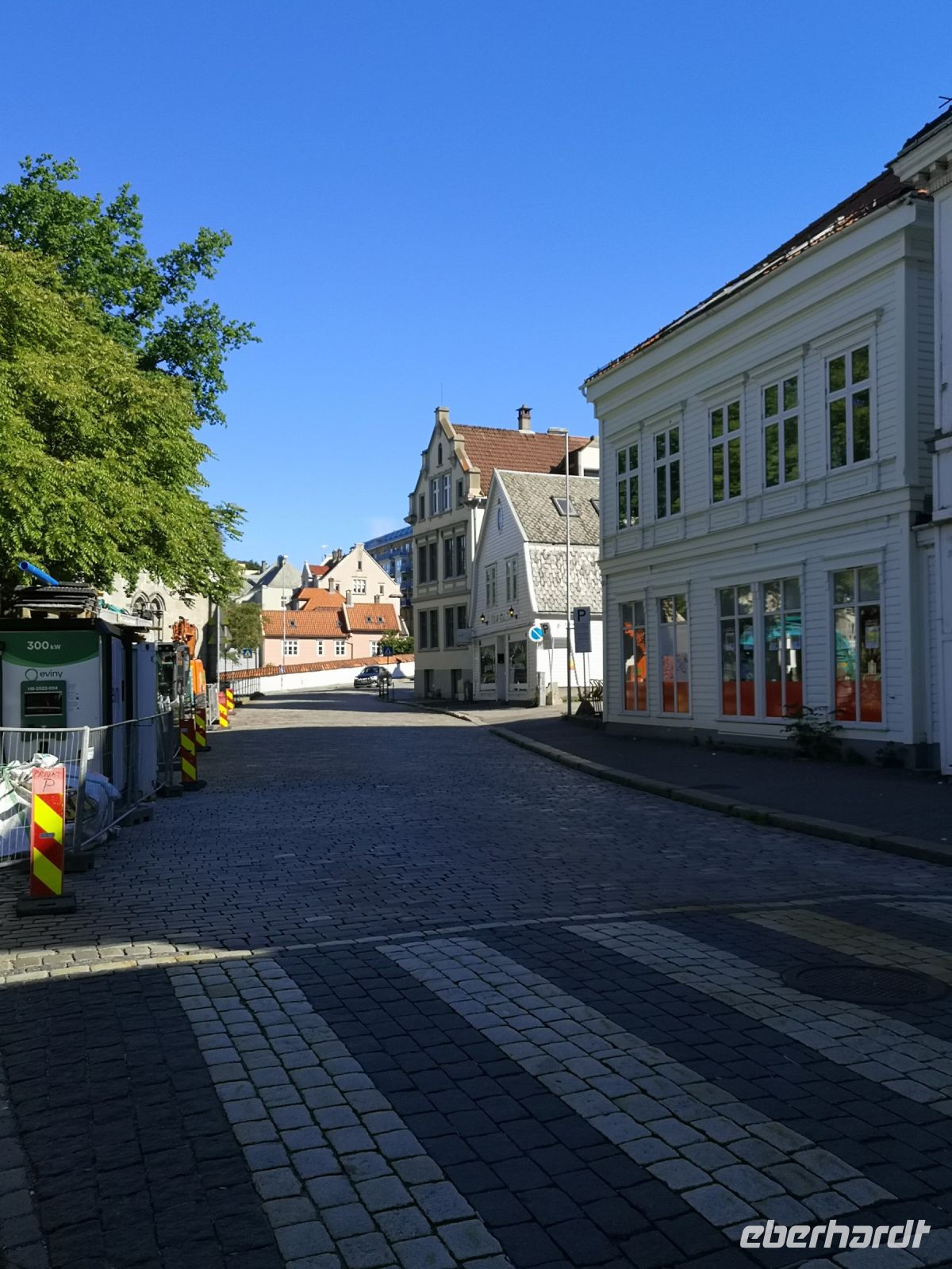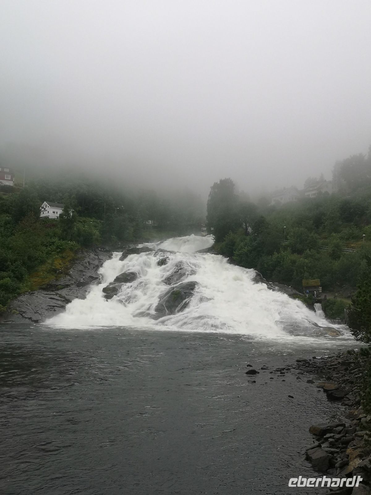 In Flam angekommen verspürten wir zum ersten Mal, was eine touristische Saison bedeutet – im schmalen Hafen lag ein Kollos von einem Kreuzfahrtschiff – natürlich brachte er auch die Mengen von Menschen mit, die sich in der kleinen Ortschaft überall verteilen. Ein Gedränge, wohin man ging. Trotzdem kann man das Flair des Dorfes wahrnehmen, wo eine Fahrt mit der Flambahn nach Myrdal und weiter nach Bergen oder mit einem Schiff über den Naeroyfjord beginnt. Aber unsere ging weiter mit dem trauten Bus und unserem Andreas nach Bergen. Ein obligatorischer Stopp am imposanten Tvindefoss, weiter der E16 entlang durch Dale mit den berühmten Strickwarenhersteller Dale of Norway und nach unzähligen Tunneln bei schönem Wetter nach Bergen angekommen. Das ist wie ein 6er im Lotto. Schönes Wetter in der Stadt, wo Regen samt all seinen Kindern daheim ist. Es wäre fast eine Sünde, die Stadt am Abend nicht zu erkundigen.