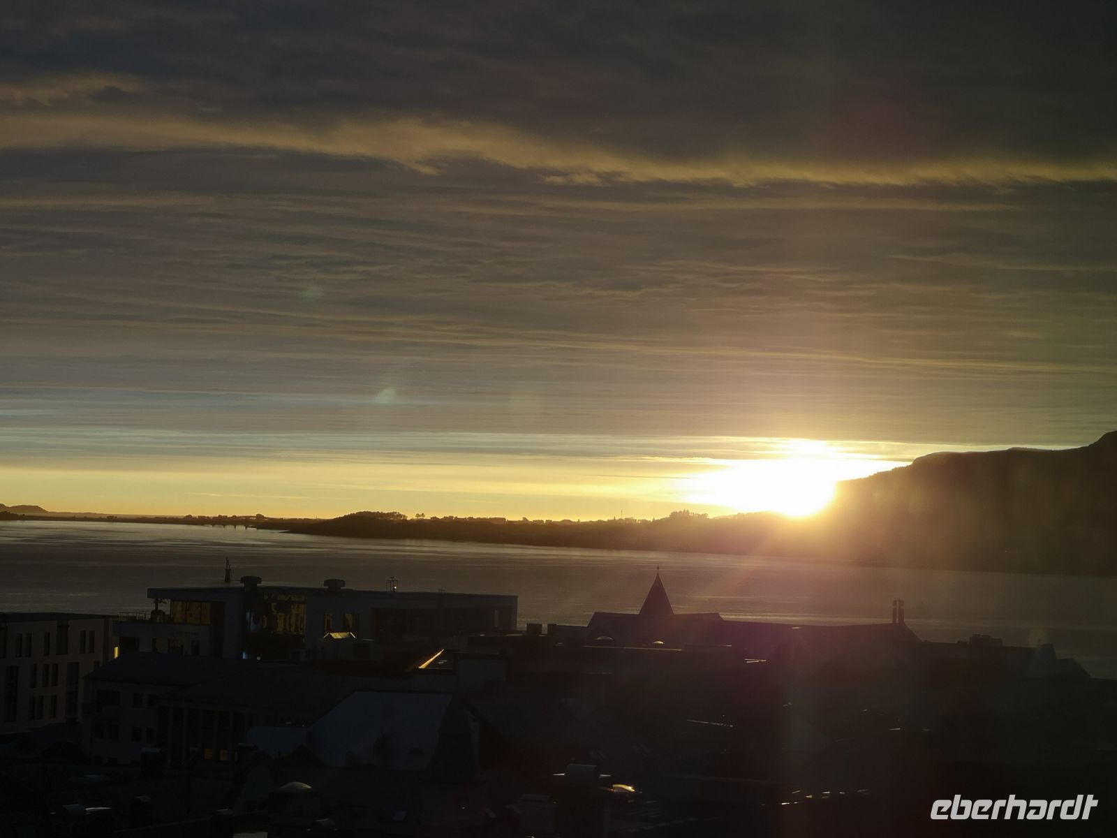 Unser heutiges Quartier ist das Sailet Hotel in Molde, direkt am Meer. Es bot uns alles, was man sich so wünscht – gutes Essen, schöne Zimmer und ein bezaubernden Sonnenuntergang, für kurze Zeit, natürlich. Und ja, den Hof teilt sich das Hotel mit dem Aker Fußballstadion. Wieder eine Pilgerstätte für die Fußballfans……….