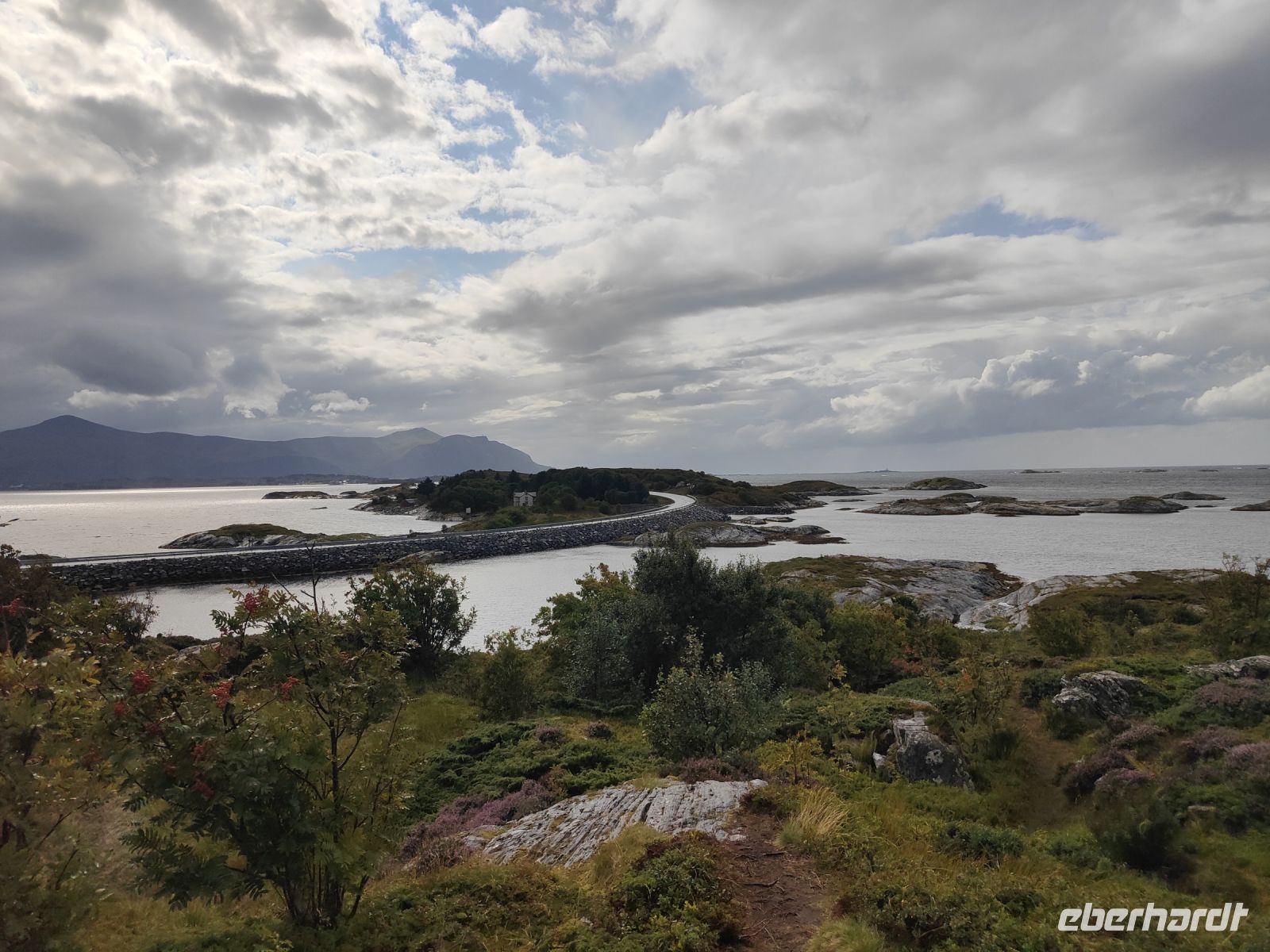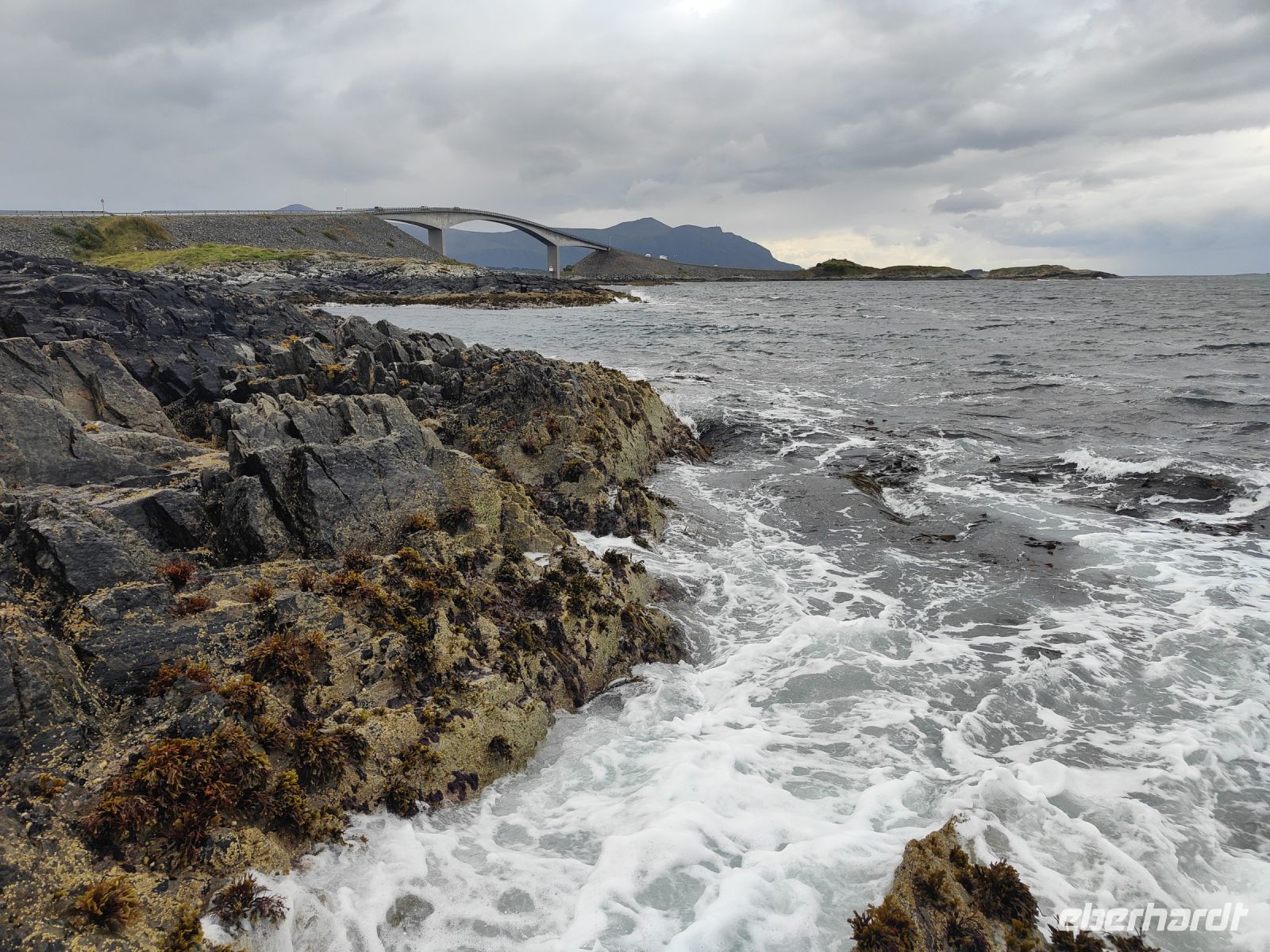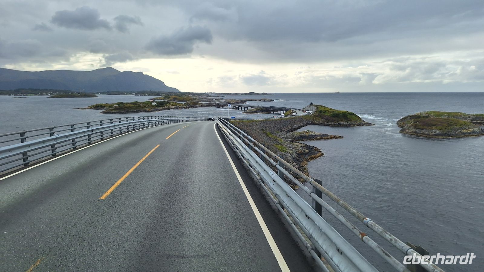 Auf der Reichsstraße 64 fahren wir nun weiter in Richtung Molde und erreichen dann die spektakuläre Atlantikstraße. Der „Atlanterhavsvegen“ genannte Straßenabschnitt ist zwar kaum 10 Kilometer lang, führt dabei aber über 12 verschiedene Brücken und Dämme, die kleine Inseln miteinander verbinden. Kein Wunder, dass diese, wenn auch kurze, Strecke zu einer der schönsten Panoramastraßen Norwegens gehört. Nach einem kurzen Fotostopp auf der Insel Håholmen nach wir dann auf Eldhusøya eine längere Pause. Hier kann man zu Fuß auf einem Rundweg um die Insel herumlaufen, und die beeindruckenden Brückenkonstruktionen in Ruhe bestaunen. Anschließend fahren wir dann natürlich noch weiter und überqueren die Brücken mit unserem Reisebus - es ist nicht zu verläugnen, dass auch Jan ziemlich großen Spaß daran hat.