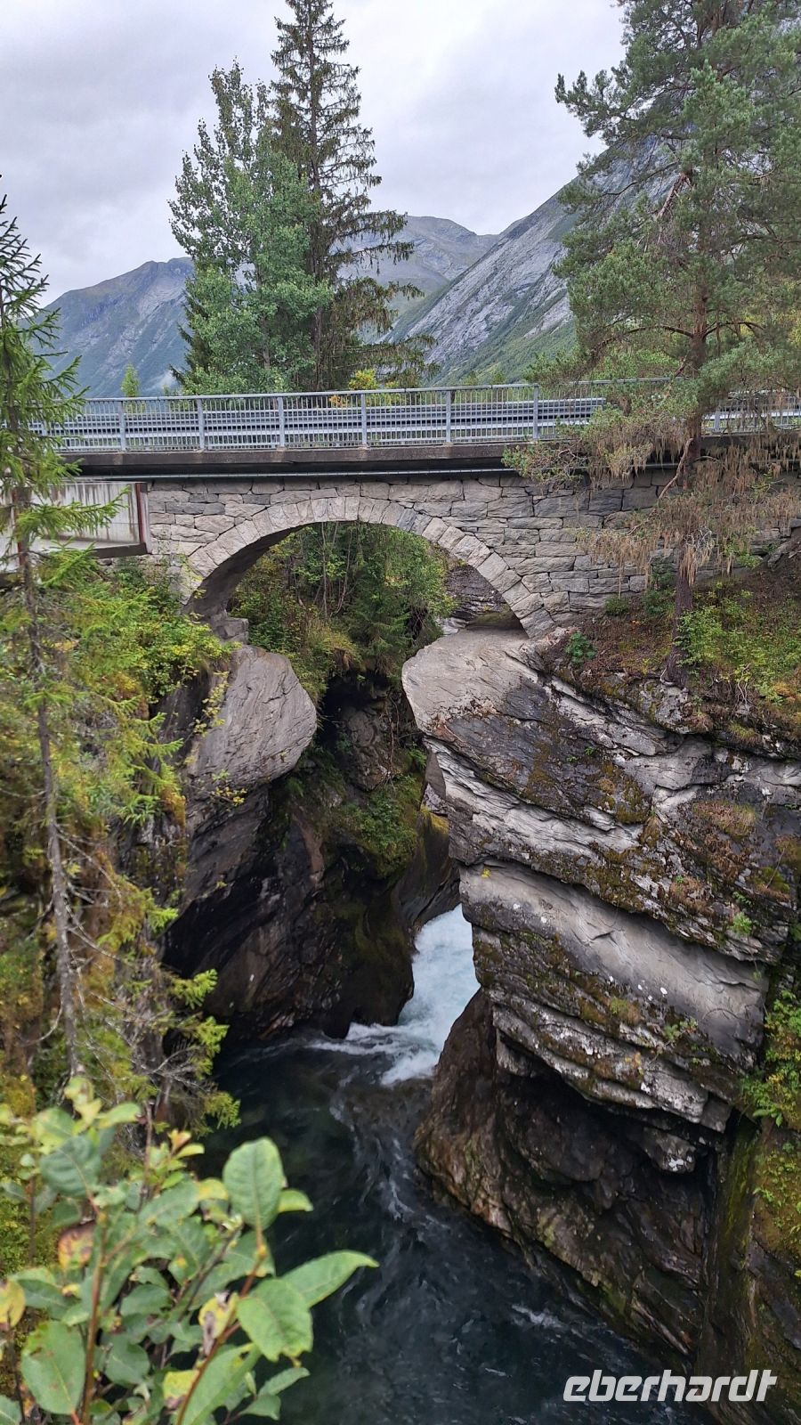 Auf der Rückfahrt nach Valldal legen wir einen Stopp ein an der Gudbrandsjuvet, einer 20 bis 25 Meter breiten Schlucht, die der Fluss Valldøla hier gegraben hat und in die er sich nun mit lautem Getöse stürzt.