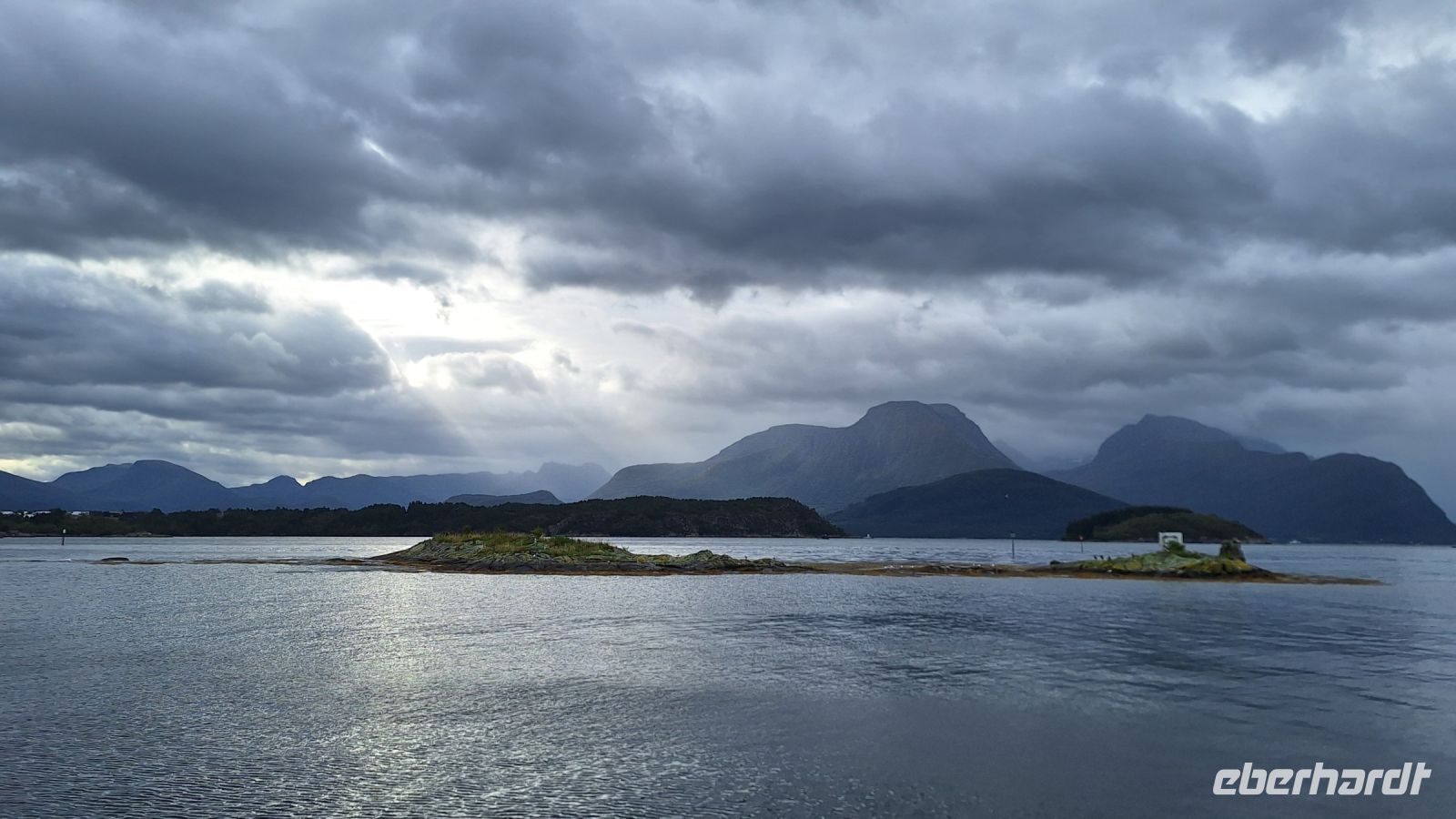 Als wir den 86 Kilometer langen Hauptarm des Storfjords verlassen und auf den Sunnylvsfjord einbiegen, kommt auch die Sonne durch die Wolken gebrochen und zaubert herrliche Lichtspiele.