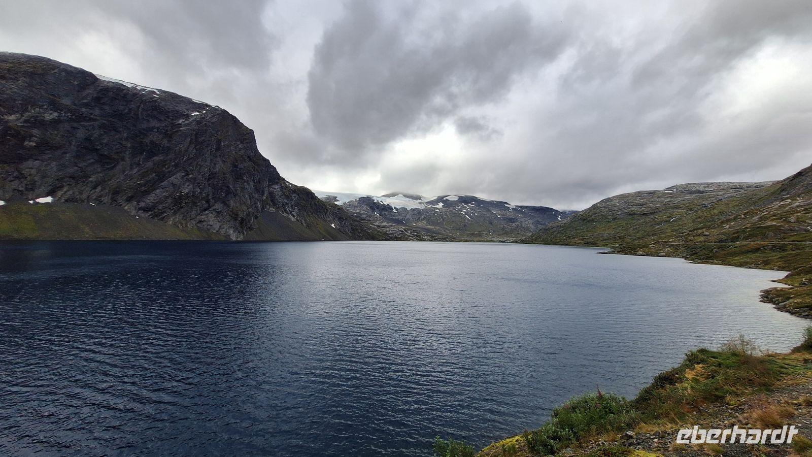 Nach dem Frühstück am nächsten Morgen verlassen wir Elveseter und biegen auf den Sognefjellsveien ab. Die höchstgelegene Passstraße Nordeuropas erreicht an ihrem höchsten Punkt 1434 Meter und wurde zwischen 1936 und 1938 erbaut. Auf 109 Kilometern verbindet sie das Ottatal mit dem Lustrafjord und war essentiell für den Handel zwischen Küstenregionen und Bergland. Obwohl noch ein wenig die Wolken in den Bergspitzen hängen, genießen wir die spektakulären Aussichten auf der Hochebene. Als wir dann später den Lustrafjord, einen Seitenarm des Sognefjords erreichen, kämpft sich langsam wieder die Sonne durch die Wolken. Wir sind hier sage und schreibe 205 Kilometer von der Küste entfernt, damit ist der Sognefjord der längste und mit 1303 Metern auch der tiefste Fjord Norwegens und der zweittiefste der Welt.