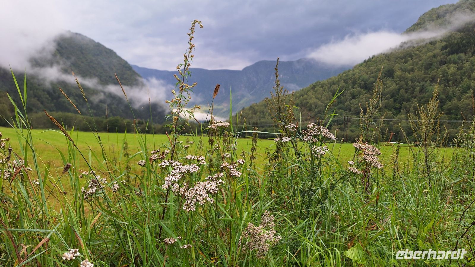 Gegen Mittag erreichen wir das Valldal, die Erdbeerregion Norwegens. Leider hat uns der Nieselregen auch fest im Griff, als wir von Richtung Süden dem Trollstigen-Plateau nähern - denn immerhin kann man die imposante Serpentinenstraße immer noch von oben ansehen.
