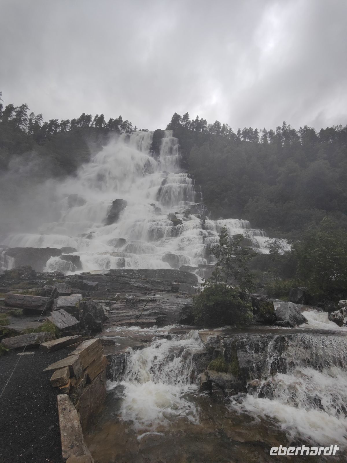 Auf der Weiterfahrt nach Bergen legen wir einen letzten Stopp ein am Wasserfall Tvidefossen. Das Wasser, das hier wie ein Vorhang über eine Felsenkaskade fällt, soll angeblich als Jungbrunnen fungieren - kaum ausgesprochen, sind plötzlich alle ganz schnell aus dem Bus gestiegen und so schnell wie vorher noch nie am Aussichtspunkt.