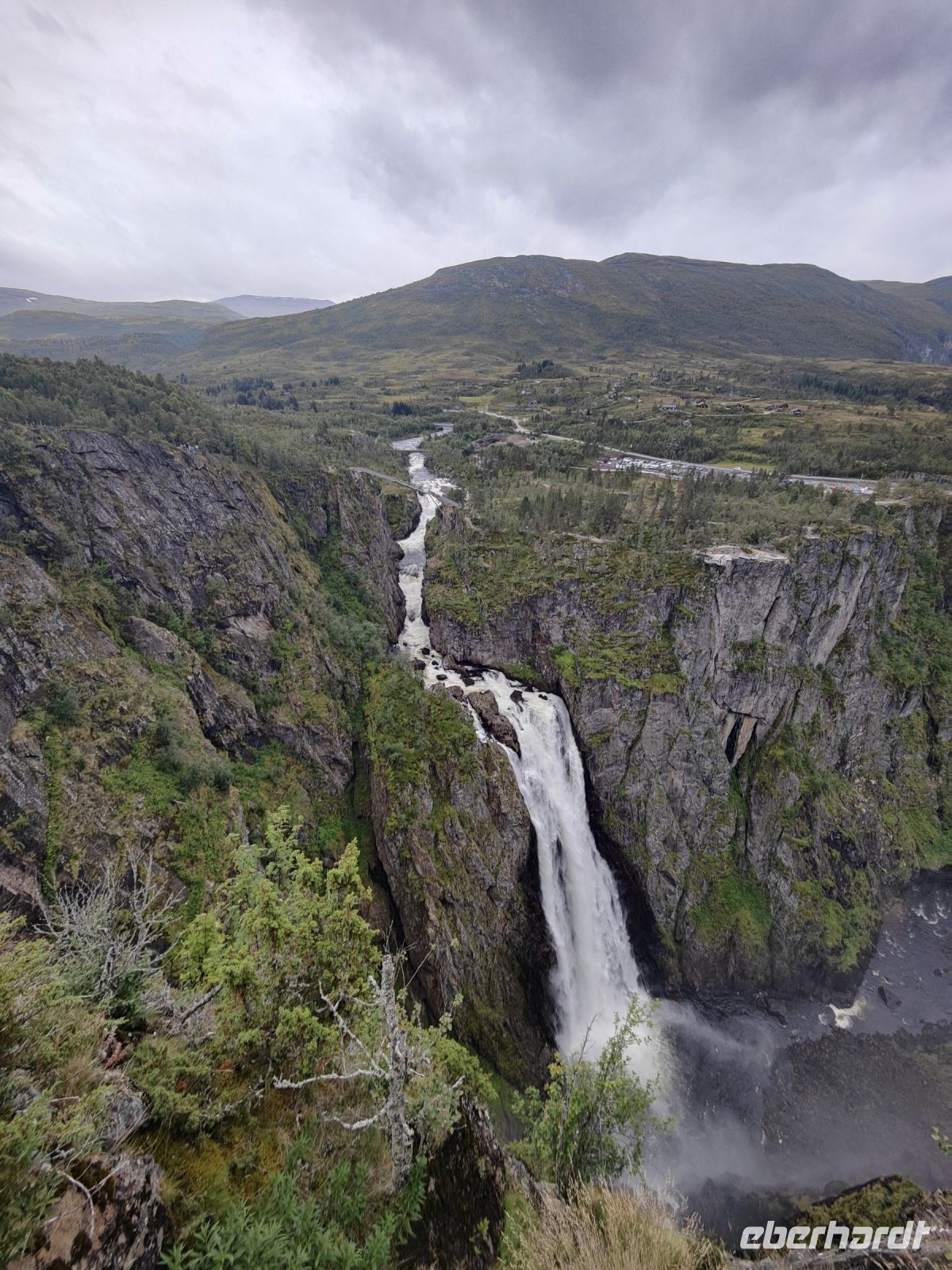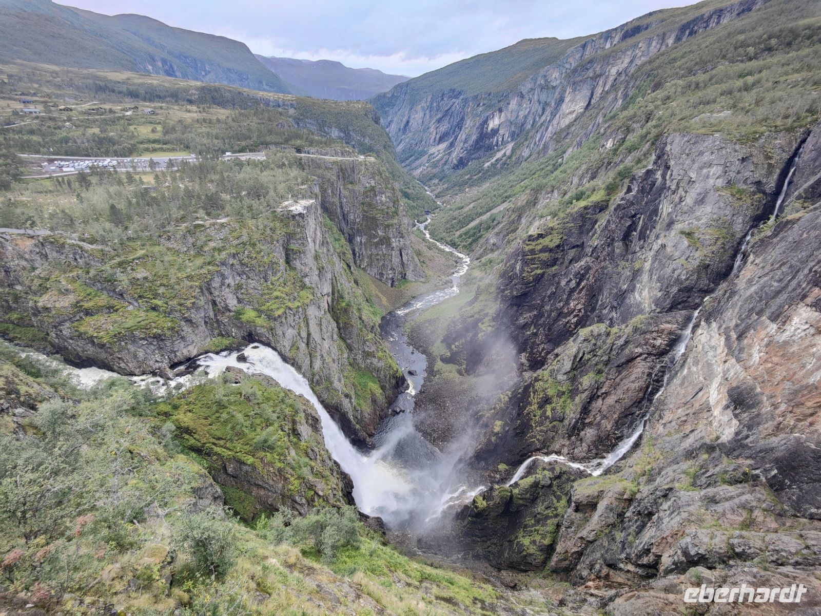 Ein Meisterwerk von Tunnels und einer Brücke stellt die 2013 vollendete Hardangerbrücke dar: durch einen Tunnel mit einem Kreisverkehr(!) gelangt man direkt auf die mächtige Brücke und verlässt sie auf der anderen Seite wiederum durch einen Tunnel mit Kreisverkehr. Beeindruckend. Wir legen mit Blick auf die Brücke unsere Mittagspause ein, bevor es weitergeht in die Hardangervidda. Die größte Hochebene Europas erstreckt sich auf einer Höhe von 1200-1400 Metern über 8000 km². Eine der bekanntesten Sehenswürdigkeiten liegt östlich von Eidfjord und wird durch mehrere Tunnels, die sich in Serpentinen den Berg hinaufschlängeln, erreicht. Der gewaltige Vøringsfossen stürzt hier 183 Meter in die Tiefe, wo der Fluss Bjoreio dann durch eine steilwandige Schlucht Richtung Fjord fließt. Von mehreren Plattformen aus kann man die Aussicht genießen.
