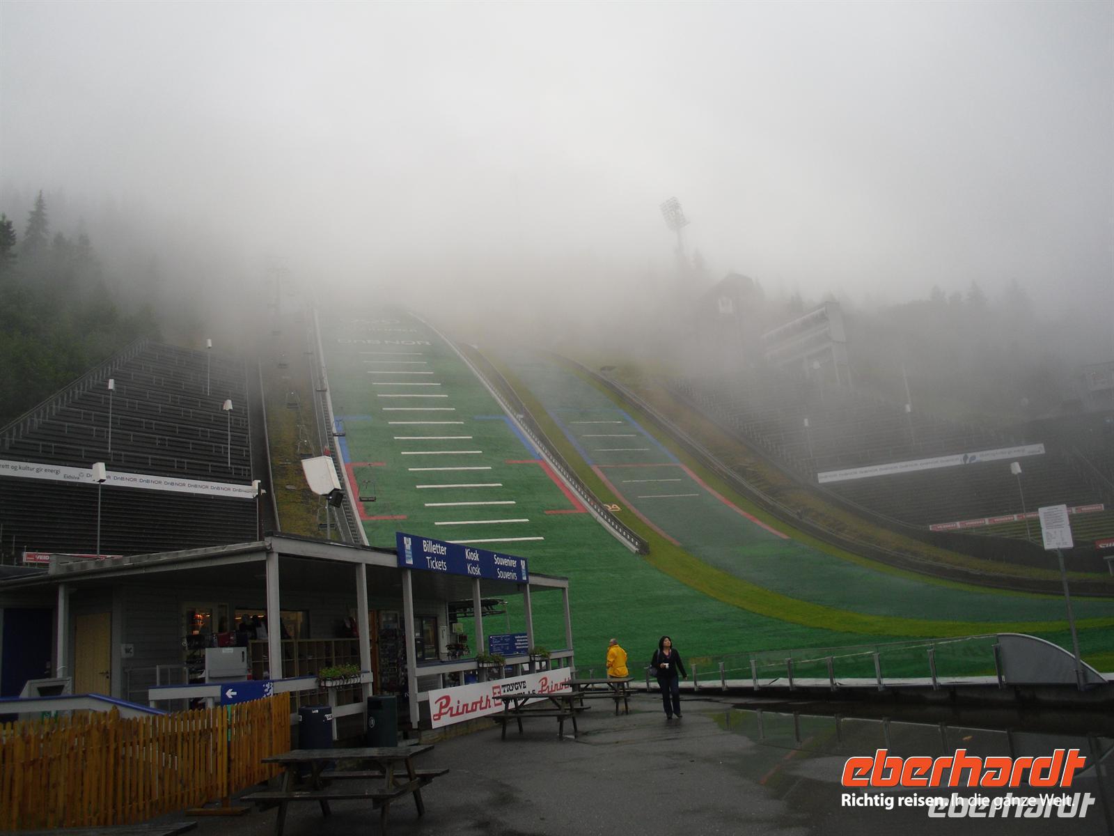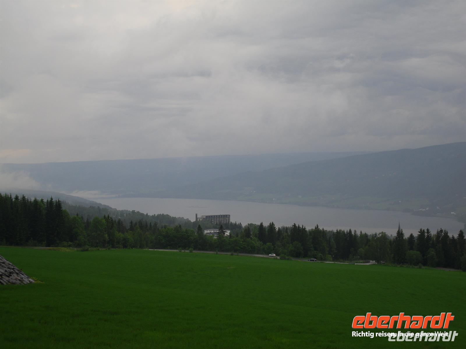 Unser erstes Ziel ist Lillehammer. Die Fahrt dorthin führt uns weiter vorbei am Mjösa-See, dem mit einer Fläche von 362 Quadratkilometern und einer Länge von 117 Kilometern größten See Norwegens. Das Wetter ist zwar nicht gerade berauschend, aber zumindest regnet es nicht, als wir an den Schanzenanlagen von Lillehammer ankommen.