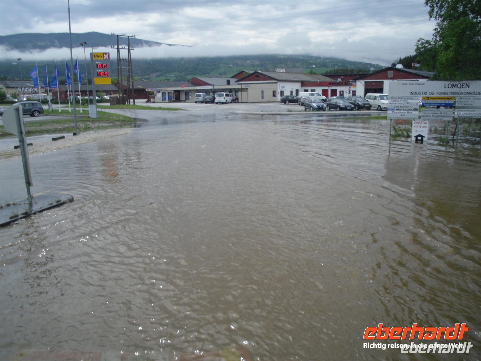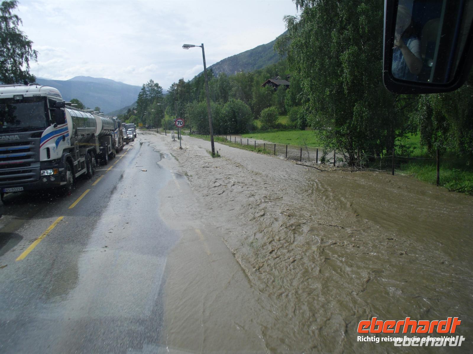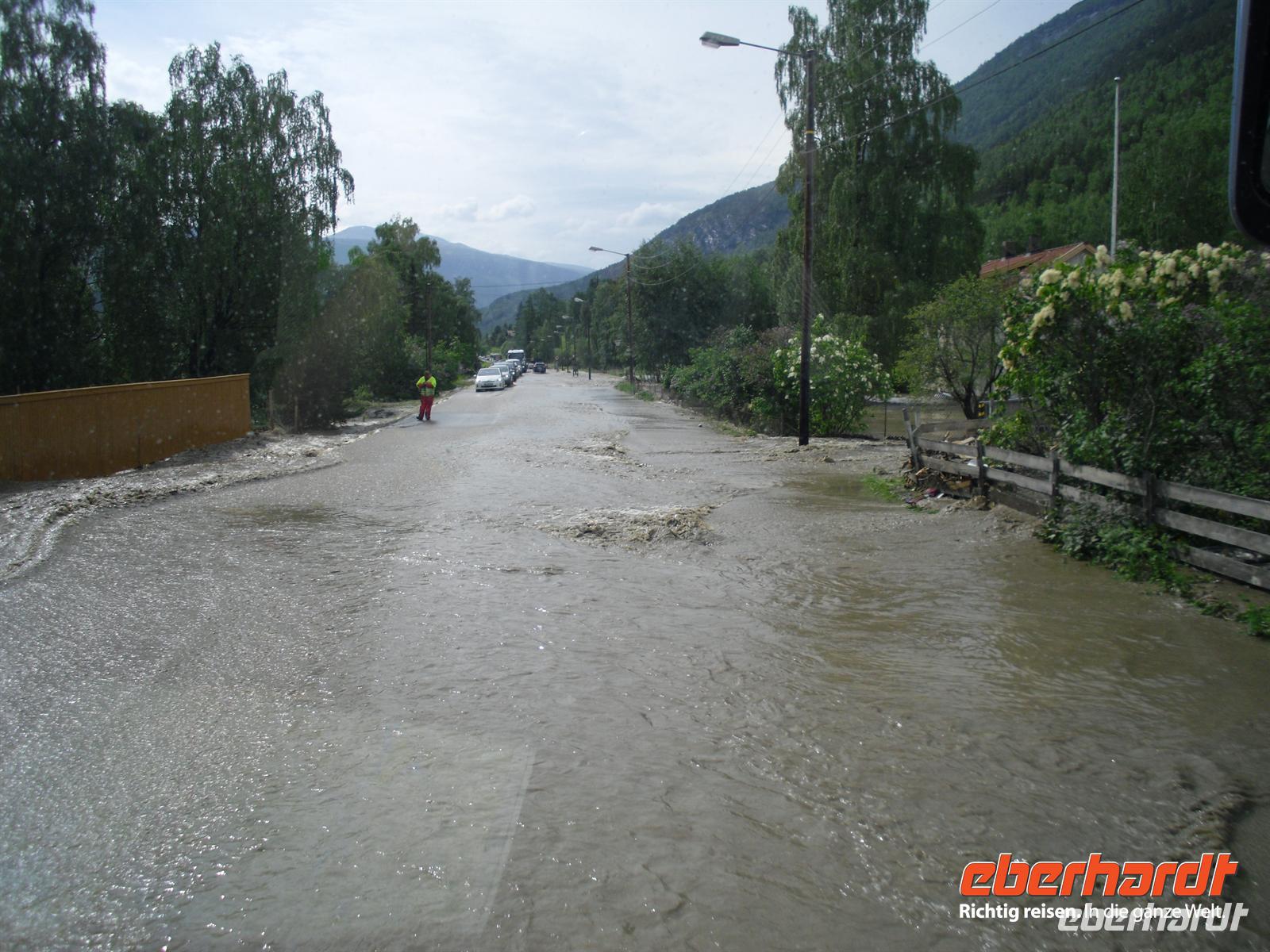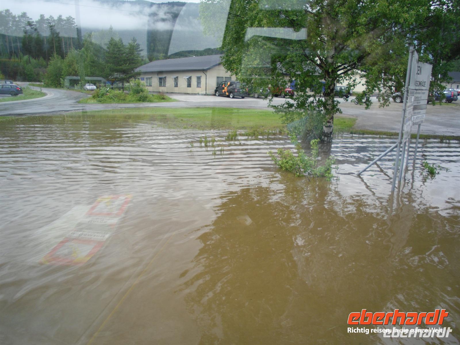 Die Stadt war 1994 Austragungsort der Olympischen Winterspiele und dafür wurden damals zahlreiche neue Sportanlagen errichtet. Anschließend geht es weiter zum Freilichtmuseum Maihaugen. In Maihaugen erleben wir lebendige Geschichte, hier findet man Häuser aus dem Dorf und aus der Stadt vom Mittelalter bis zum heutigen Tag. Im Dorf selbst kann man mit den Bewohnern an der täglichen Arbeit in den 1890er Jahren teilnehmen. Gegen Mittag fahren wir bereits weiter, denn schließlich liegt noch ein weiter Weg bis Trondheim vor uns! Schon wenige Kilometer nördlich von Lillehammer bemerken wir überflutete Wiesen im Gudbrandstal, machen uns aber vorerst noch keine weiteren Gedanken darüber! Gegen 13:00 Uhr ist es dann erstmals vorbei mit unserer landschaftlich beschaulichen Fahrt durch das sogenannte „Tal der Täler“, das vom Fluss Lagen bestimmt wird. Der Lagen ist beängstigend voll mit Wasser und teilweise stehen sogar Häuser und Campingplätze mitten im Wasser - unglaublich, was hier los ist! Das Wasser stürzt sich von den umliegenden Bergen hinunter in den Lagen und die Situation ist teilweise nicht ganz unter Kontrolle, selbst die örtliche Polizei kann uns keine konkreten Auskünfte geben.