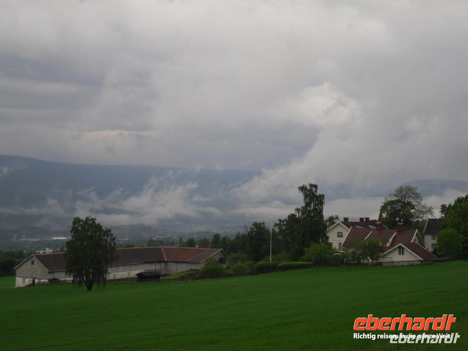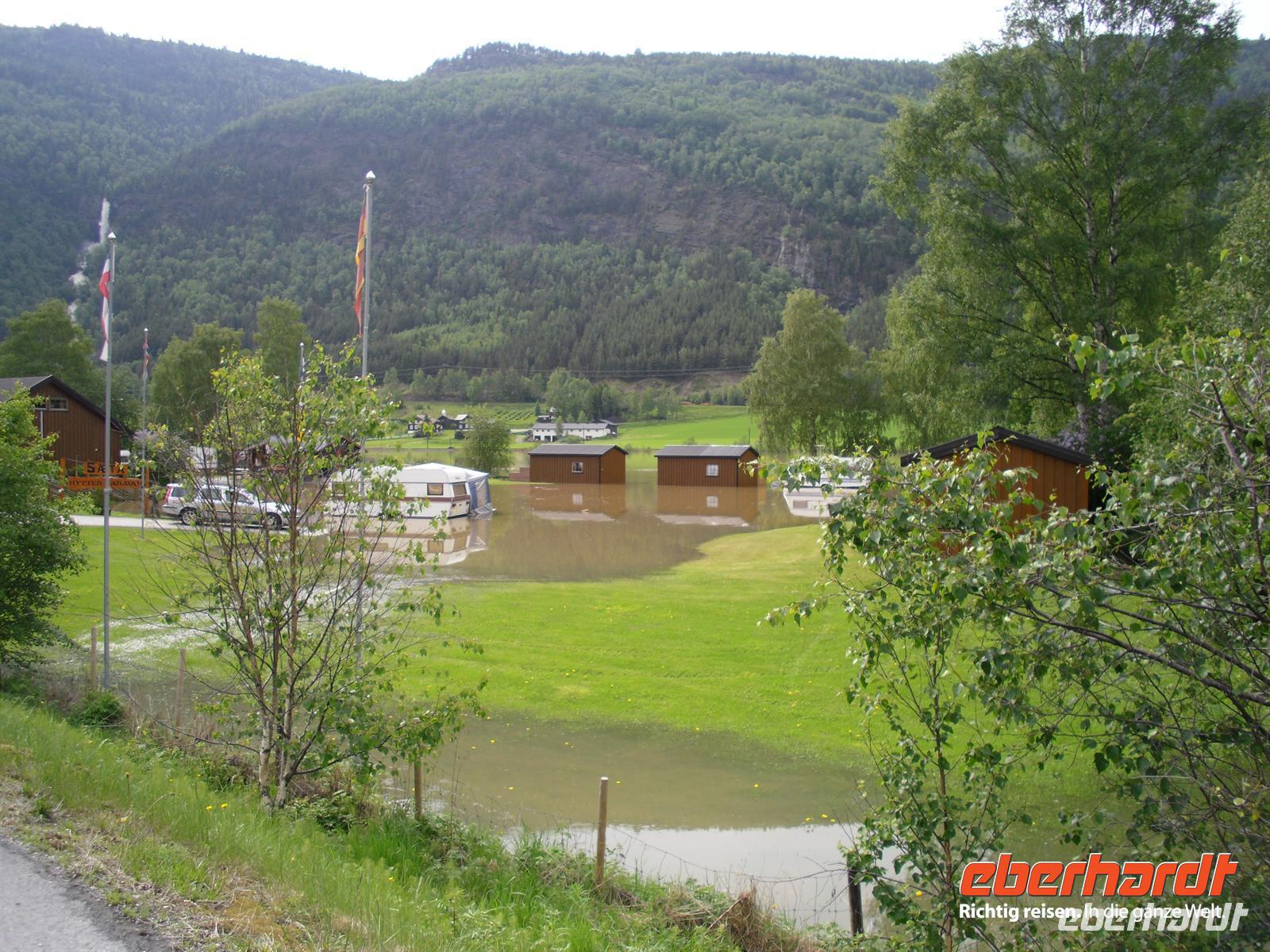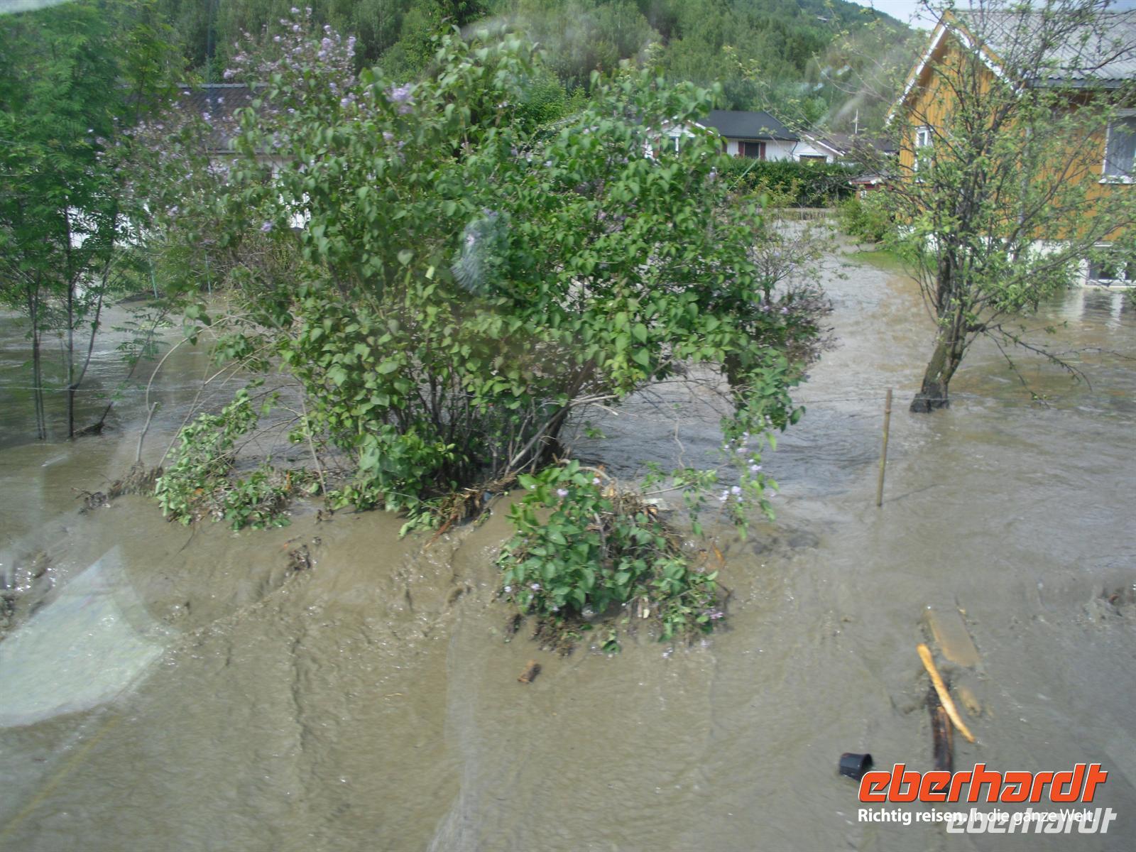 Die Stadt war 1994 Austragungsort der Olympischen Winterspiele und dafür wurden damals zahlreiche neue Sportanlagen errichtet. Anschließend geht es weiter zum Freilichtmuseum Maihaugen. In Maihaugen erleben wir lebendige Geschichte, hier findet man Häuser aus dem Dorf und aus der Stadt vom Mittelalter bis zum heutigen Tag. Im Dorf selbst kann man mit den Bewohnern an der täglichen Arbeit in den 1890er Jahren teilnehmen. Gegen Mittag fahren wir bereits weiter, denn schließlich liegt noch ein weiter Weg bis Trondheim vor uns! Schon wenige Kilometer nördlich von Lillehammer bemerken wir überflutete Wiesen im Gudbrandstal, machen uns aber vorerst noch keine weiteren Gedanken darüber! Gegen 13:00 Uhr ist es dann erstmals vorbei mit unserer landschaftlich beschaulichen Fahrt durch das sogenannte „Tal der Täler“, das vom Fluss Lagen bestimmt wird. Der Lagen ist beängstigend voll mit Wasser und teilweise stehen sogar Häuser und Campingplätze mitten im Wasser - unglaublich, was hier los ist! Das Wasser stürzt sich von den umliegenden Bergen hinunter in den Lagen und die Situation ist teilweise nicht ganz unter Kontrolle, selbst die örtliche Polizei kann uns keine konkreten Auskünfte geben.