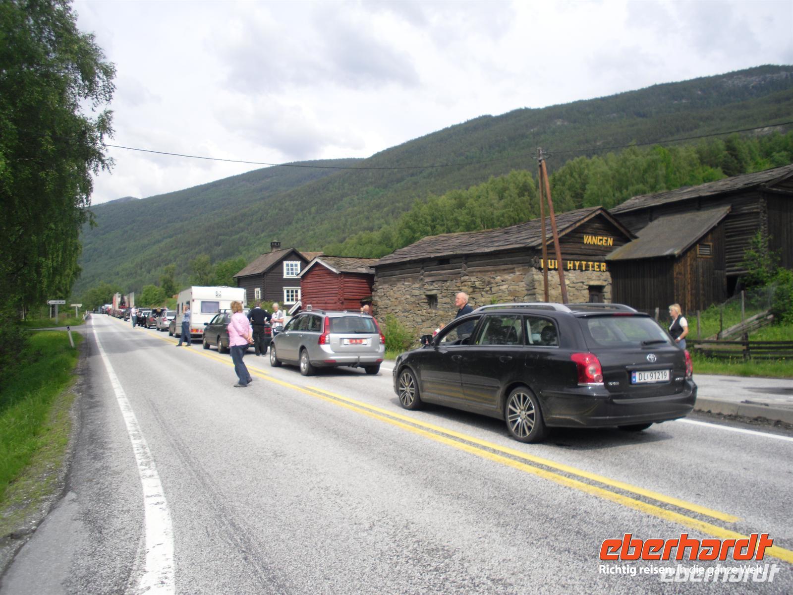 Nach mehreren ungewollten Stopps geht bei Sel, wenige Kilometer nördlich von Otta, gar nichts mehr. Wir erfahren, dass die E6 komplett gesperrt ist und wir umkehren müssen... Was nun, unser Hotel ist doch in Trondheim? Es muss ein neuer Plan her, denn es gibt schließlich für jedes Problem eine Lösung. Kurzerhand fahren wir zurück bis Otta und weiter durch das Ottatal, über Lom und Grotli nach Geiranger. Dort gibt es zum Glück genügend Zimmer und wir müssen uns erst einmal keine weiteren Gedanken bezüglich einer Übernachtungsmöglichkeit machen. Gegen 20 Uhr erreichen wir das Hotel „Geiranger“ in Geiranger und lassen es uns vom leckeren Abendbuffet schmecken. Manch einer nutzt sogar noch die Gelegenheit zu einem abendlichen Spaziergang - schließlich ist es hier auch um 23 Uhr noch taghell!