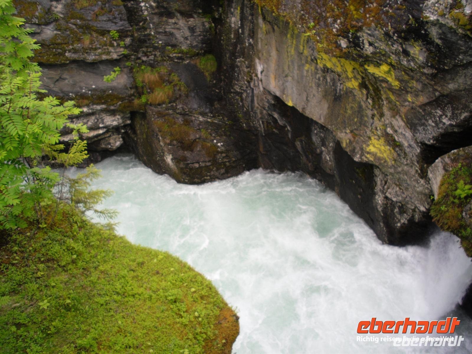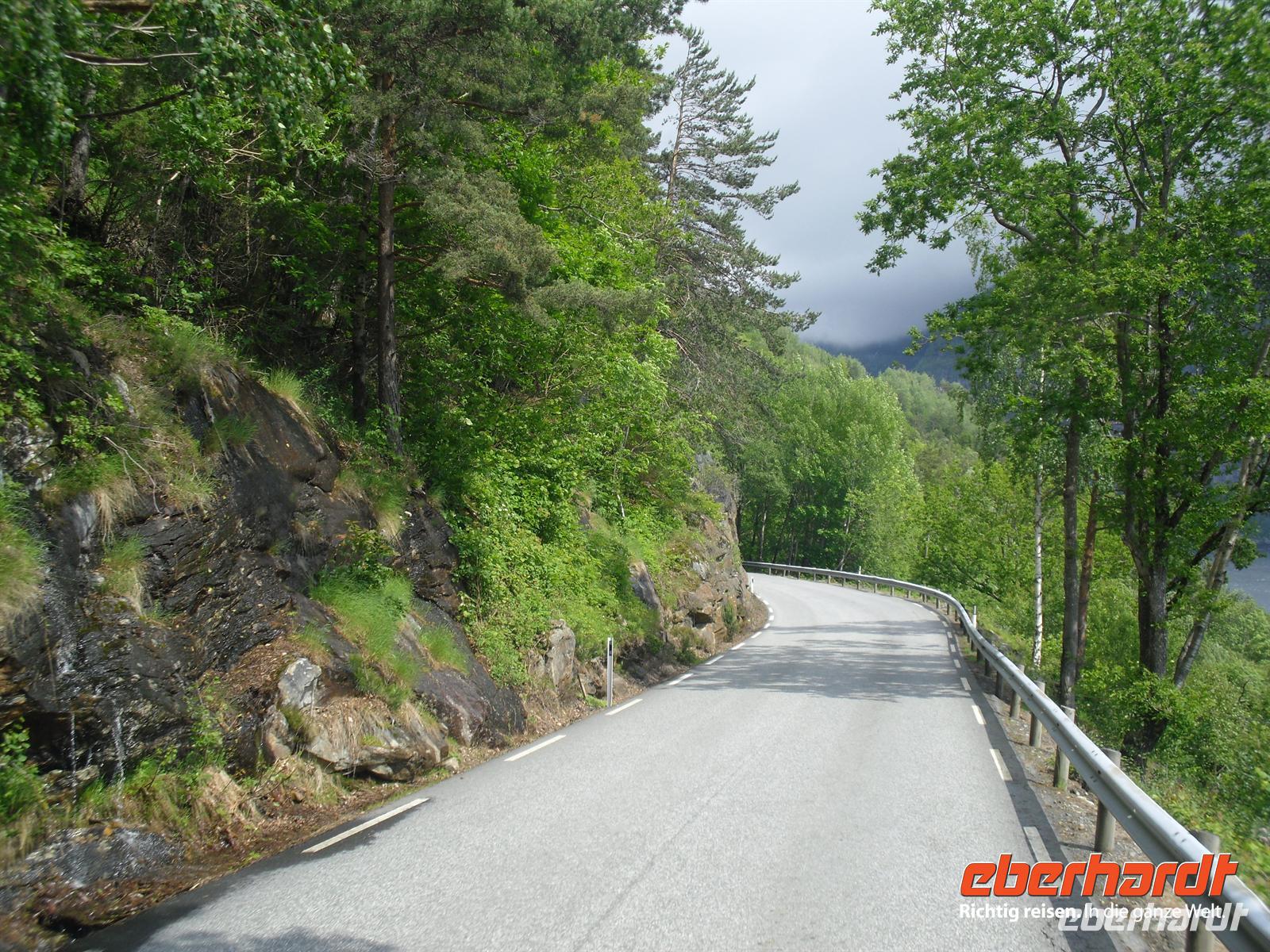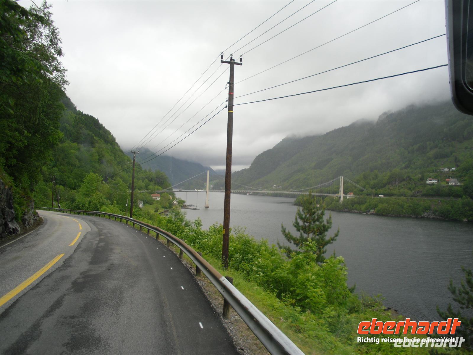 Die Passüberquerung ist eine der ältesten Verbindungswege zwischen Ost und West, sie war die Hauptroute vom gesamten Gudbrandsdal zu den Küstensiedlungen in Sogn und bis nach Bergen. An Waren wurden hier hauptsächlich Salz, Hering und Fisch aus dem Westen und Häute, Butter, und Eisen aus dem Osten transportiert - in beiden Richtungen auf dem eigenen Rücken oder zu Pferd. Unterwegs nutzen wir die reichlichen Möglichkeiten für Fotostopps, obwohl es das Wetter heute wieder mal nicht so gut mit uns meint. Schließlich erreichen wir Skjolden am Lustrafjord bzw. am inneren Ende des Sognefjords, hier sind wir etwa 200 Kilometer vom Meer entfernt. Entlang der Nordseite des Lustrafjords und mit herrlichen Blicken auf den Fjord und die zahlreichen Wasserfälle kommen wir nach Sogndal, einer der größten Ortschaften am Sognefjord.
