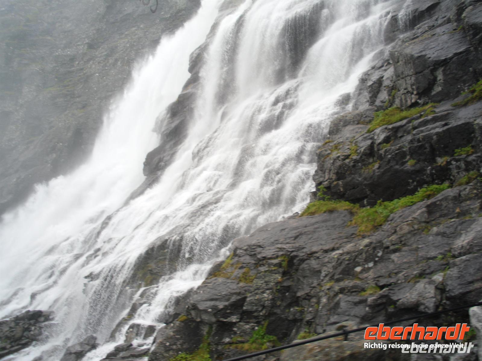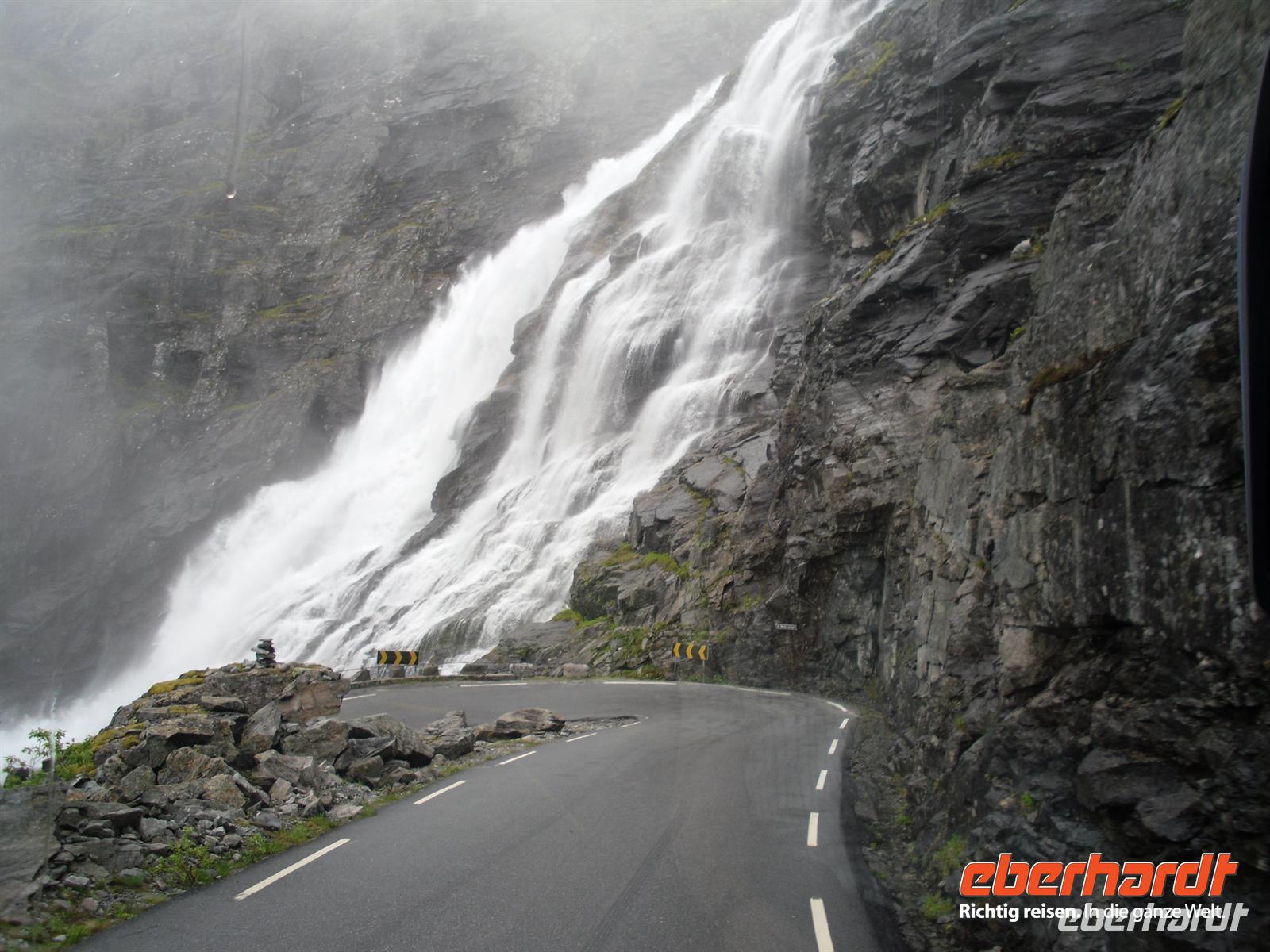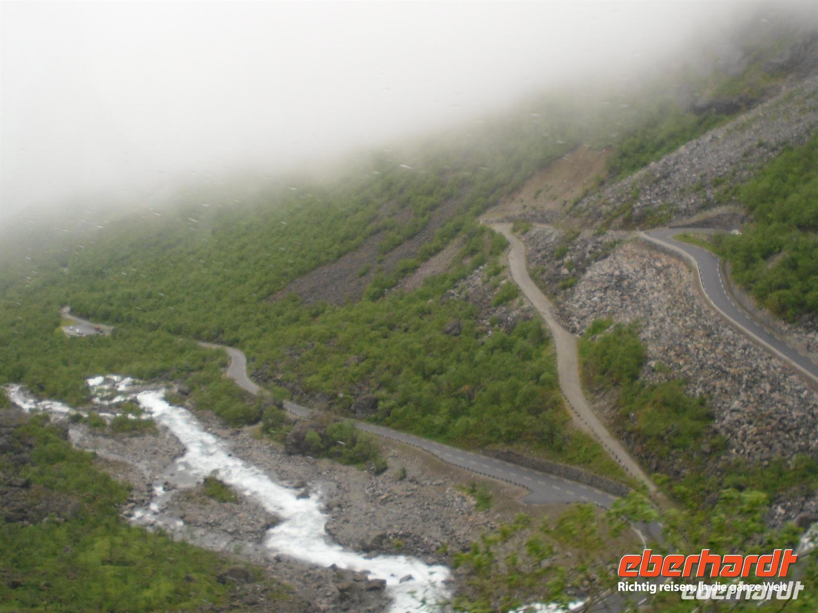 Die umgebenden Berge sind schroff - Namen wie Kongen (König), Dronningen (Königin) und Bispen (Bischoff) bestätigen die Majestät dieser Bergwelt. Hoch oben stürzt sich der Stigfossen ins üppig grüne Isterdal, und mittendurch steigt die Trollstigen-Straße an der Bergseite empor. Nach einer Bauzeit von acht Jahren wurde der Trollstigen 1936 eröffnet und selbst heute ist die Straße ein gutes Beispiel für hohe Ingenieur- und Baukunst. Übersetzen könnte man den Namen „Trollstigen“ übrigens mit „Zauberweg“. Was sind nun eigentlich Trolle? - Es sind im nordischen Volksglauben Dämonen in Riesengestalt. Bereits seit grauer Vorzeit leben in den Bergen und in den alten Hünengräbern Norwegens die Trolle. Sie sind - wie auch die Wichteln und Zwerge - elbische Wesen. Ihre Herkunft ist unbekannt. Einem Geistlichen, der sie vertreiben wollte, klagten sie einmal, sie seien herabgestürzte Engel. Einer anderen Geschichte zufolge sind sie Nachkommen der alten Riesen, die immer weiter geschrumpft sind und weiter schrumpfen.