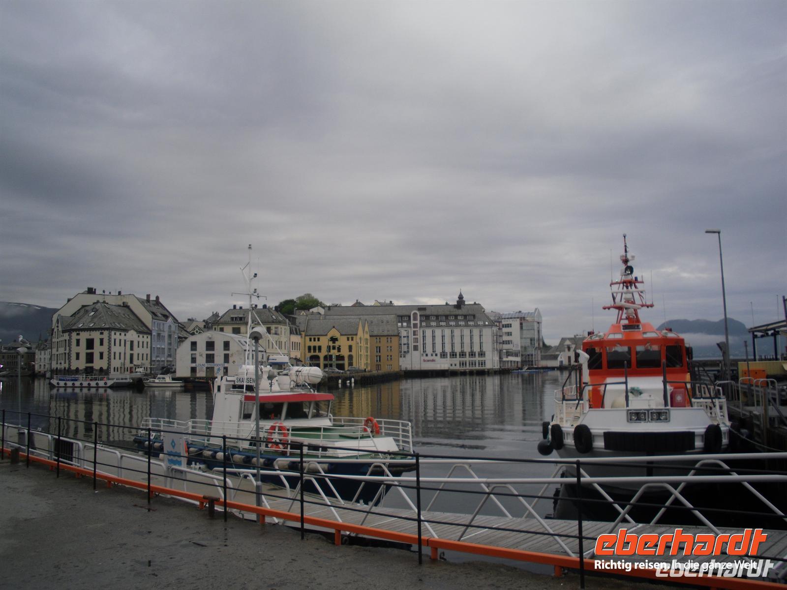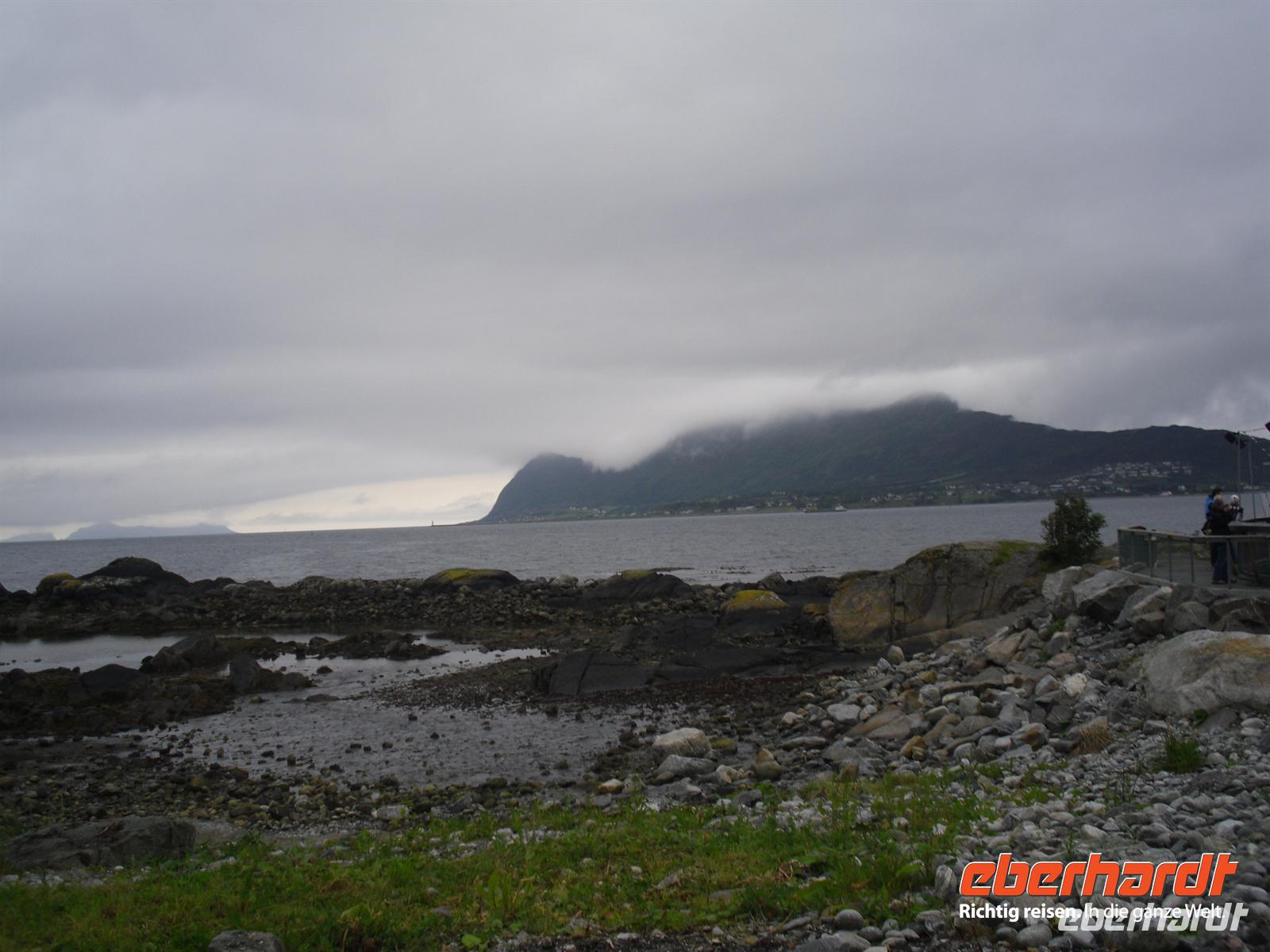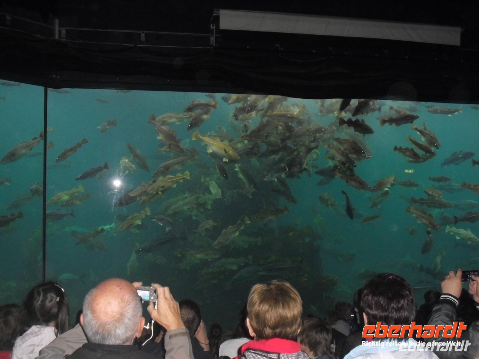 Die Fahrt führt uns heute dann bei leider vorerst wieder einmal regnerischem Wetter zum Varden, dem 407 Meter hohen Hausberg von Molde. Hier oben kann man bei schönem Wetter das bekannte „Moldepanorama“ genießen, denn man hat einen herrlichen Blick über den Fjord und auf die schneebedeckten Gipfel der Romsdaler Alpen. Heute müssen wir alle allerdings eine große Portion Phantasie mitbringen, um uns dieses Panorama vorzustellen...! Anschließend fahren wir zur Fähranlegestelle in Molde und setzen schließlich innerhalb von etwa 35 Minuten über den Romsdalsfjord nach Vestnes über. Nun sind es nur noch wenige Kilometer bis nach Alesund. Die Gruppe ist sich einig und daraufhin besuchen wir heute Nachmittag zusätzlich den etwa drei Kilometer außerhalb des Stadtzentrums von Alesund gelegenen Atlantikpark. Dies ist eine der größten Aquarien in Nordeuropa. Hier wird das Leben im Meer und in den Fjorden gezeigt.