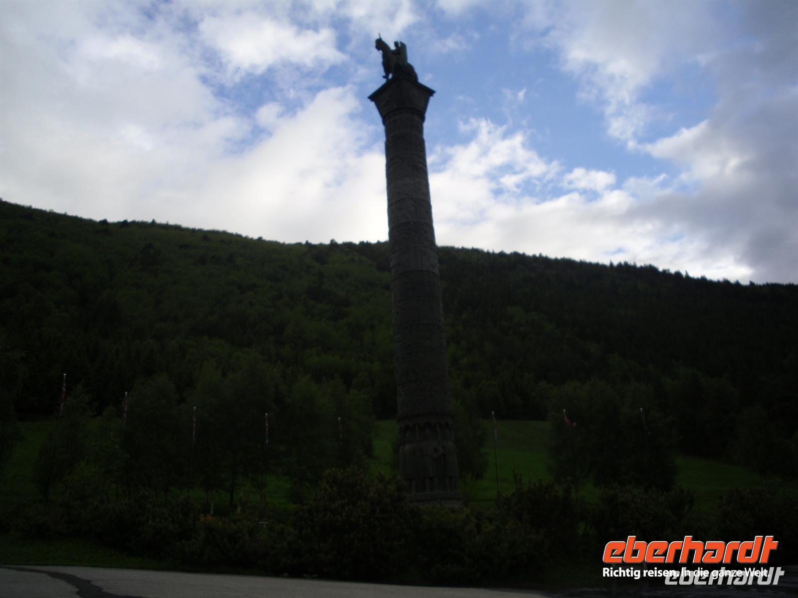 Das ganze Anwesen ist wie eine altnorwegische Götter-Wohnstätte gestaltet, und jeder Raum trägt einen Namen aus der nordischen Mythologie. Wie bei einem alten Bauerngehöft im Gudbrandsdaler Stil sind die Häuser um einen schönen Platz gruppiert. Auf dem hiesigen Anwesen steht übrigens auch seit 1992 die 33 Meter hohe geschichtsträchtige Saga-Säule, die einen Querschnitt durch die norwegische Geschichte zeigt - beginnend mit dem ersten vereinigten Reich 872 bis zur Reichsversammlung 1814. Entworfen wurde die Säule vom Bildhauer Rasmussen bereits vor dem Zweiten Weltkrieg und sollte ursprünglich vor dem Parlament in Oslo platziert werden. Wir sind alle begeistert von dem urigen Stil dieses Hotels und die meisten genießen den Abend ganz gemütlich bei Kaffee oder Tee am knisternden Feuer des Kamins; denn einen Fernseher auf den Zimmern gibt es hier nicht - warum auch?, brauchen wir nicht...!