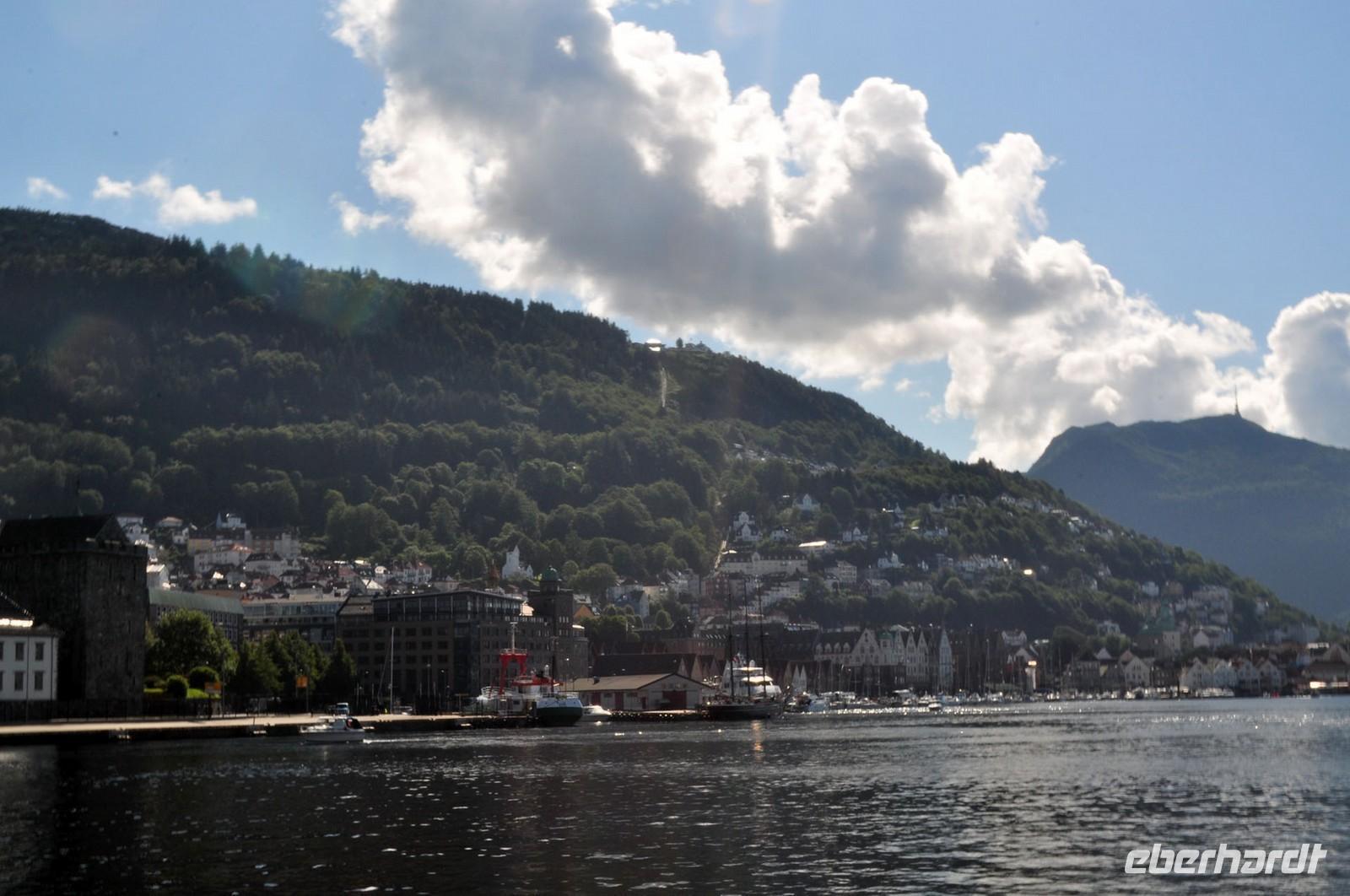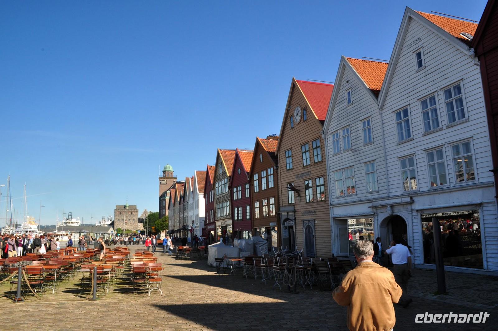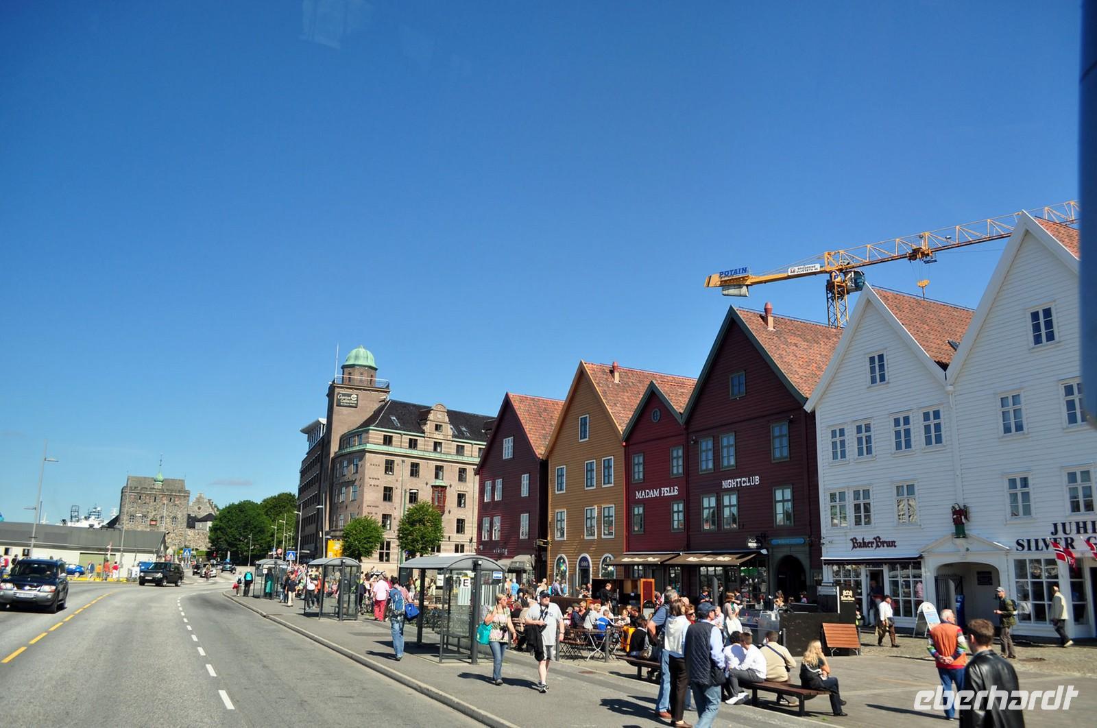 Am Morgen (bei Sonnenschein) erleben wir die wunderschöne Stadt Bergen, natürlich mit dem UNESCO Weltkulturerbe am alten Hafen.
