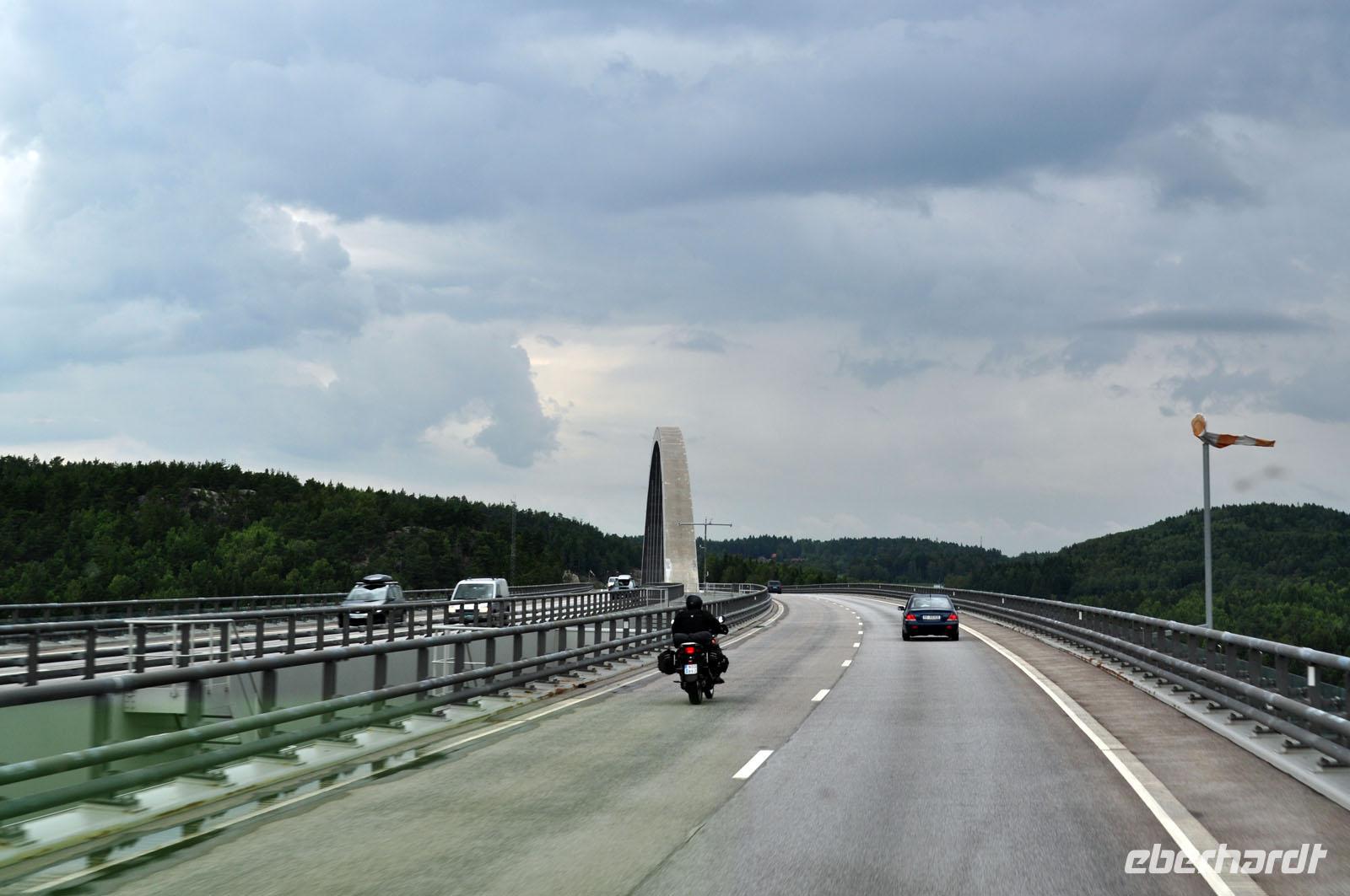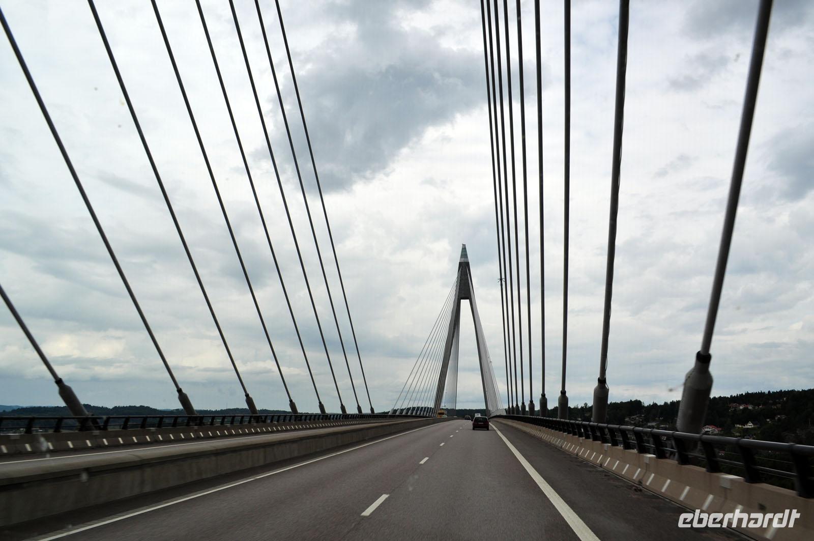 Anschließend starten wir zu unserer Fahrt nach Oslo. Wir fahren auf die E6, queren die Schrägseilbrücke bei Uddevalla und später die Swinesundbrücke, die gleichzeitig die Grenze zwischen Schweden und Norwegen bildet.