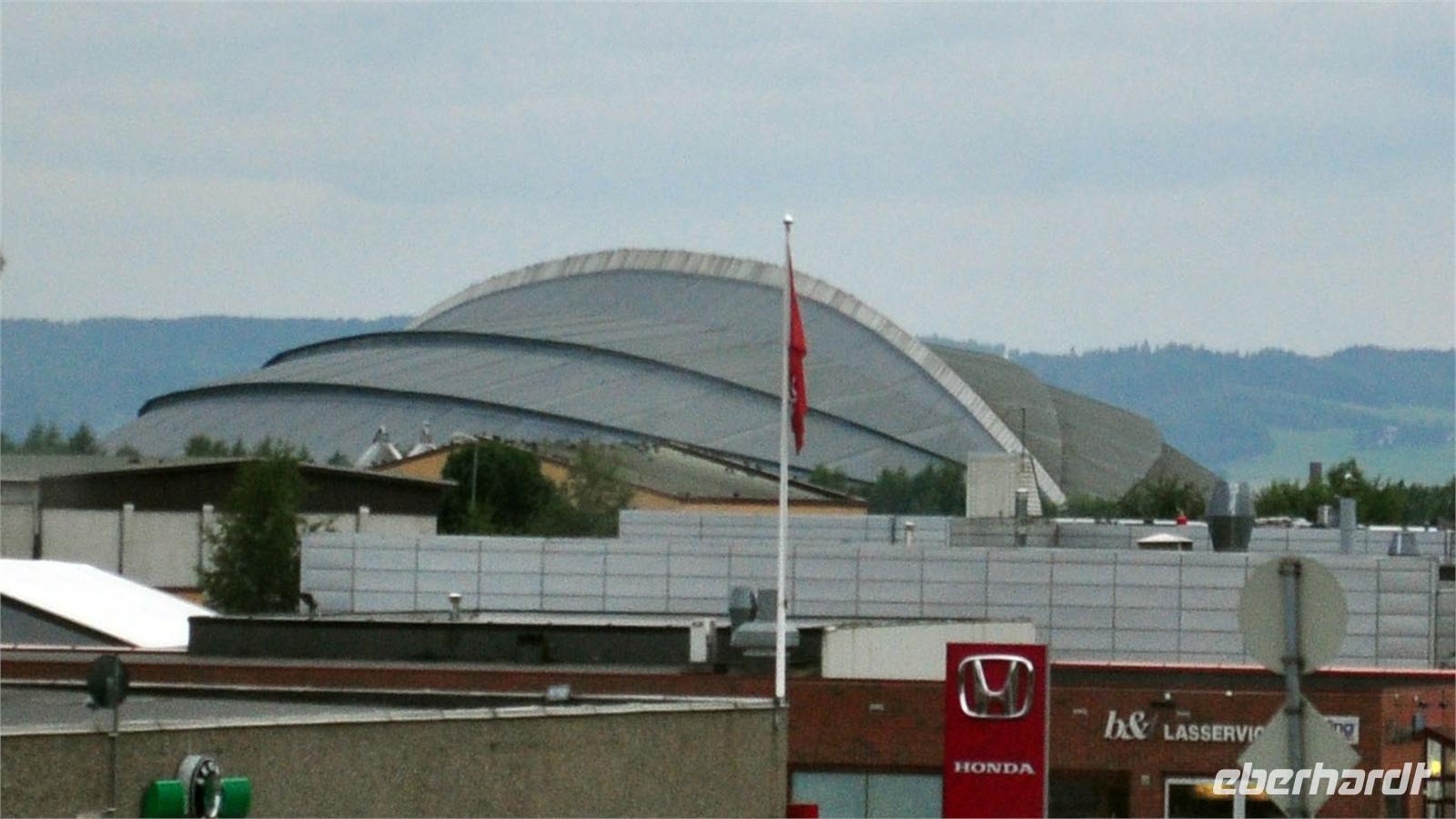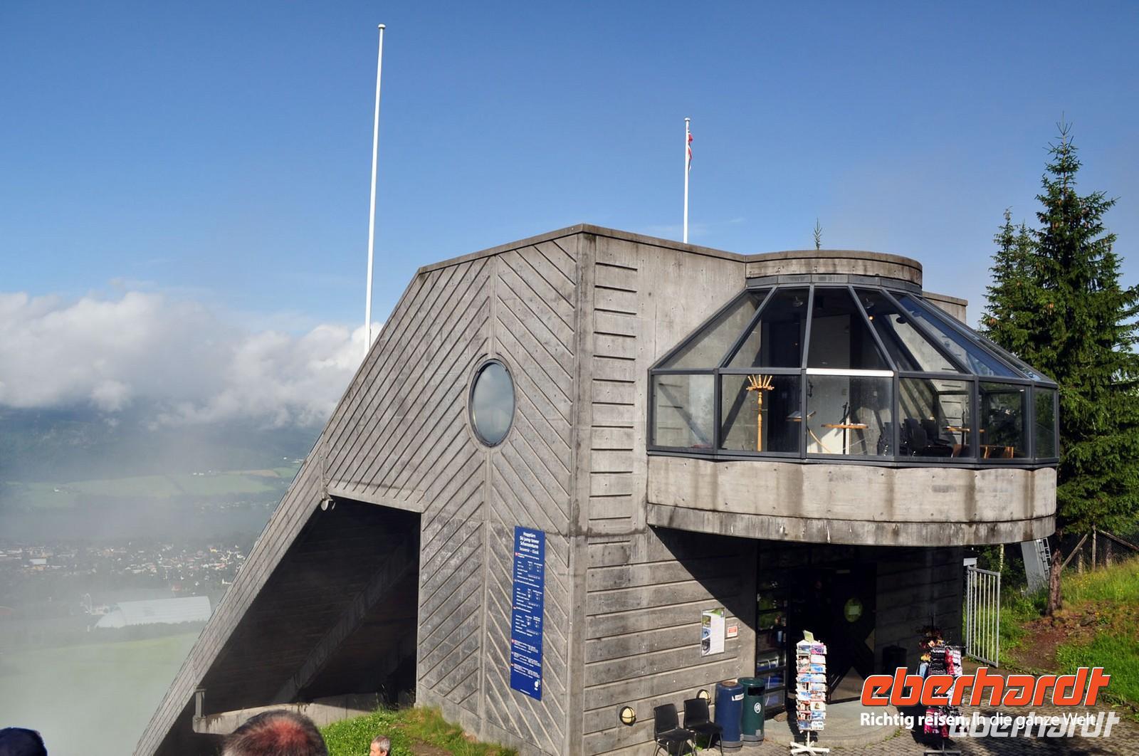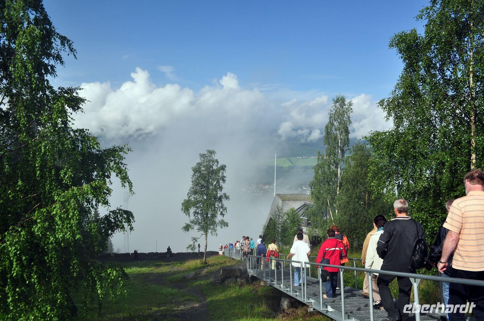 Dort besuchen wir als erstes den Olympiapark mit den Lysgård-Schanzen. Als kleines Bonbon fahren wir bis hoch. Als wir oben ankommen. Immer noch Nebel, Sicht annähernd noch null.