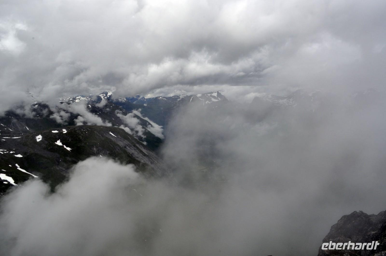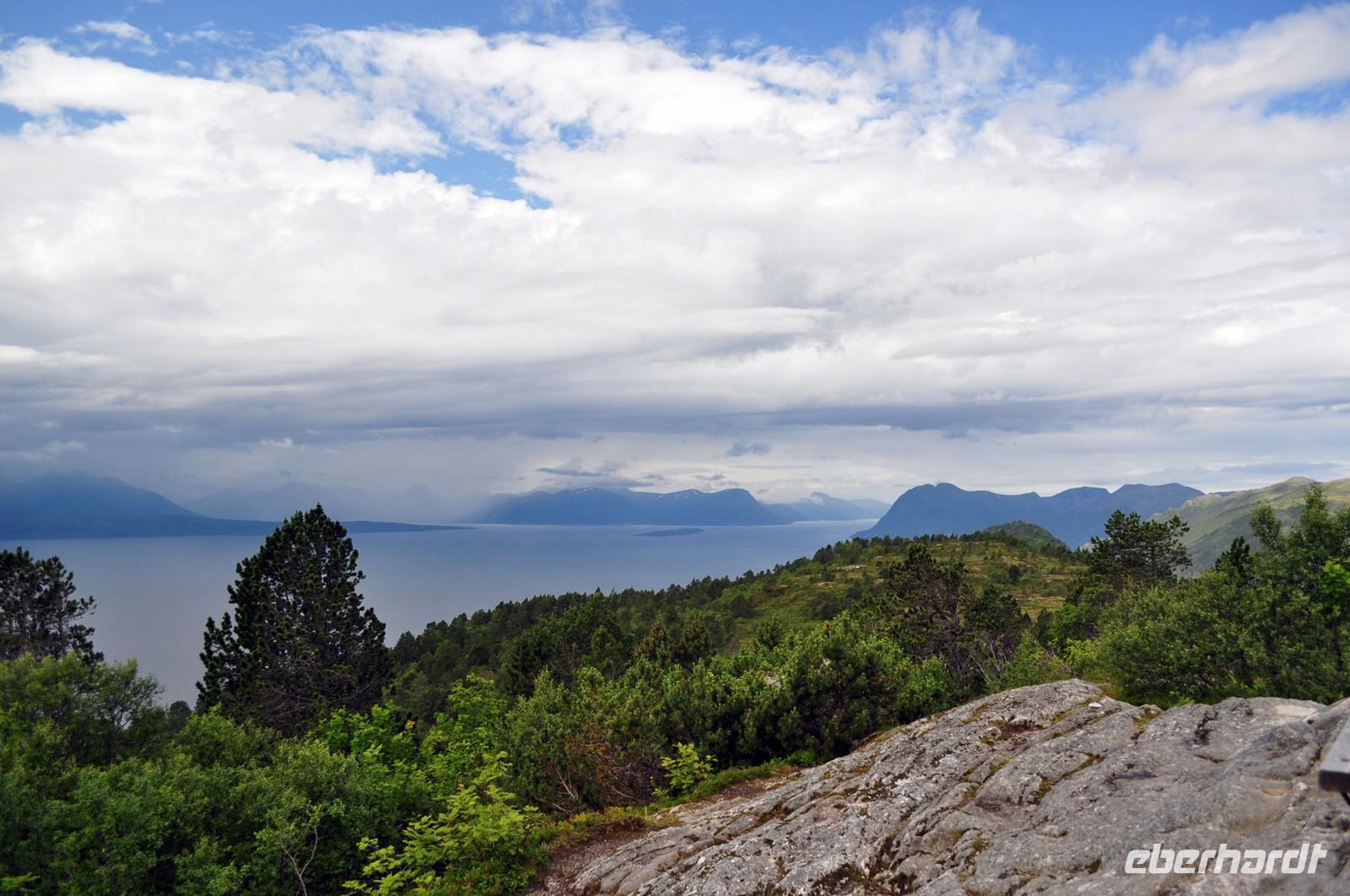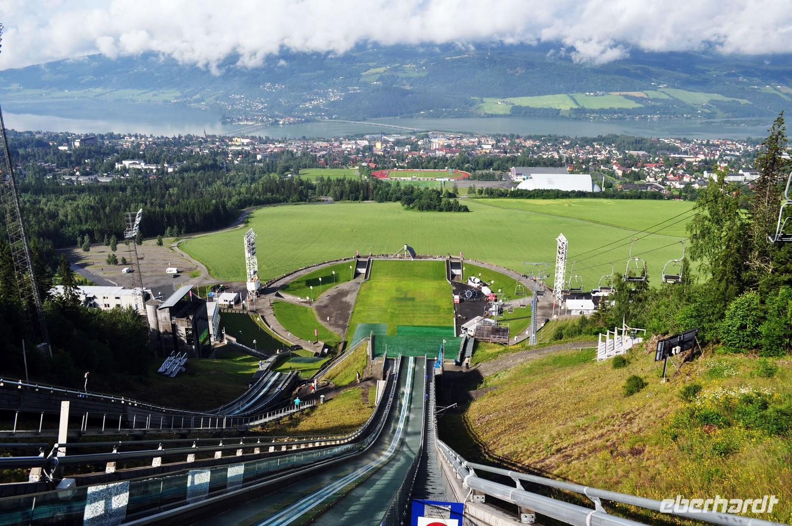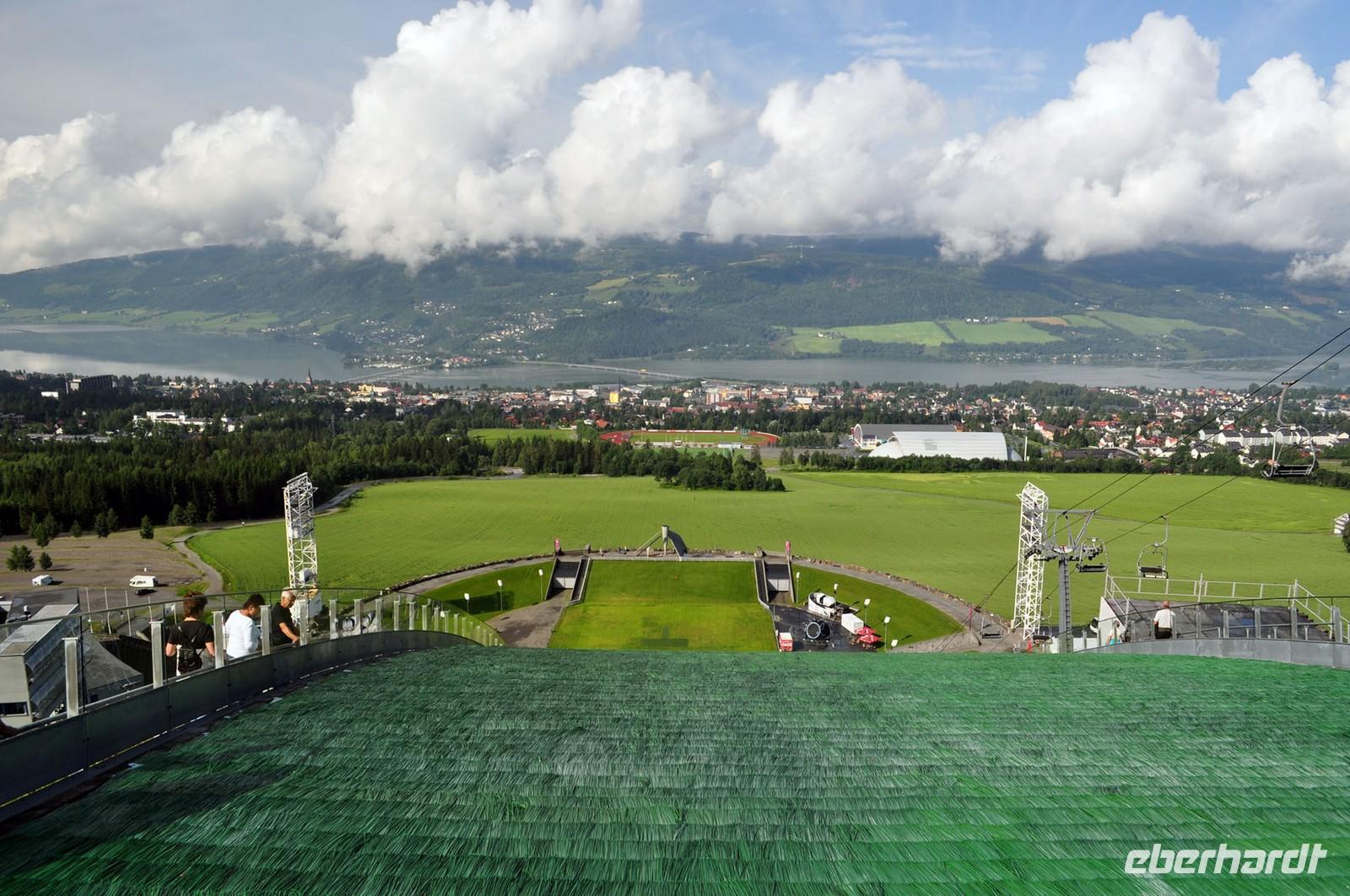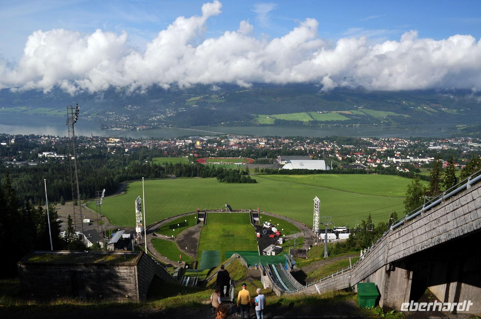 Aber in Norwegen kann sich das ganz schnell ändern, wenige Augenblicke (!) später reißt der Himmel völlig auf, wir können bis ins Tal und zum Mjøsasee blicken. Und bekommen eine Vorstellung davon, was den Athleten "auf dem Balken" so durch den Kopf gehen muss.