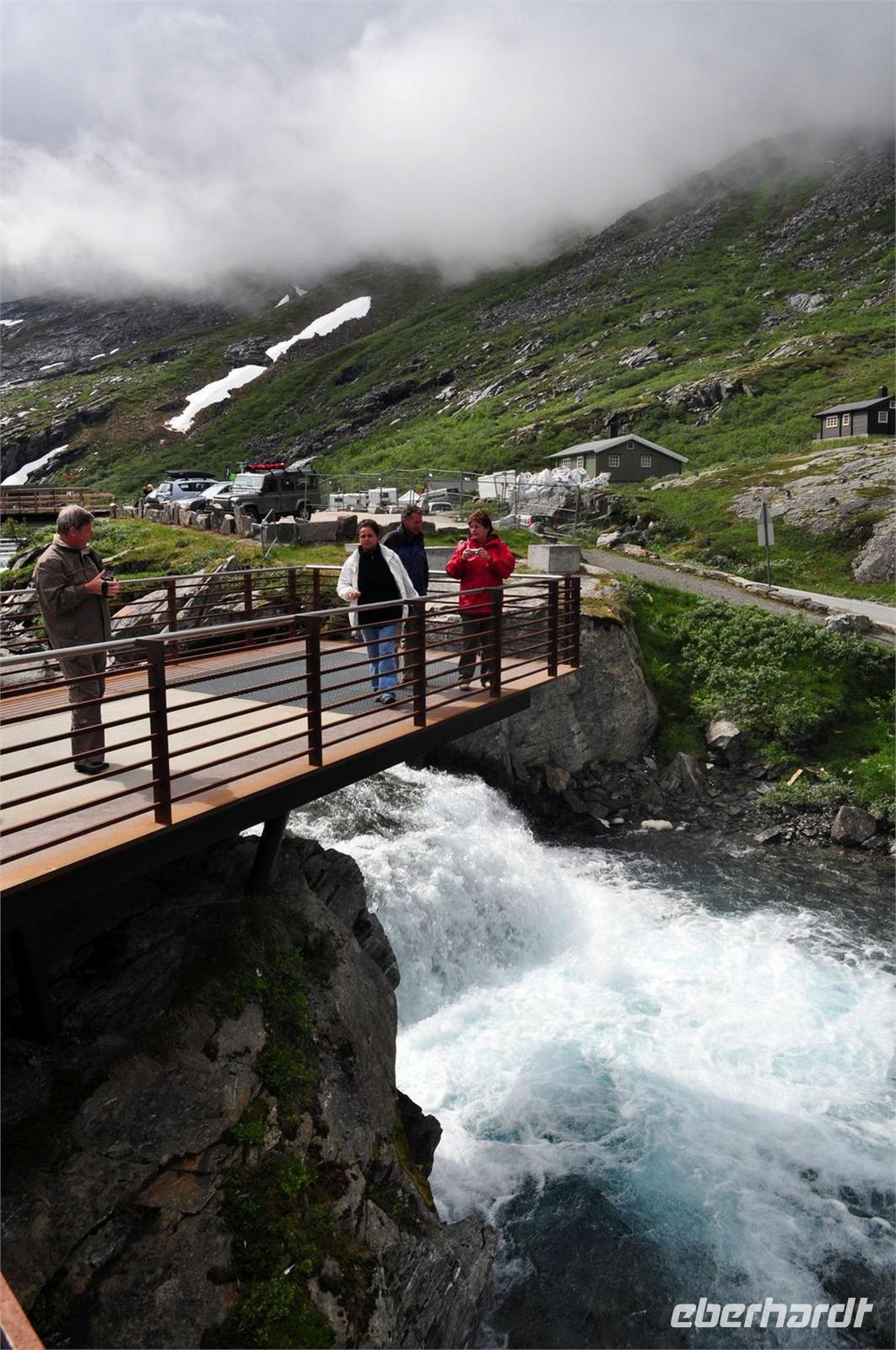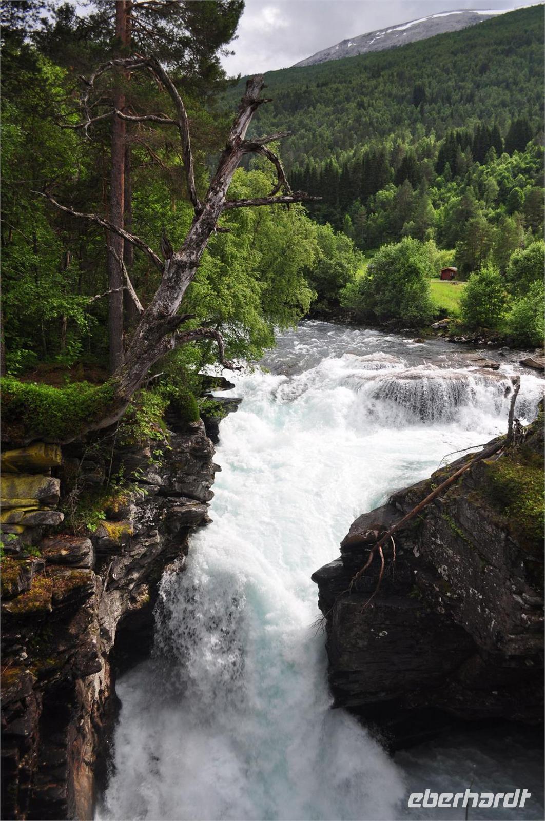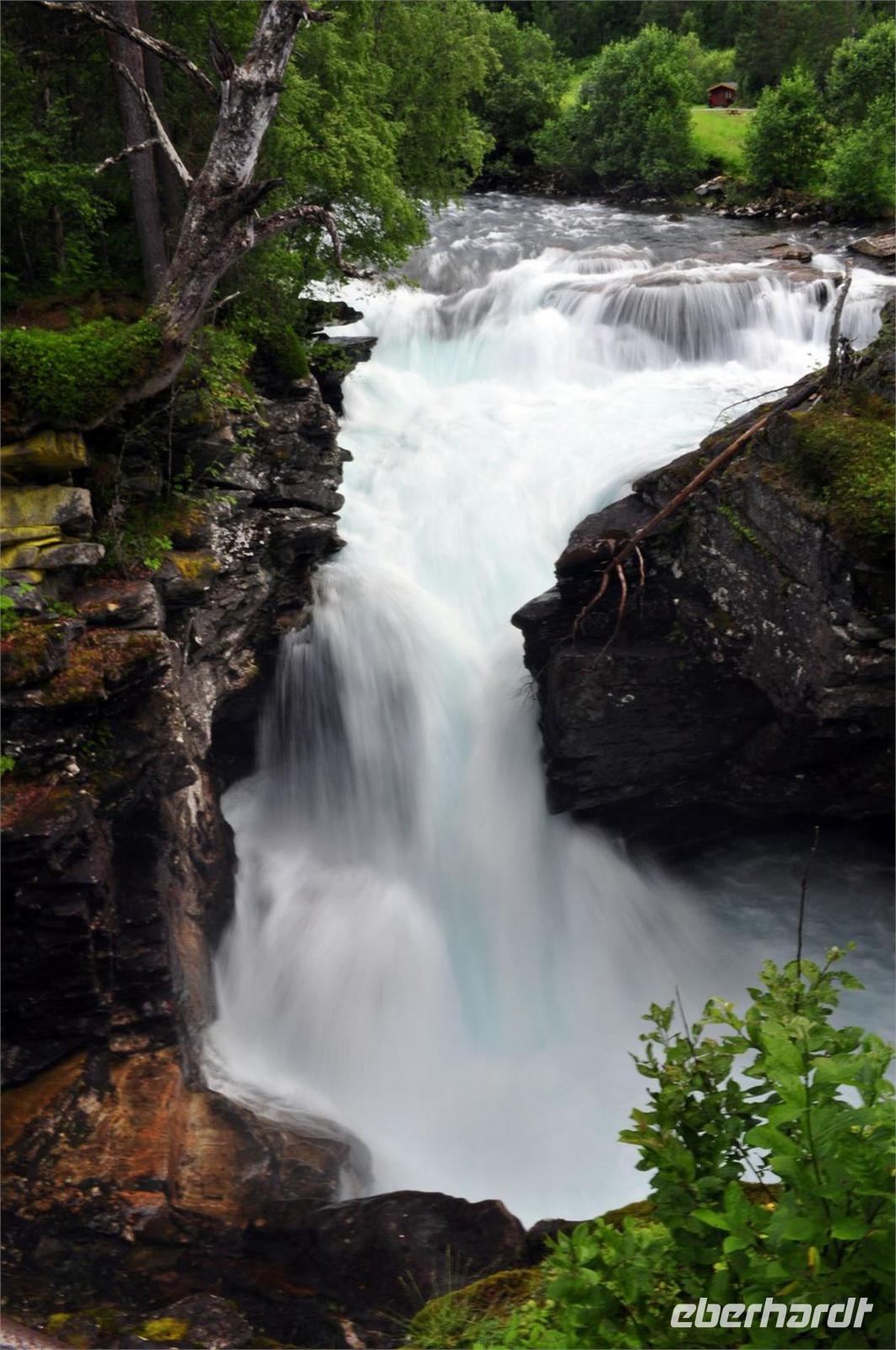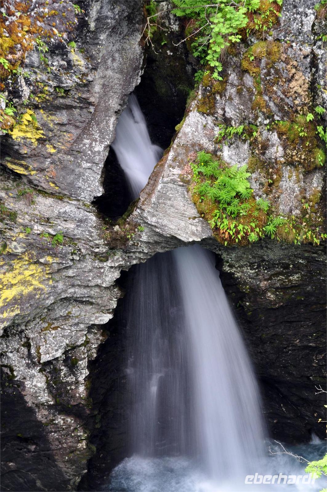 Nach einer Stunde fahren wir weiter durch ein schönes Hochal und weiter hinunter zum Gudbrandsjuvet, ein sehr ansehnlicher Wasserfall, der sich durch mehrere Felsen stürzt.