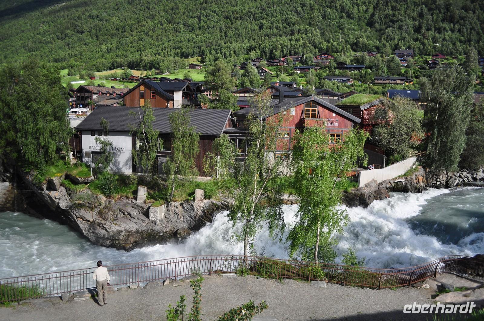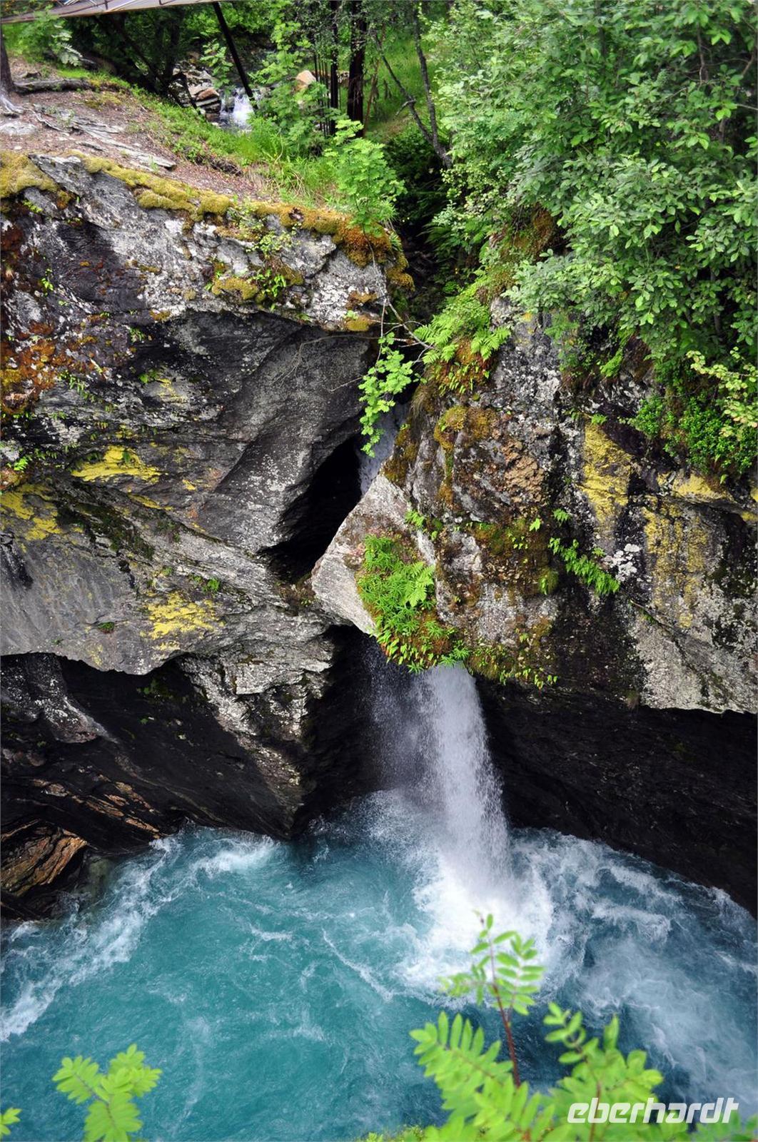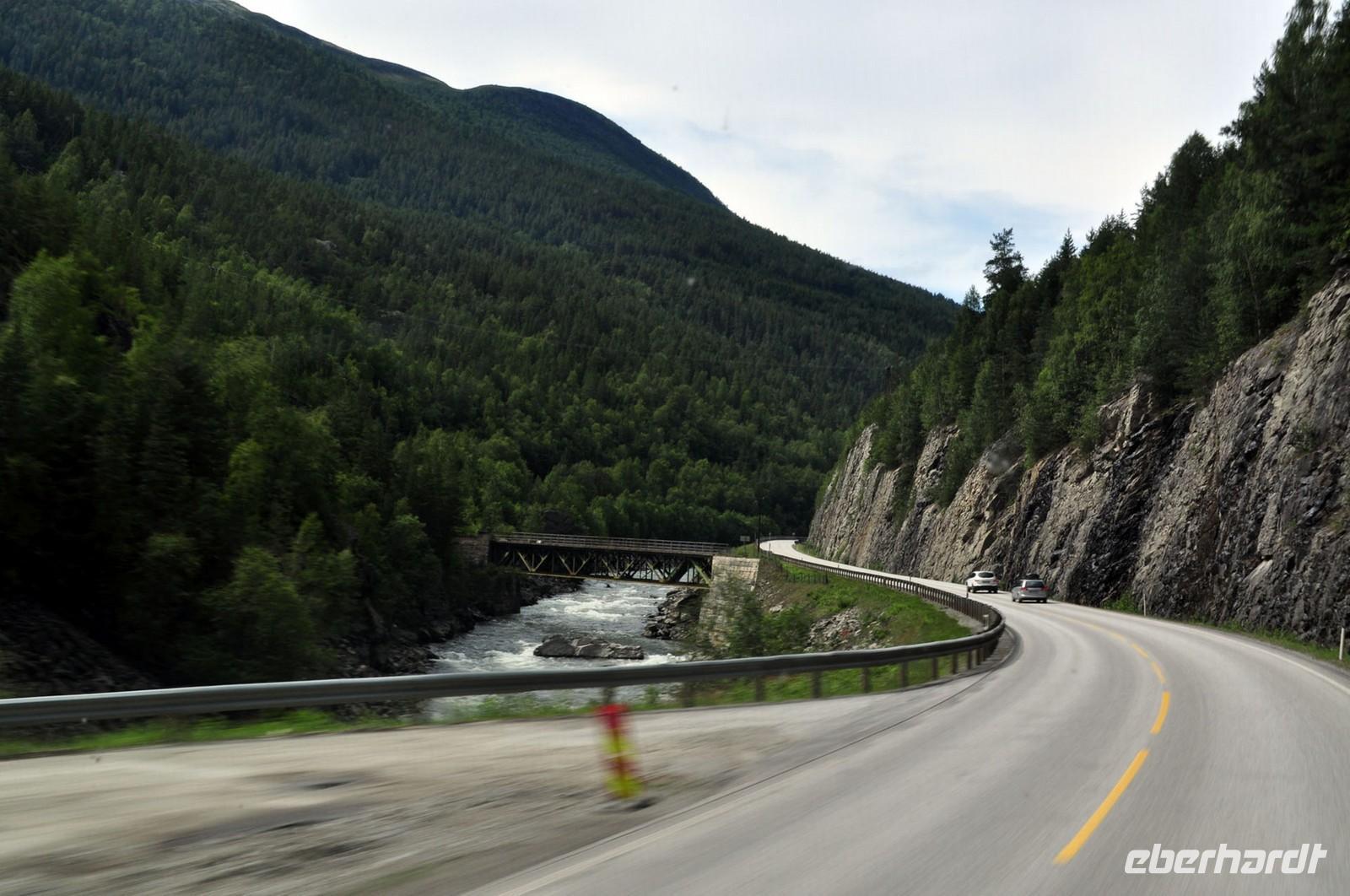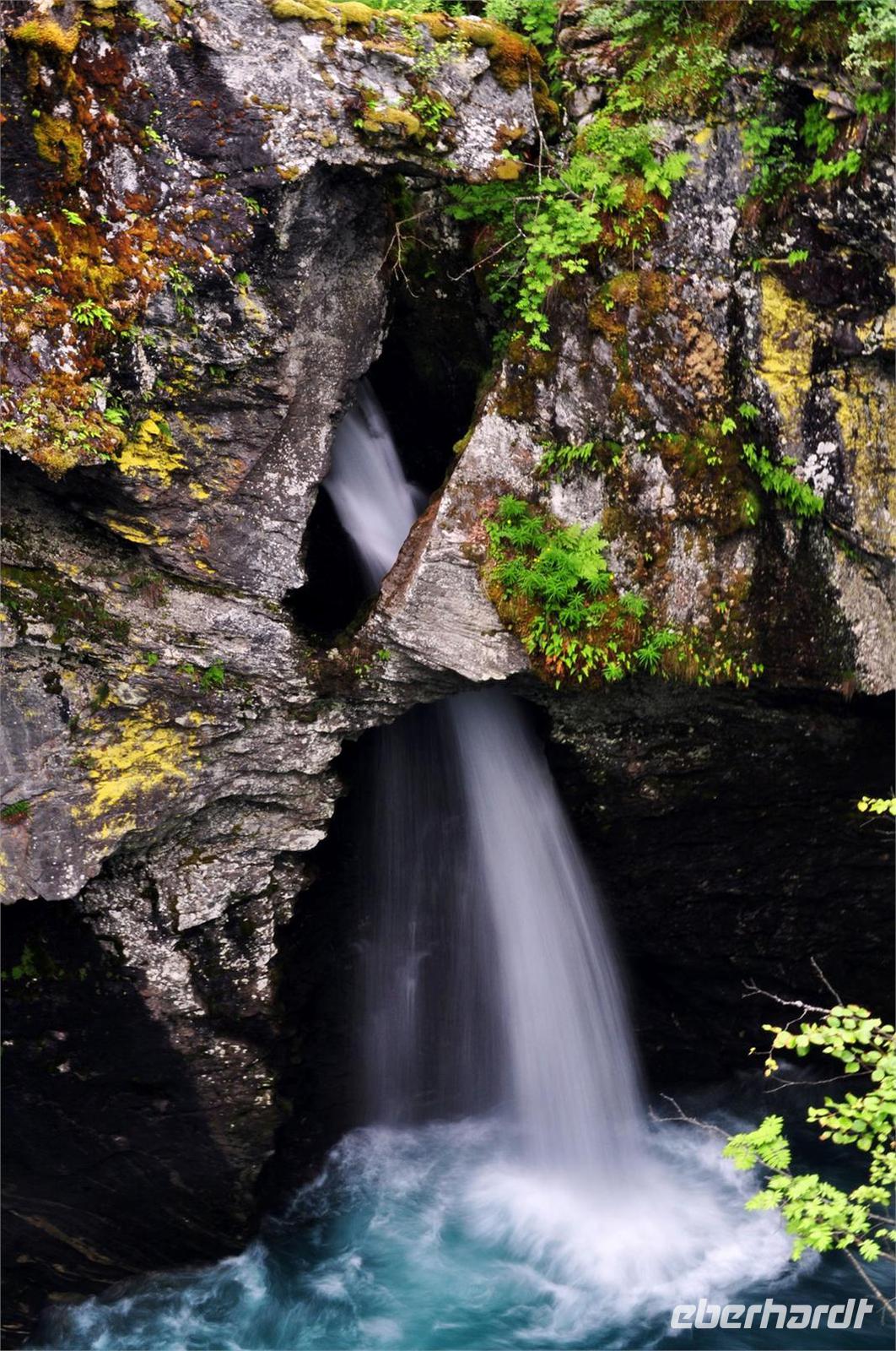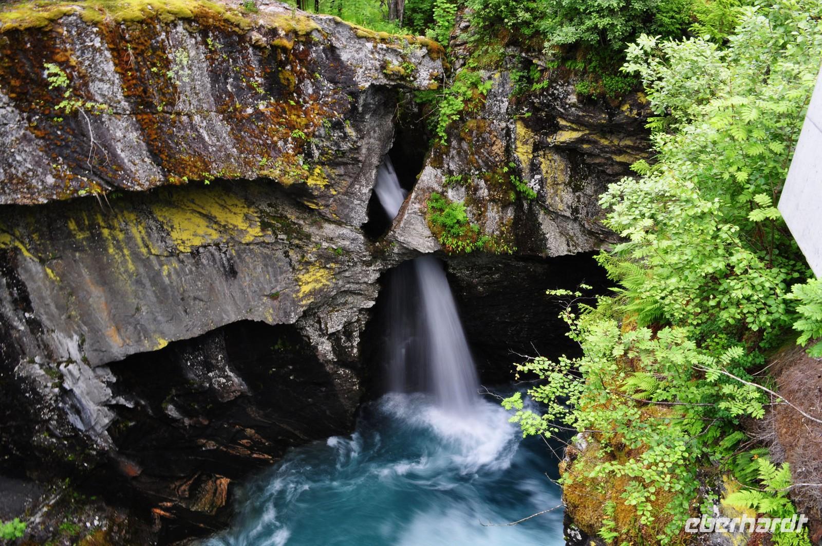 Nach einer Stunde fahren wir weiter durch ein schönes Hochal und weiter hinunter zum Gudbrandsjuvet, ein sehr ansehnlicher Wasserfall, der sich durch mehrere Felsen stürzt.