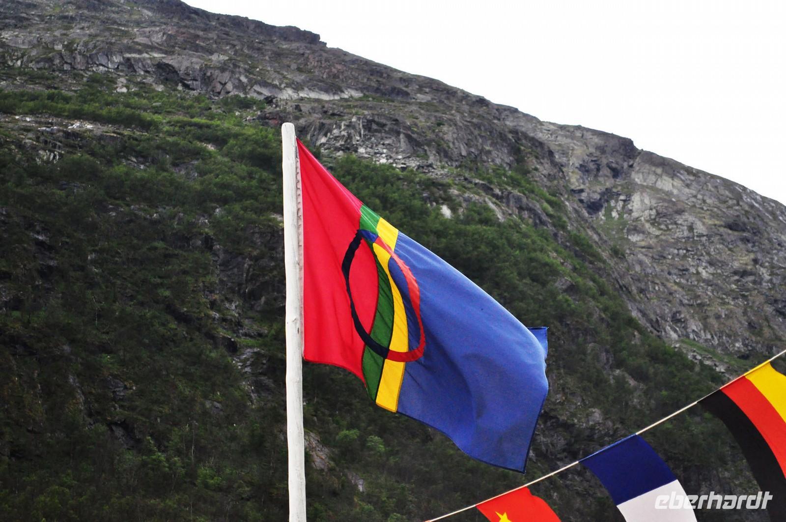 Mit Sekt, der norwegischen Flagge und natürlich der norwegischen Hymne genossen alle Gäste diesen wunderbaren Moment, selbstverständlich (und Petrus sei es gedankt) mit freiem Blick auf den Geirangerfjord.