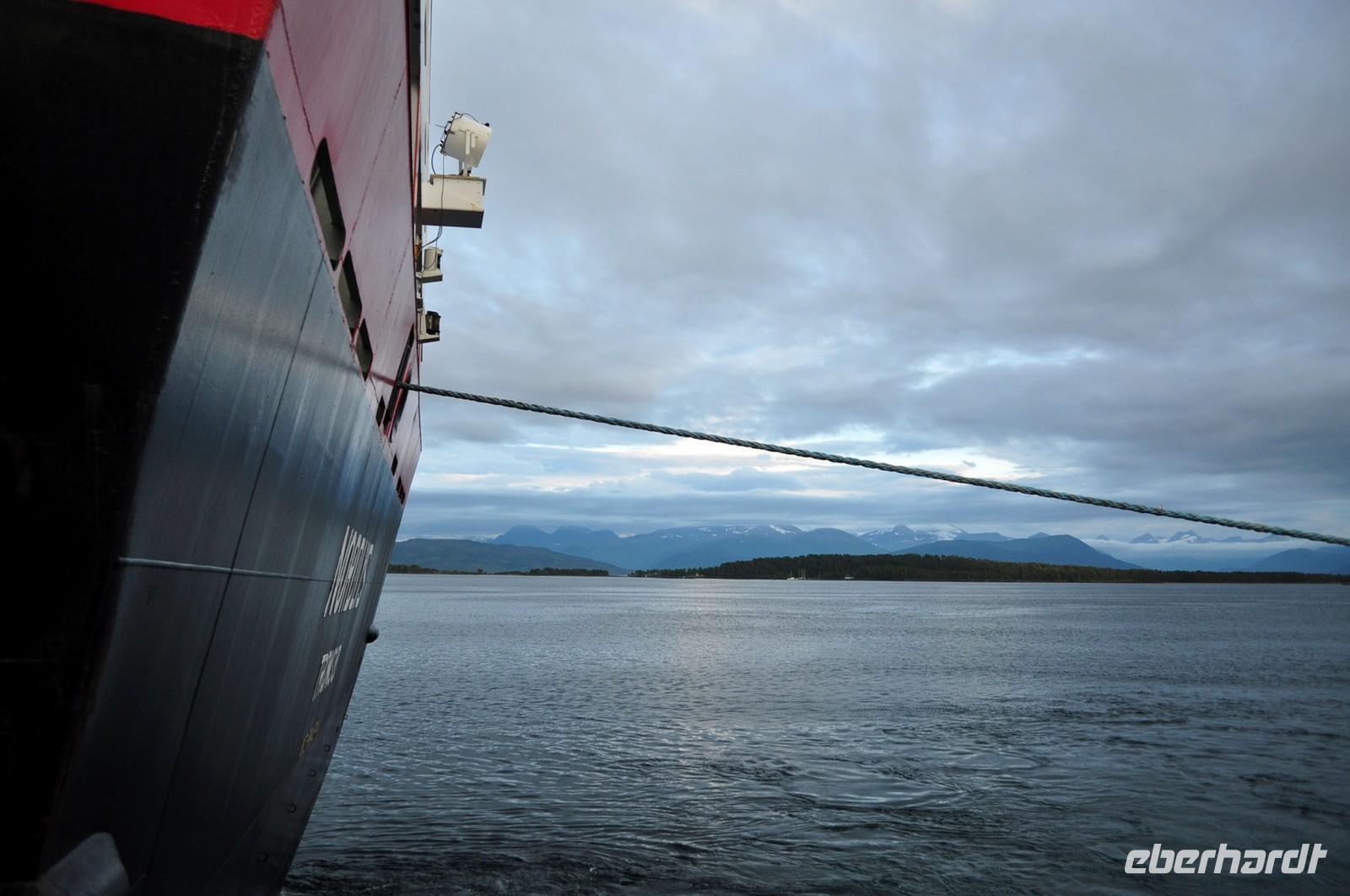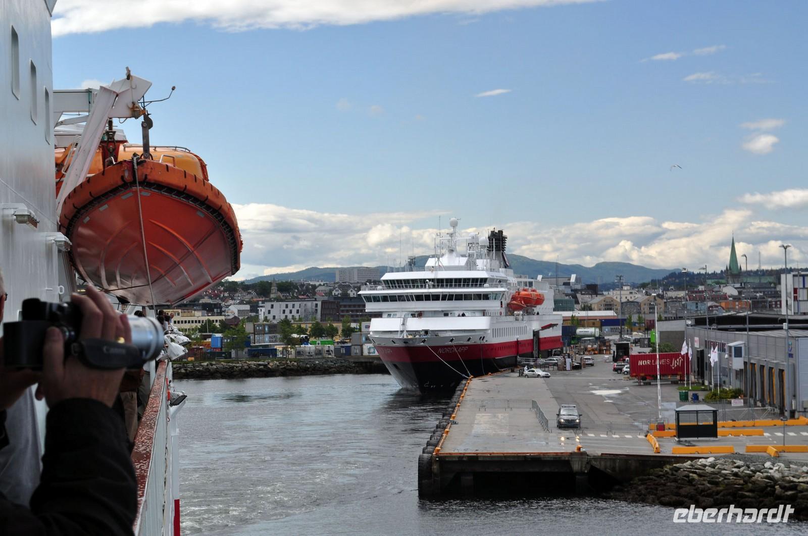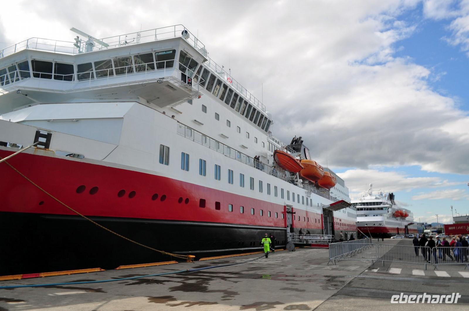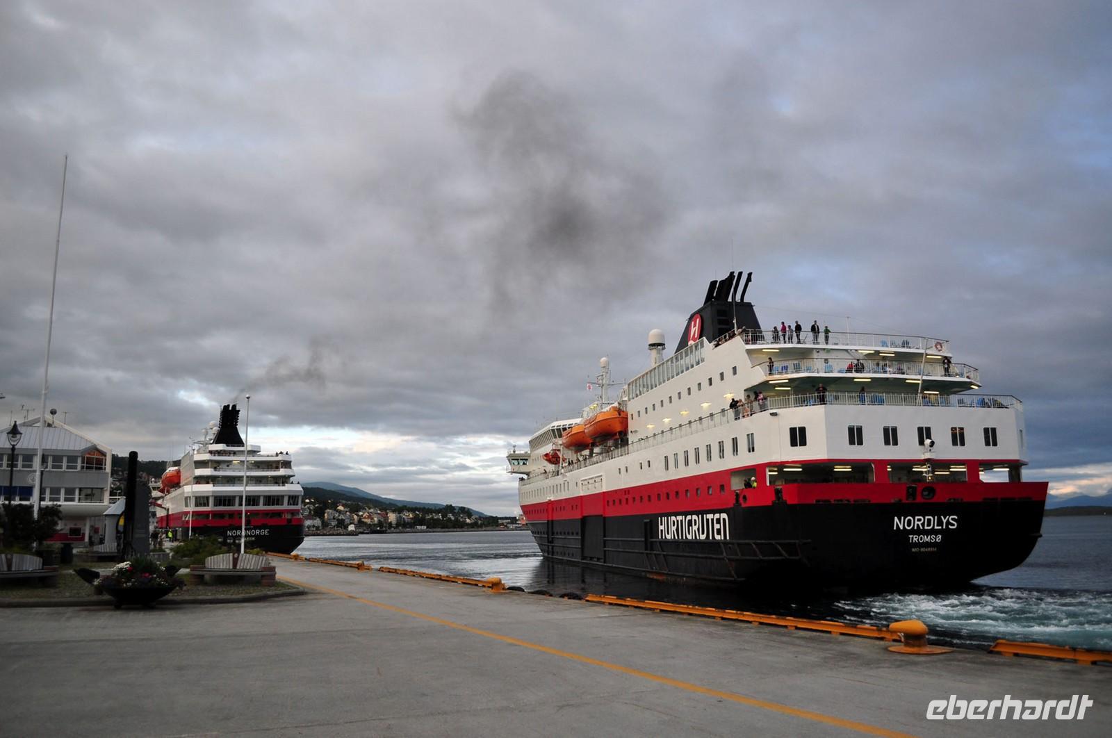 Nach einem sehr guten Abendessen verfolgten die meisten Gäste das Geschehen am Kai. Es trafen sich unsere südgehende MS Nordlys mit der nordgehenden MS Nordnorge.