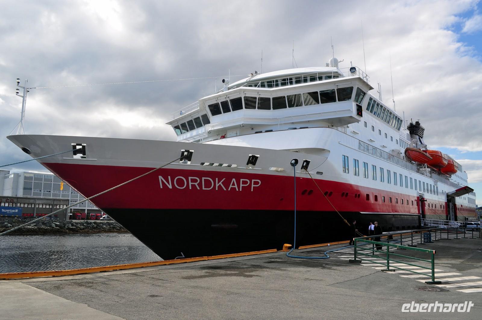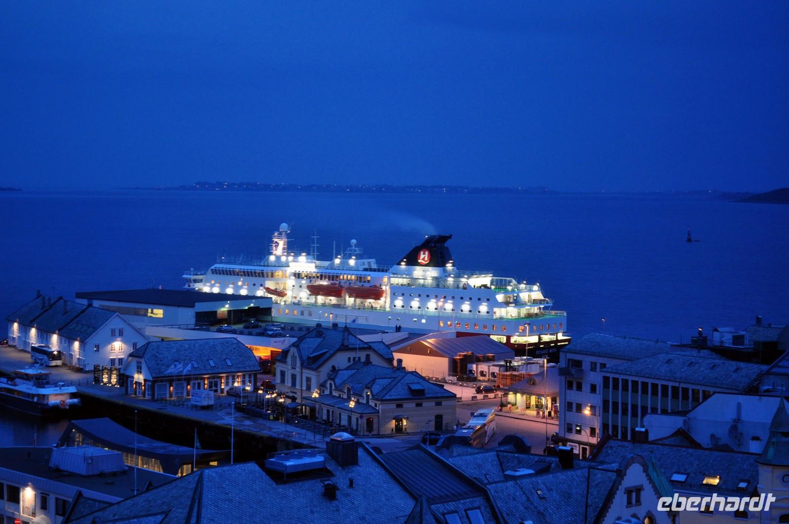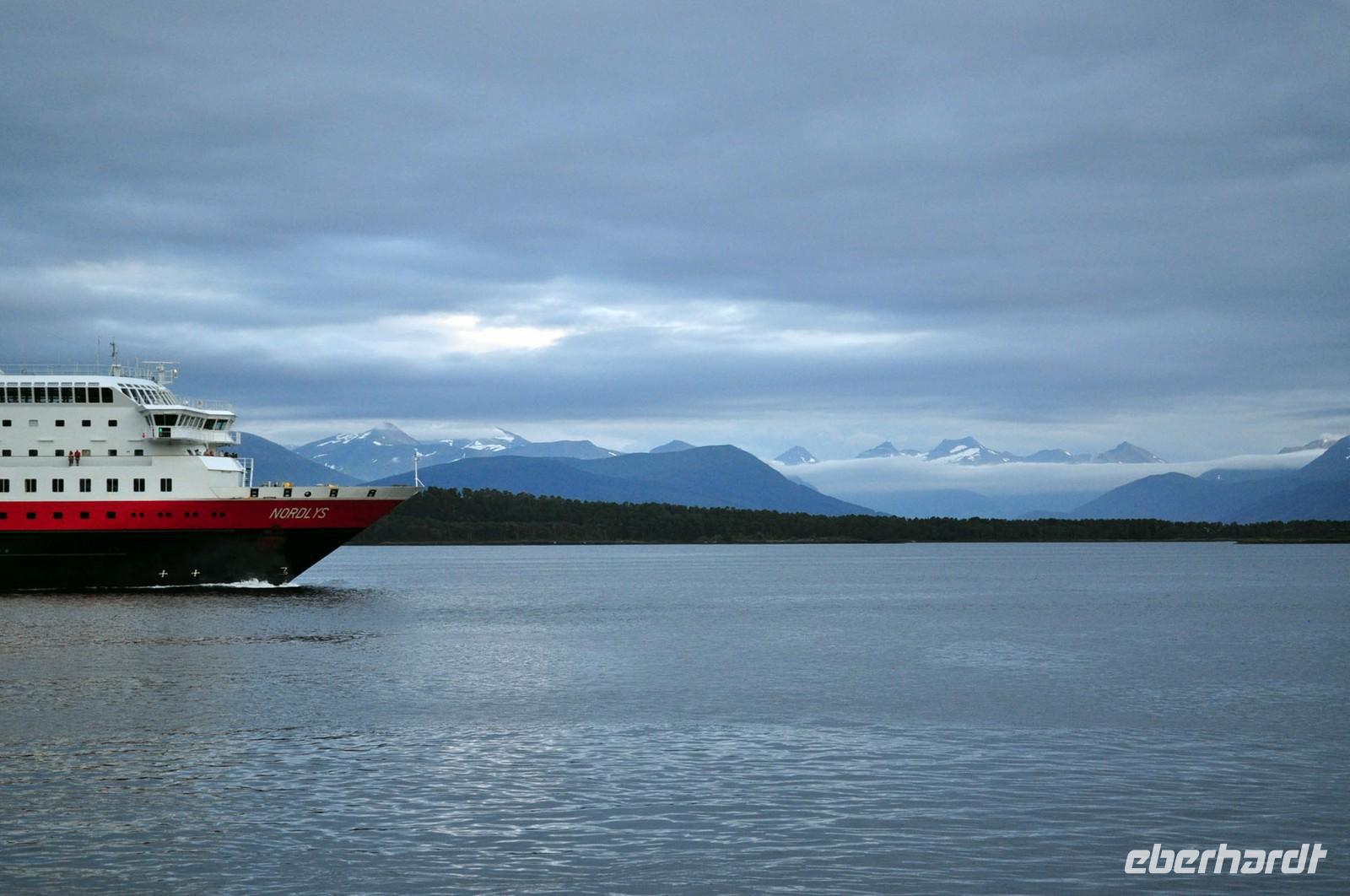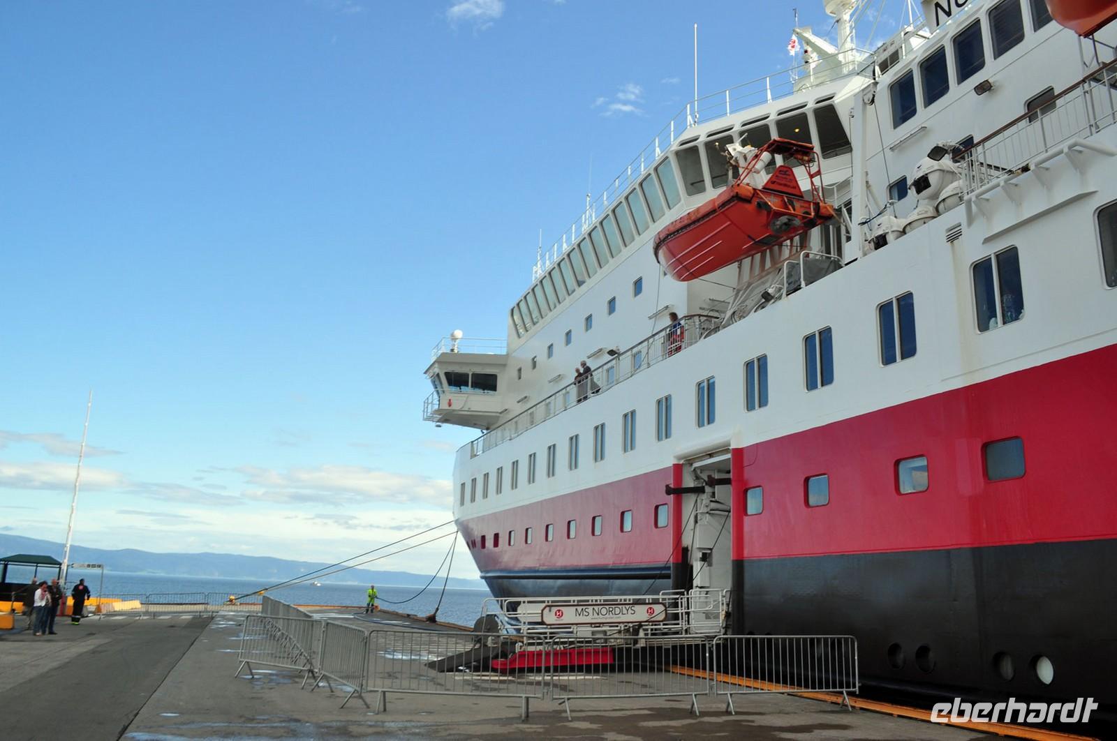 Nach einem sehr guten Abendessen verfolgten die meisten Gäste das Geschehen am Kai. Es trafen sich unsere südgehende MS Nordlys mit der nordgehenden MS Nordnorge.