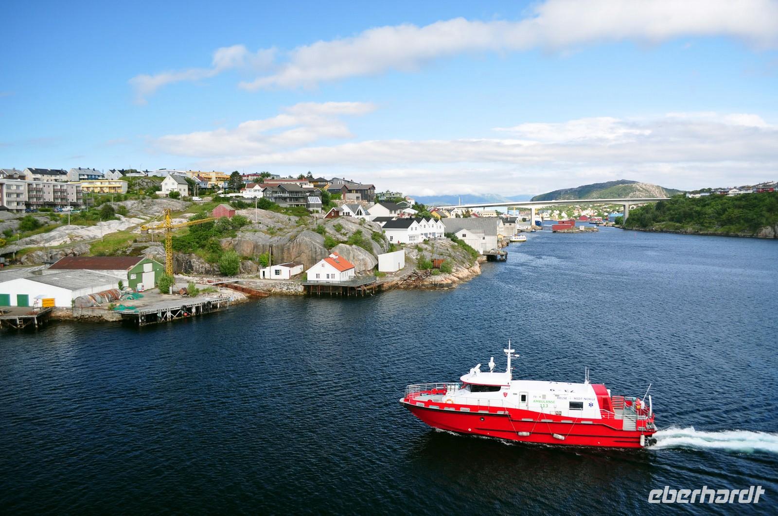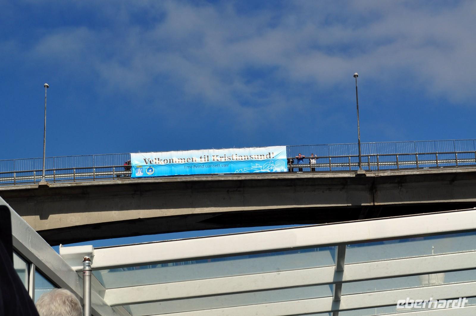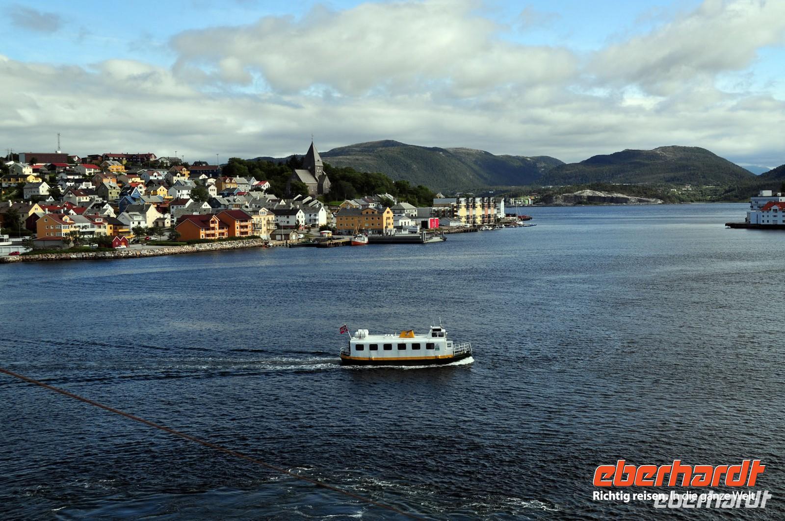 Am Nachmittag erreichten wir die auf drei Inseln verteilte Stadt Kristiansund. Früher ein wichtiges Zentrum des Kabeljaufischfangs und der damit verbundenen Stockfisch/Klippfischproduktion. Heute ist die Stadt eine wichtige Versorgungszentrale für den modernen Industriezweig Ölindustrie. Von hier starten die Versorgungsschiffe und die Hubschrauber mit den neuen Mannschaften hinaus zu den Ölplattformen in der Nordsee. Nur noch die alte Klippfischfrau, eine Bronzestatue am Hafen erinnert an die alten Zeiten des Fischfangs.