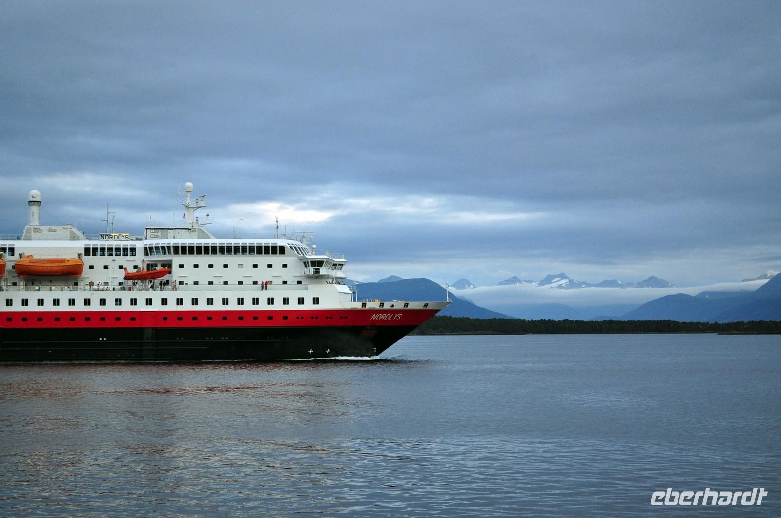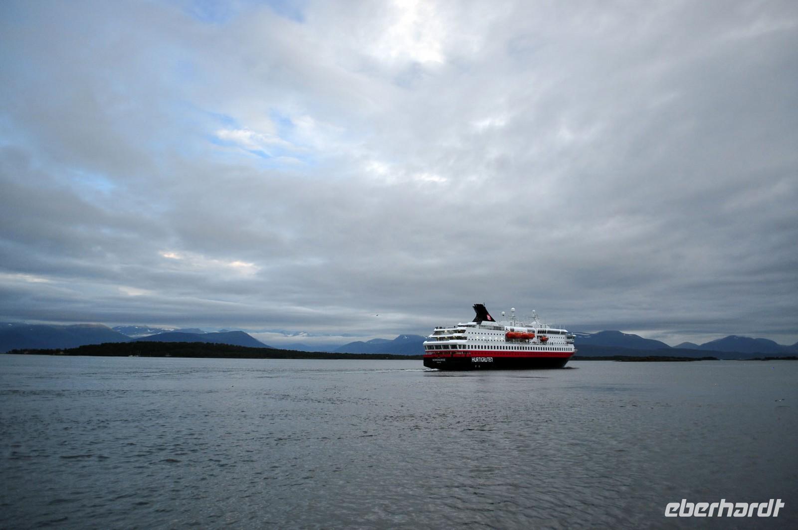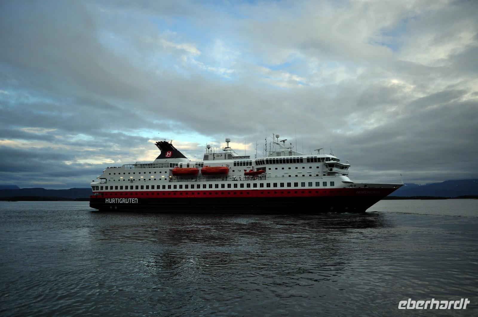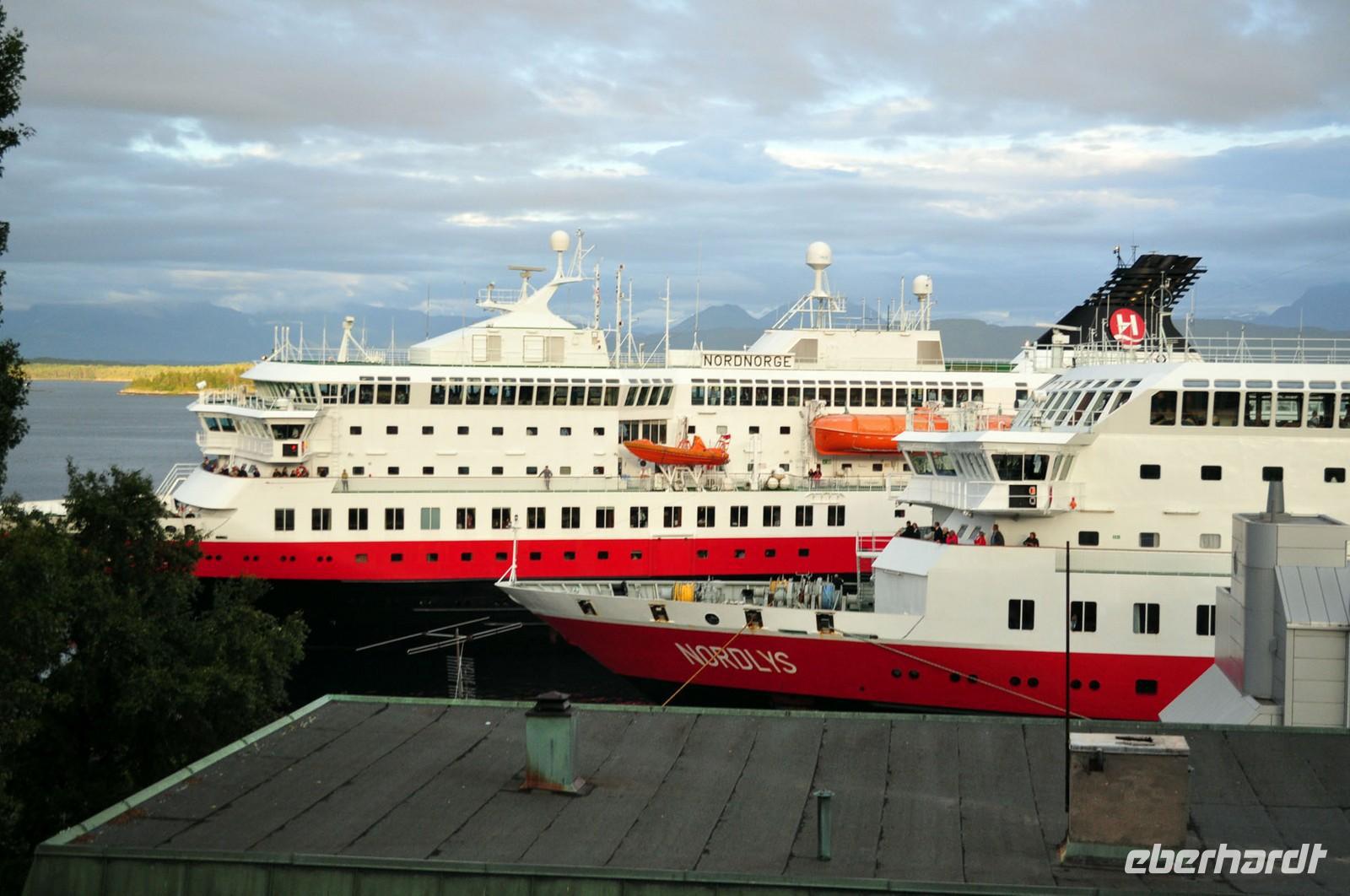 Dort werden wir Zeuge eines Treffen der besonderen Art. Hier treffen sich zwei Hurtigrutenschiffe, zum einen das nordgehende die MS Nordkapp unser südgehendes Schiff die MS Nordlys. Die Hurtigruten - mit ihren bekannten schwarz-roten unter königlicher Flagge fahrenden Postschiffe besser bekannt als "die Schönste Seereise der Welt".