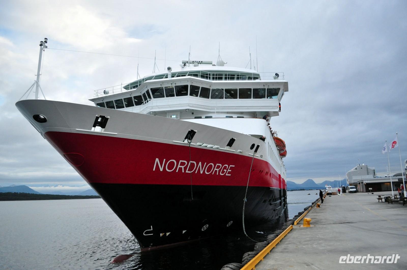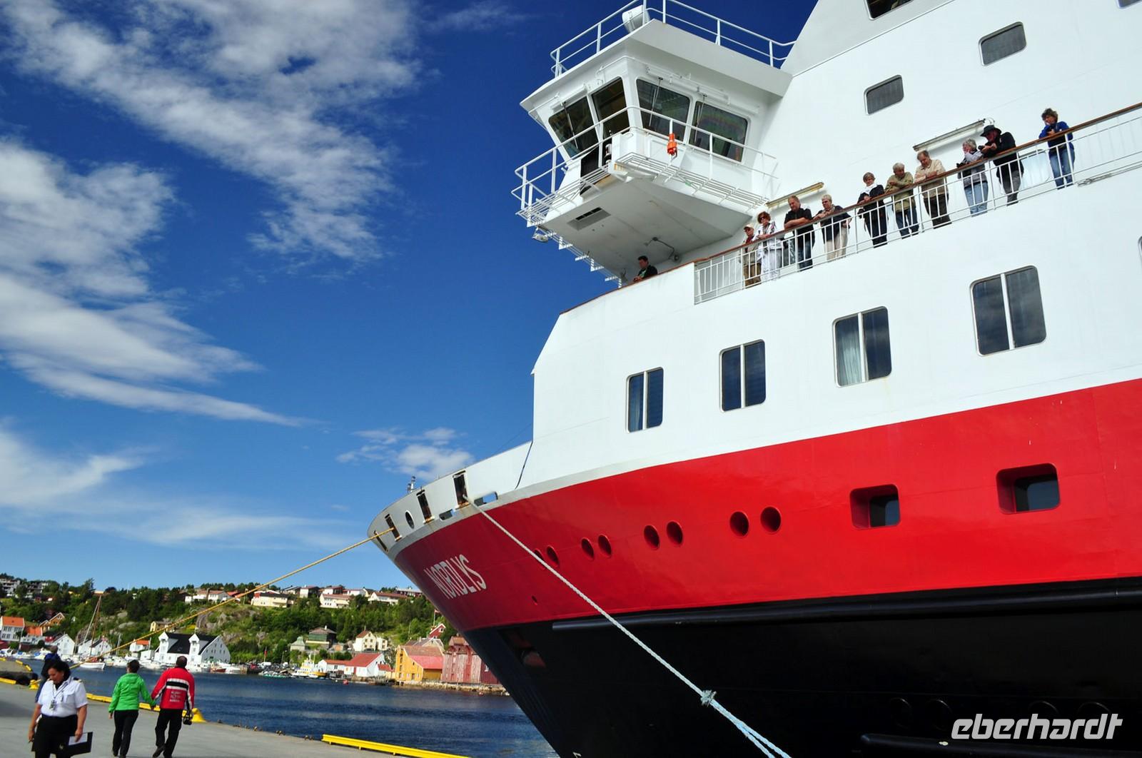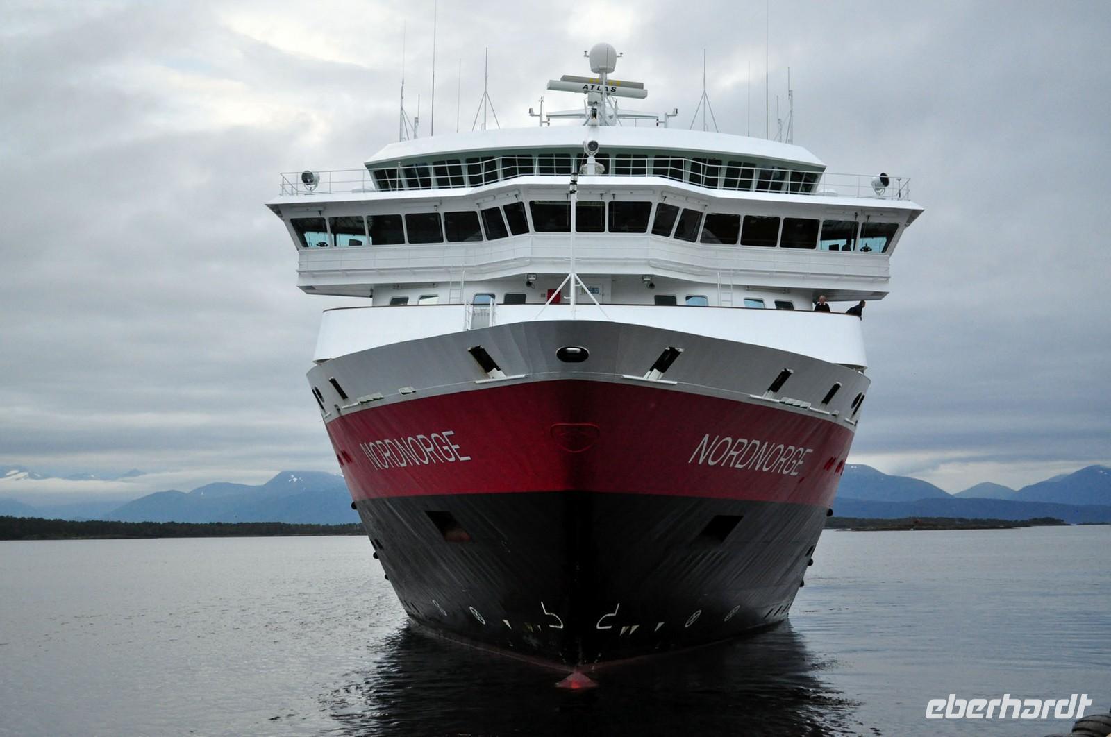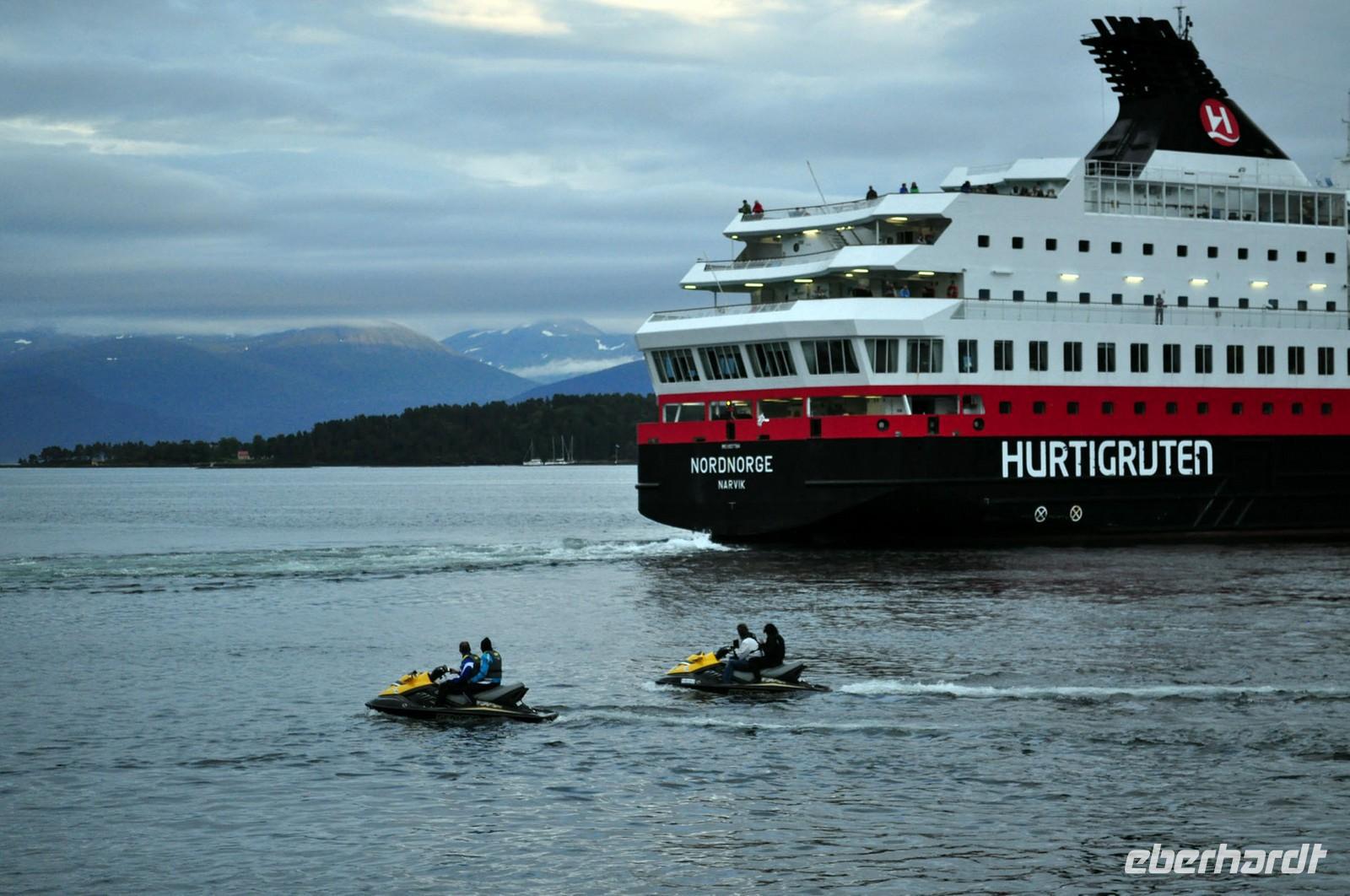 Dort werden wir Zeuge eines Treffen der besonderen Art. Hier treffen sich zwei Hurtigrutenschiffe, zum einen das nordgehende die MS Nordkapp unser südgehendes Schiff die MS Nordlys. Die Hurtigruten - mit ihren bekannten schwarz-roten unter königlicher Flagge fahrenden Postschiffe besser bekannt als "die Schönste Seereise der Welt".