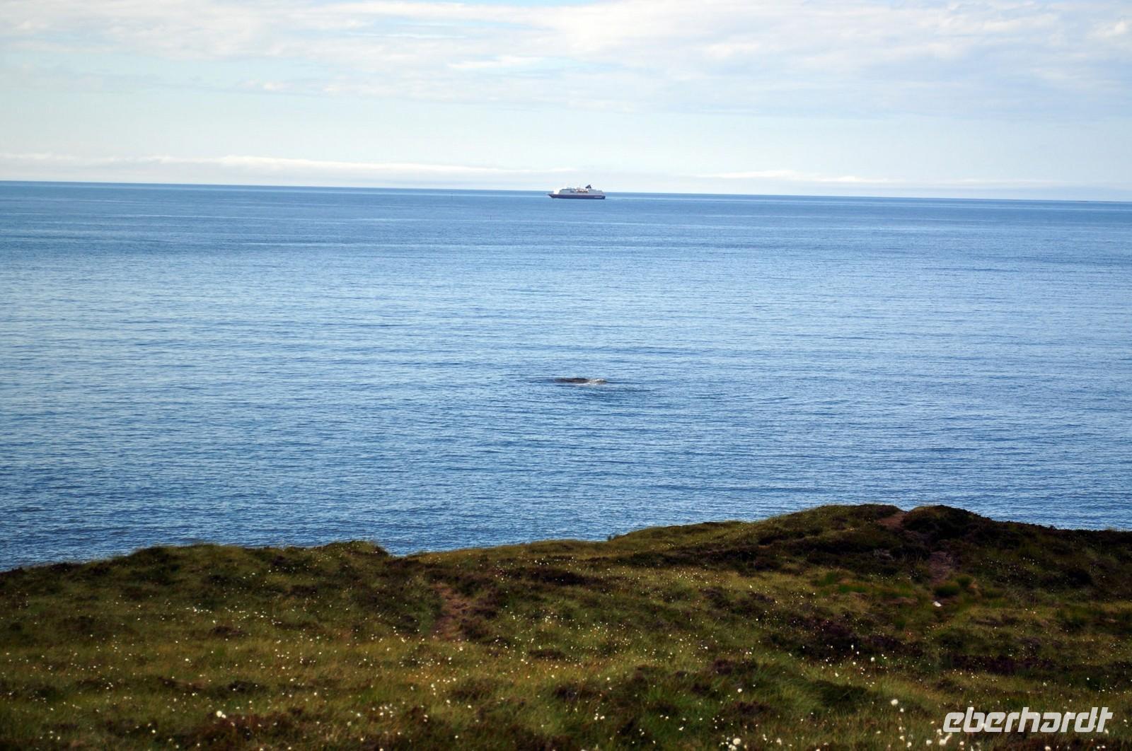 An einem Fotopunkt plötzlich Aufregung, alle verfügbaren Feldstecher werden ausgepackt, Teleobjektive auf geschraubt -> ein Moschusochse oder doch nur ein Busch, die Frage konnte nicht abschließend geklärt werden.