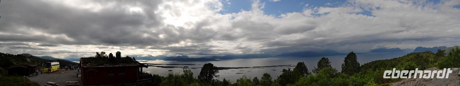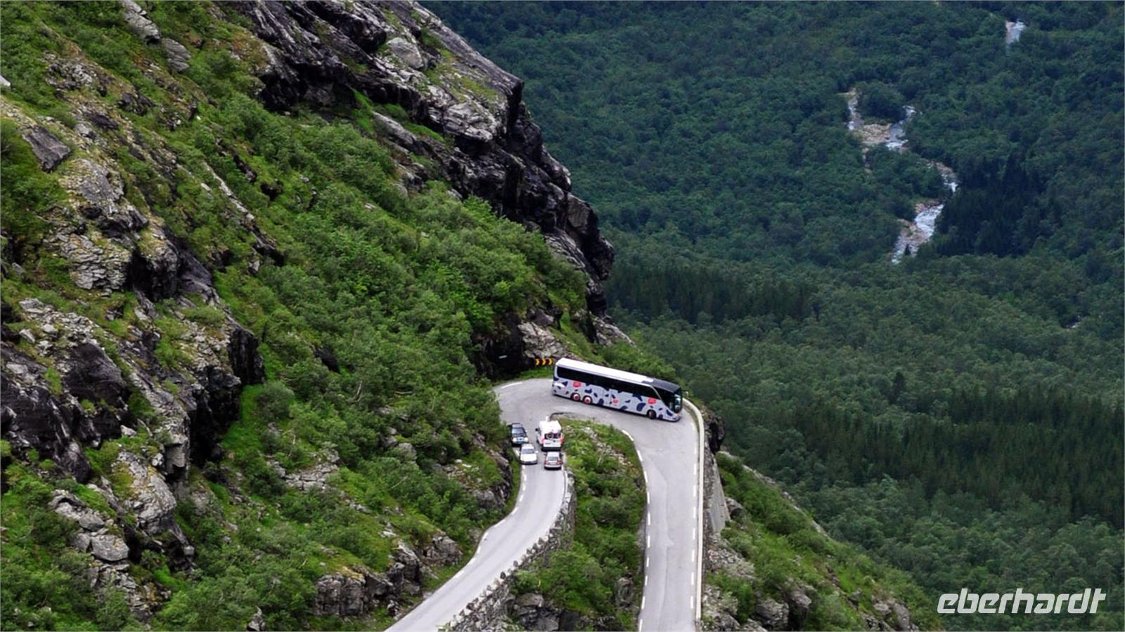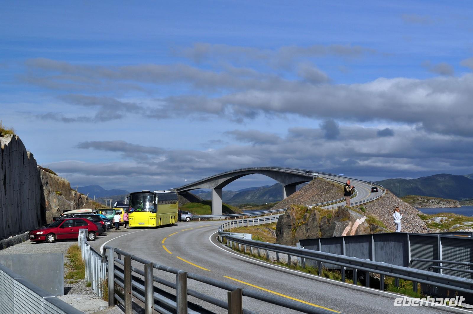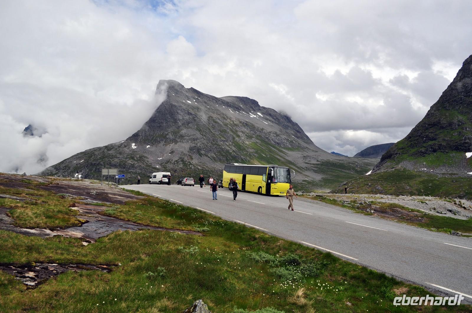 Vorher jedoch waren wir ziemlich überrascht als ein uns bekanntes Logo zunächst an uns vorbei fuhr, später auch lief. "Eberhardt-Travel". Wir trafen die "Hurtigrutenreise", die gerade auf dem Weg von Geiranger über die Trollstigen nach Molde war, um in unserem Hotel ihr Abendessen einzunehmen und am Abend wieder an Bord des nordgehend Hurtigrutenschiffes zu gehen.