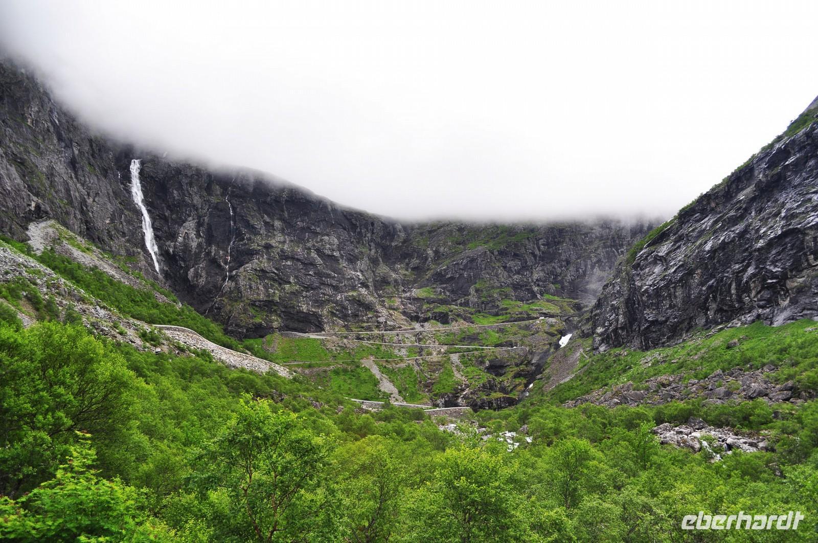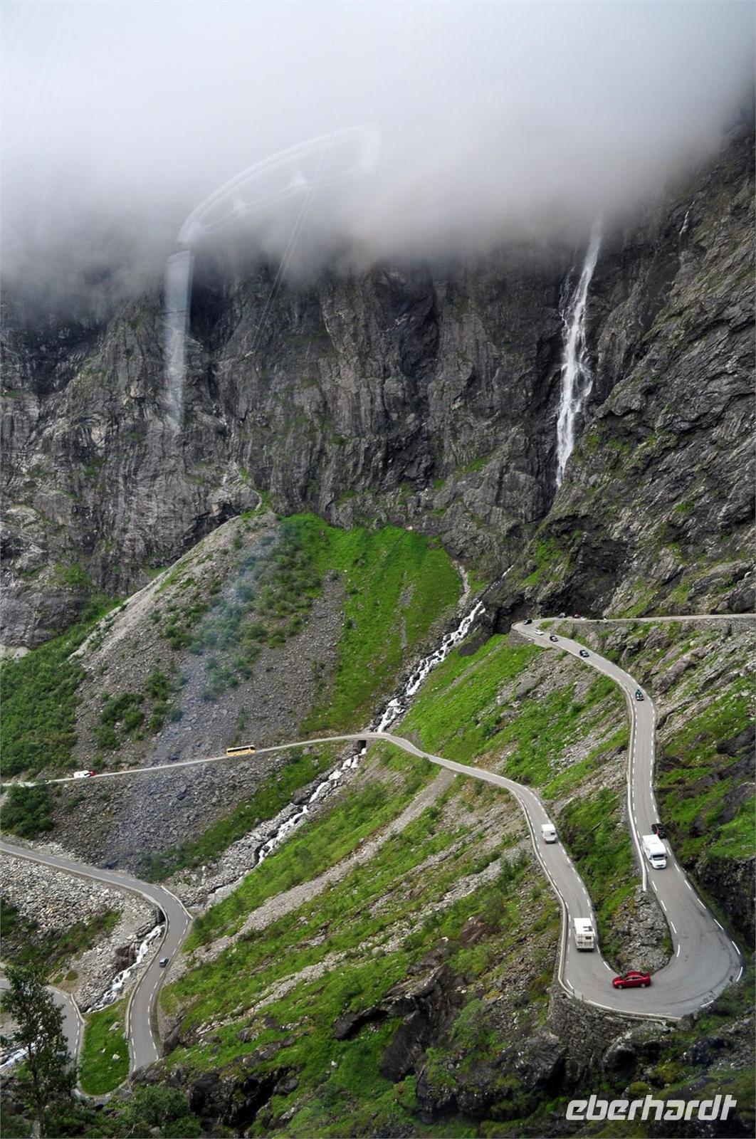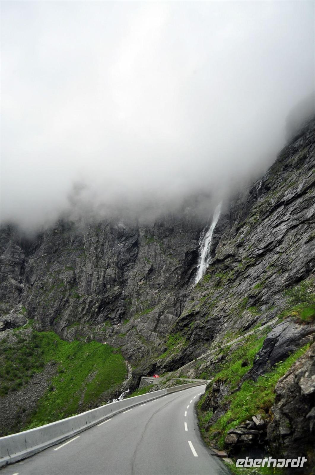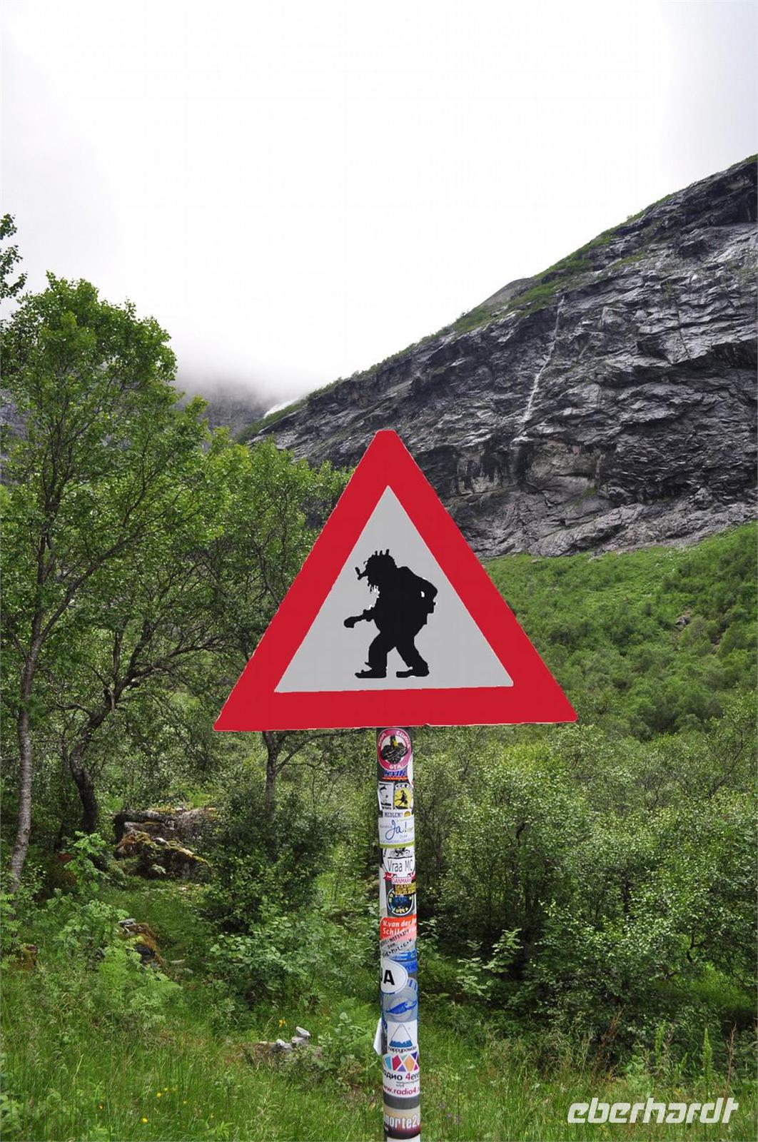 In Trollheim (dem Wohnort vieler Trolle) angekommen erreichten wir sehr bald den Parkplatz unterhalb der Trollstigen. Die Gipfel und das obere Ende der Strasse lag im dicken Nebel. Noch das berühmte Verkehrsschild "Achtung Trolle" photographiert bevor asiatische Reisegruppen die besten Fotoplätze belegen.