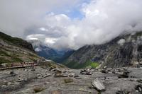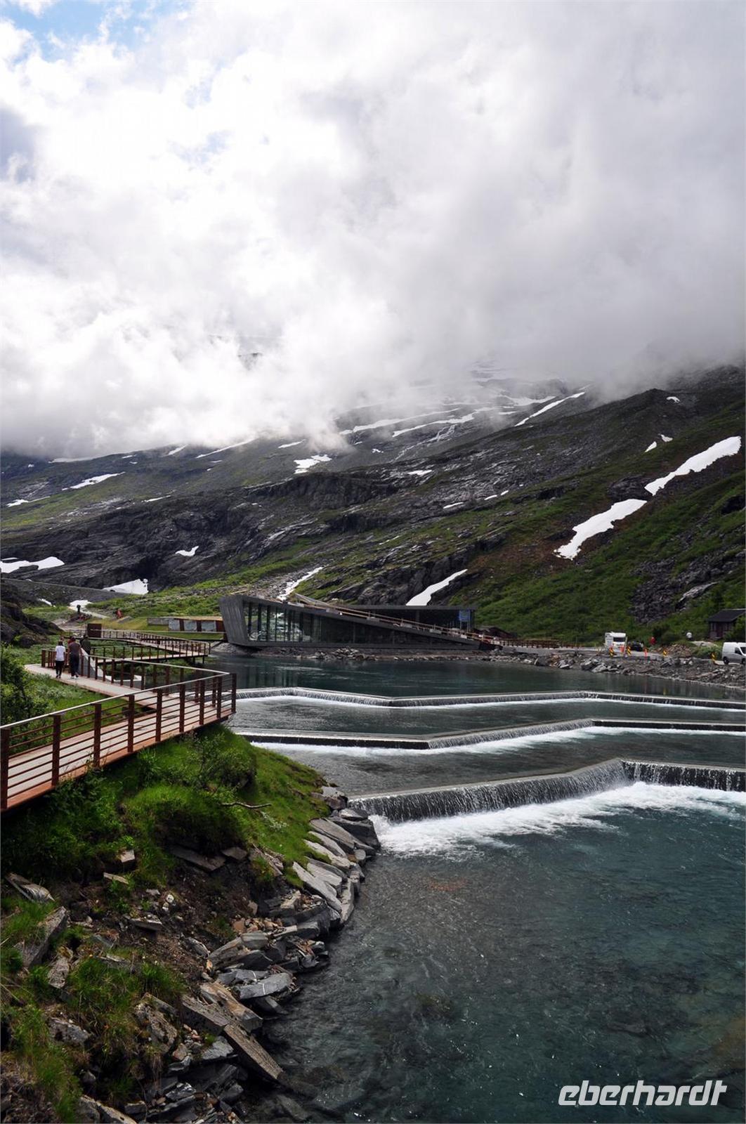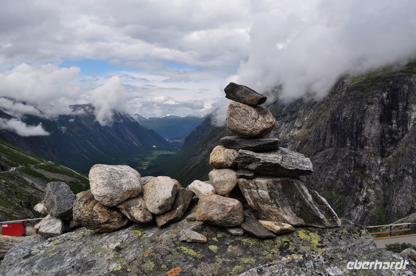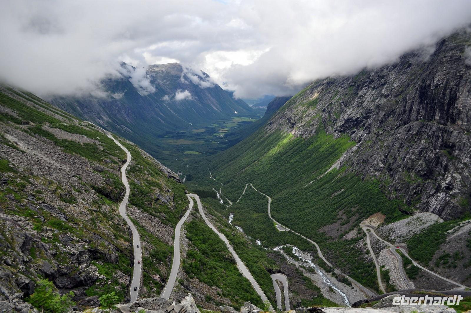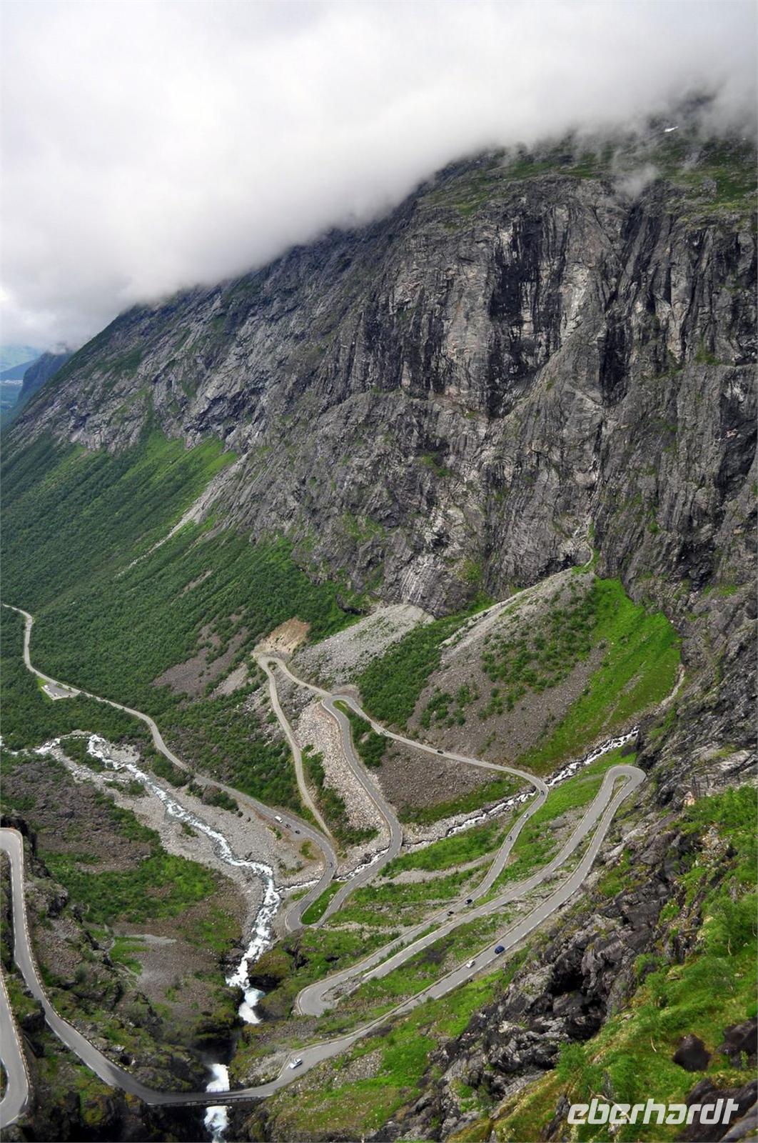In Trollheim (dem Wohnort vieler Trolle) angekommen erreichten wir sehr bald den Parkplatz unterhalb der Trollstigen. Die Gipfel und das obere Ende der Strasse lag im dicken Nebel. Noch das berühmte Verkehrsschild "Achtung Trolle" photographiert bevor asiatische Reisegruppen die besten Fotoplätze belegen.