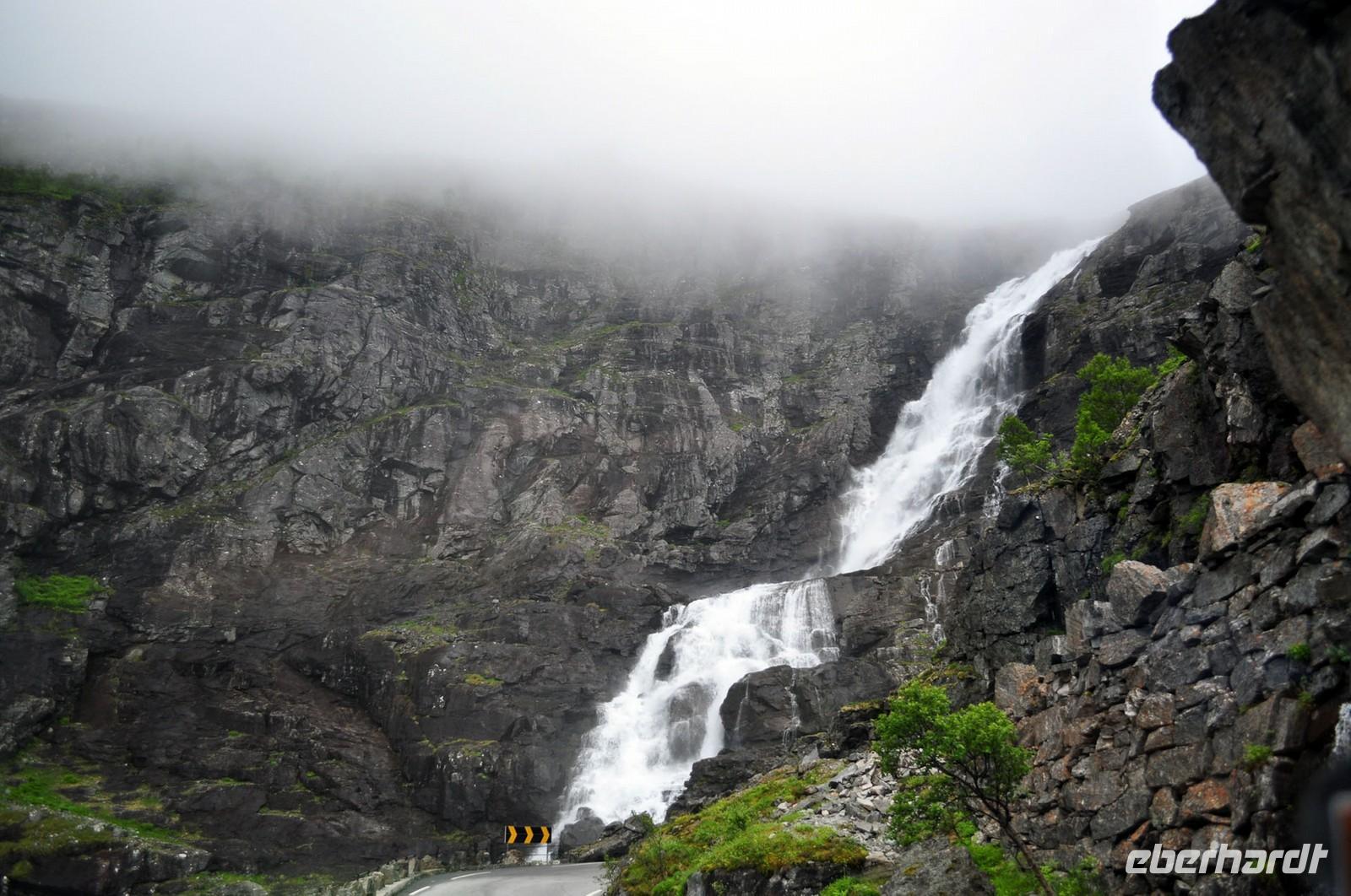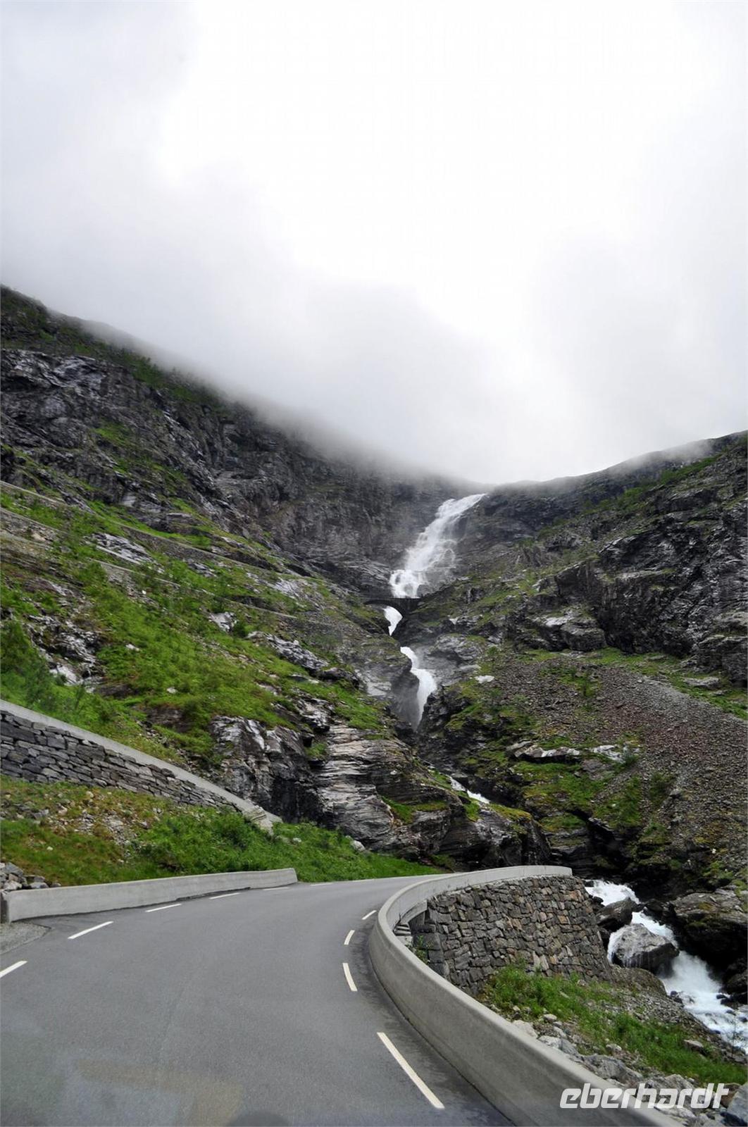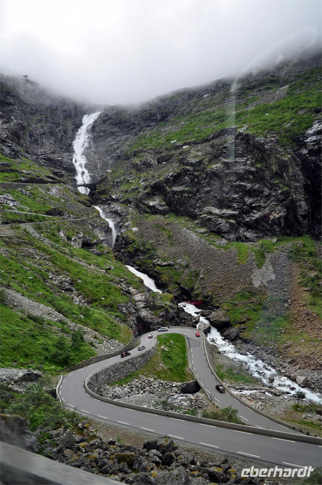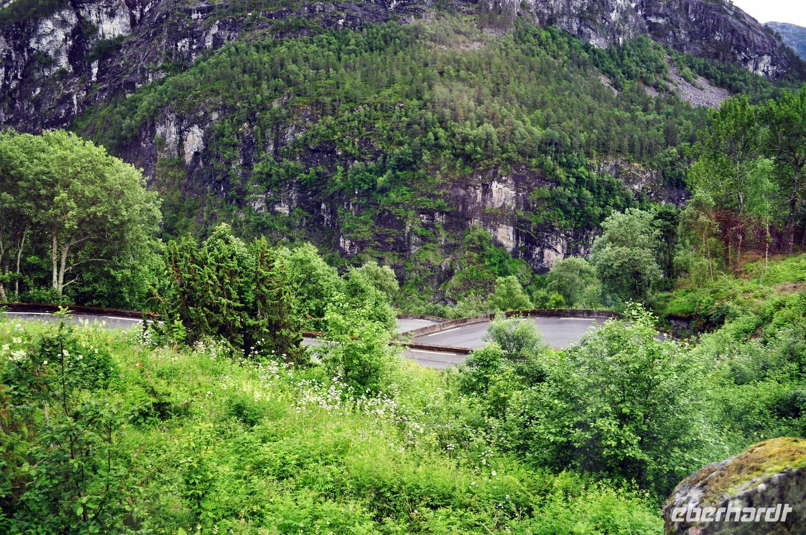 In elf Serpentinen windet sich die Sv 63 mit durchschnittlich 12% Steigung den Berg bzw. das steile Ende des Isterdals hinauf immer vorbei am Stigfossen, der sich hier über 320m in die Tiefe stürzt. Mit Aha, der norwegischen Musikgruppe und ihrem Titel "Stay on these roads" fahren wir schön langsam den Berg hinauf.