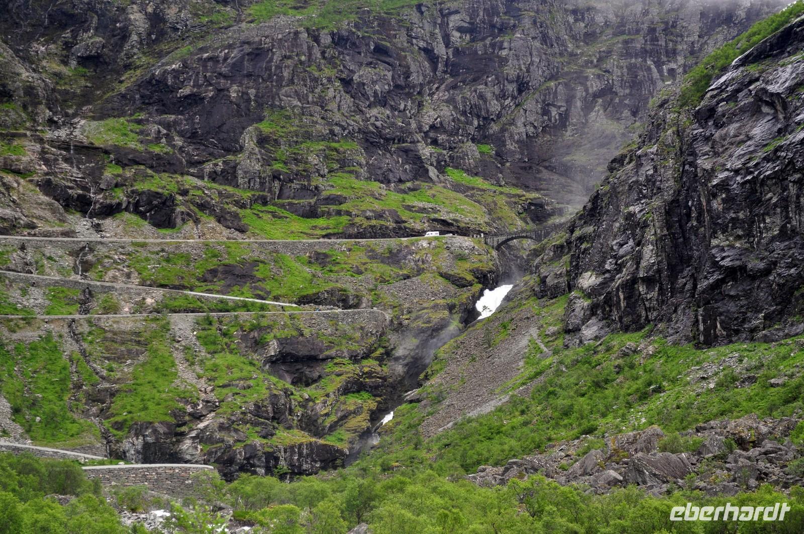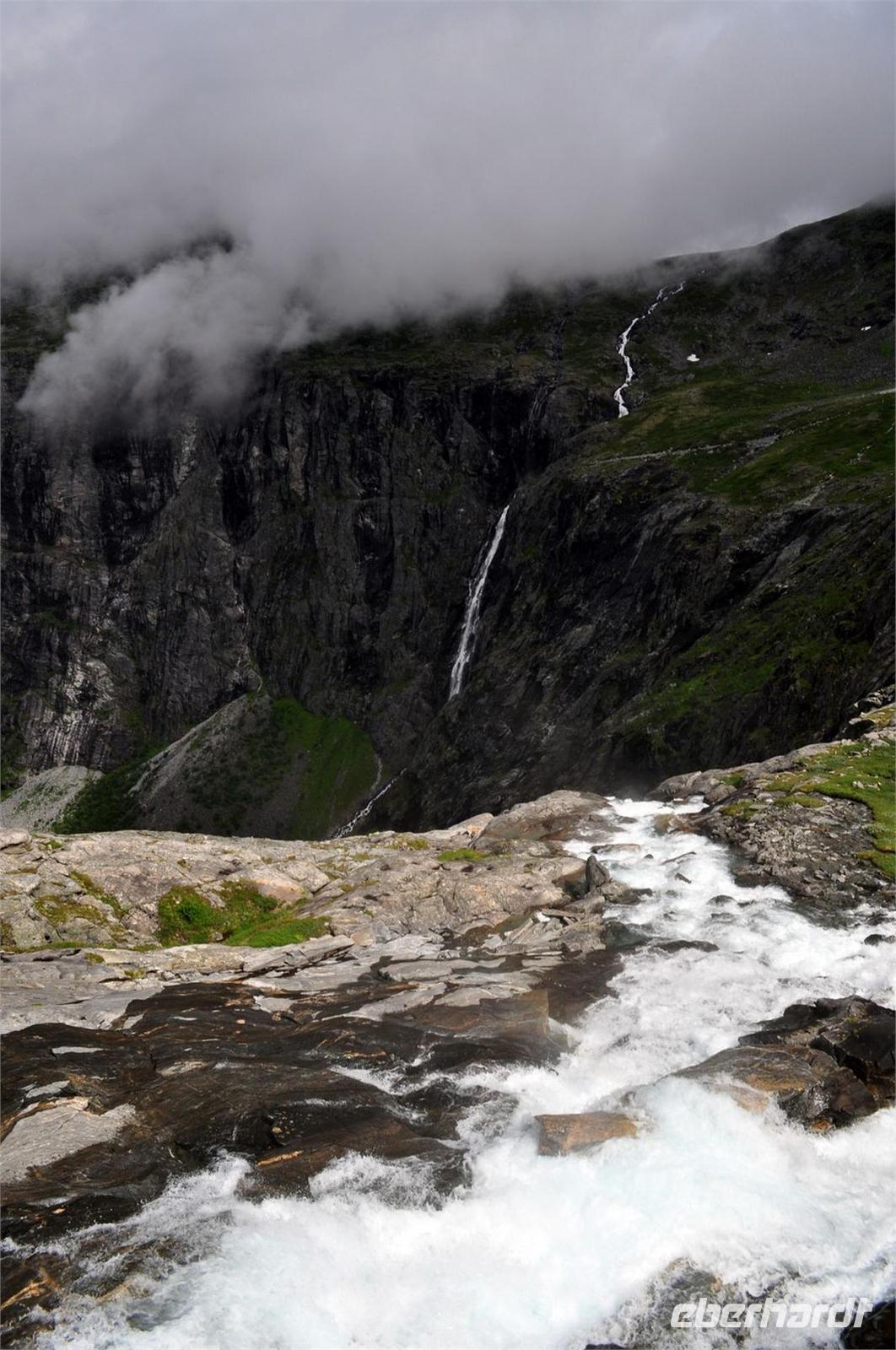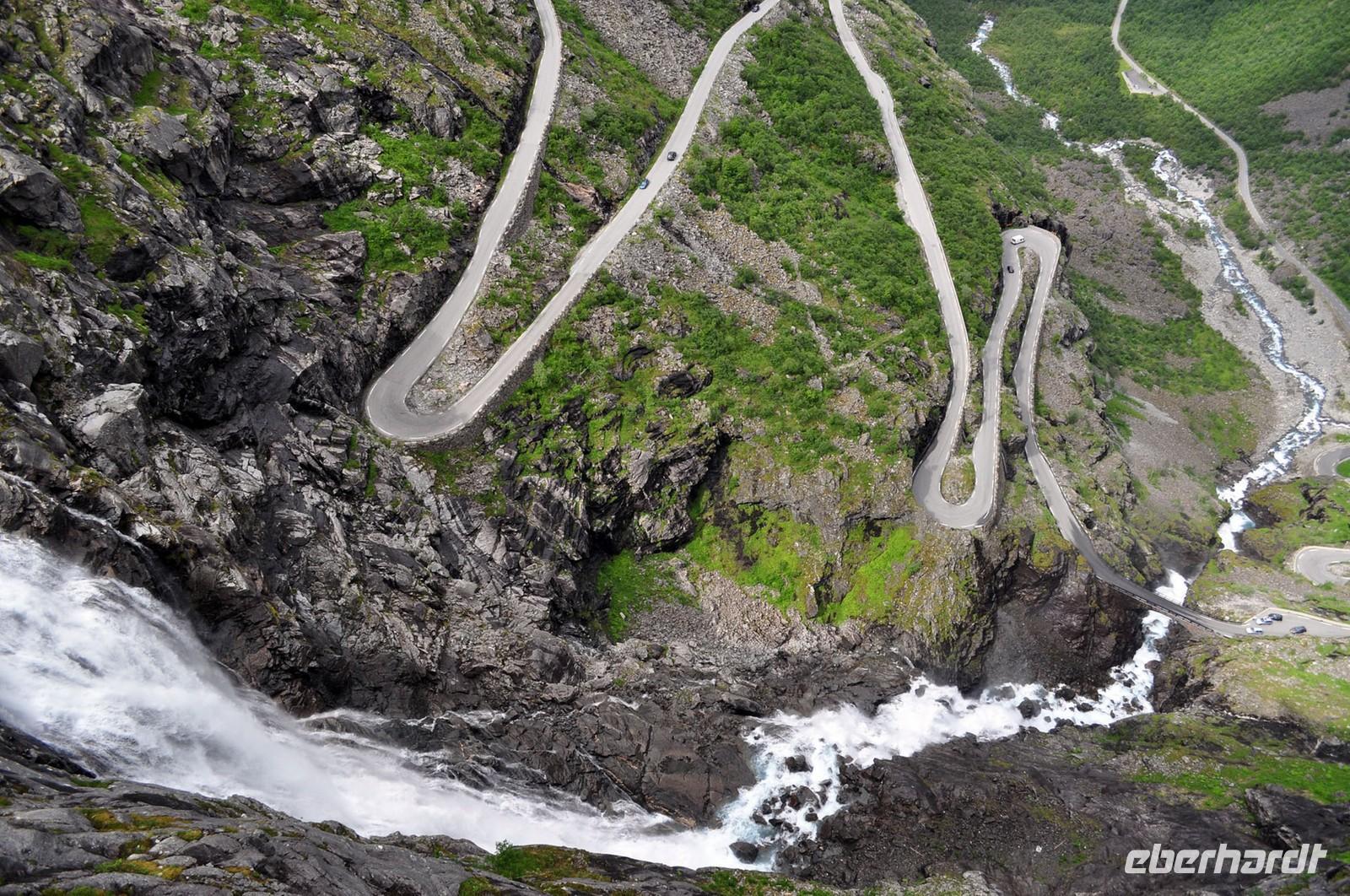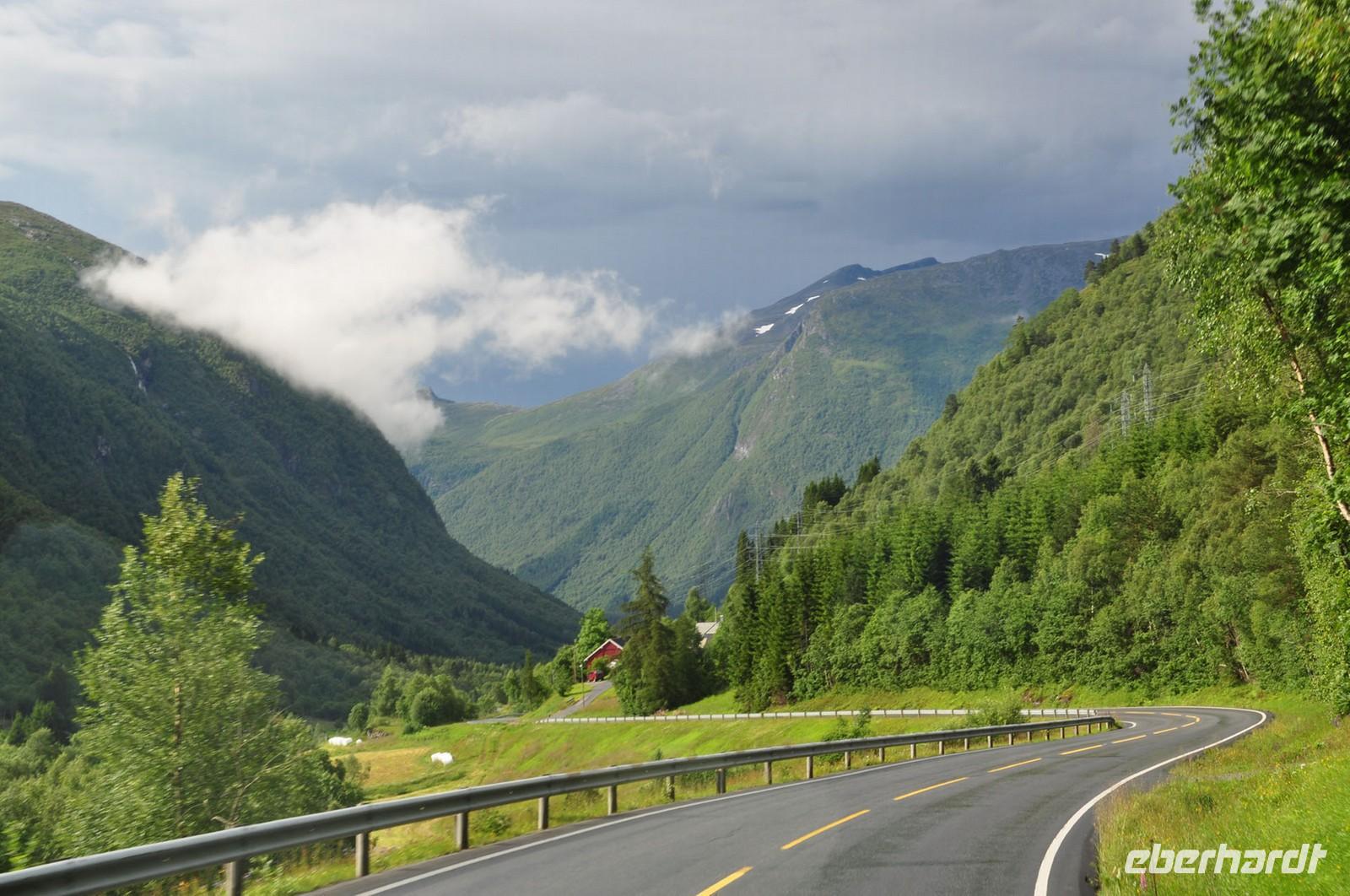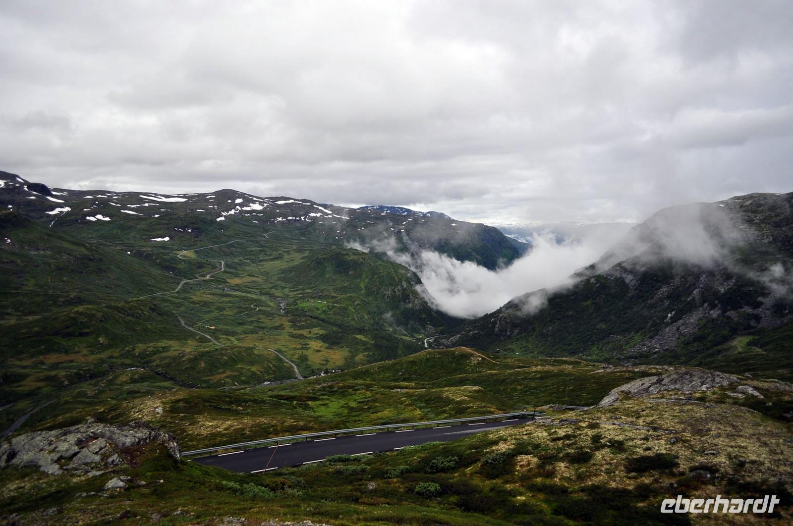 In elf Serpentinen windet sich die Sv 63 mit durchschnittlich 12% Steigung den Berg bzw. das steile Ende des Isterdals hinauf immer vorbei am Stigfossen, der sich hier über 320m in die Tiefe stürzt. Mit Aha, der norwegischen Musikgruppe und ihrem Titel "Stay on these roads" fahren wir schön langsam den Berg hinauf.