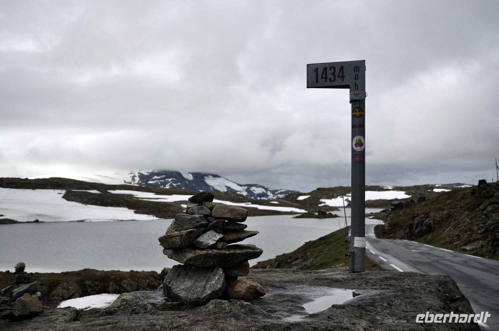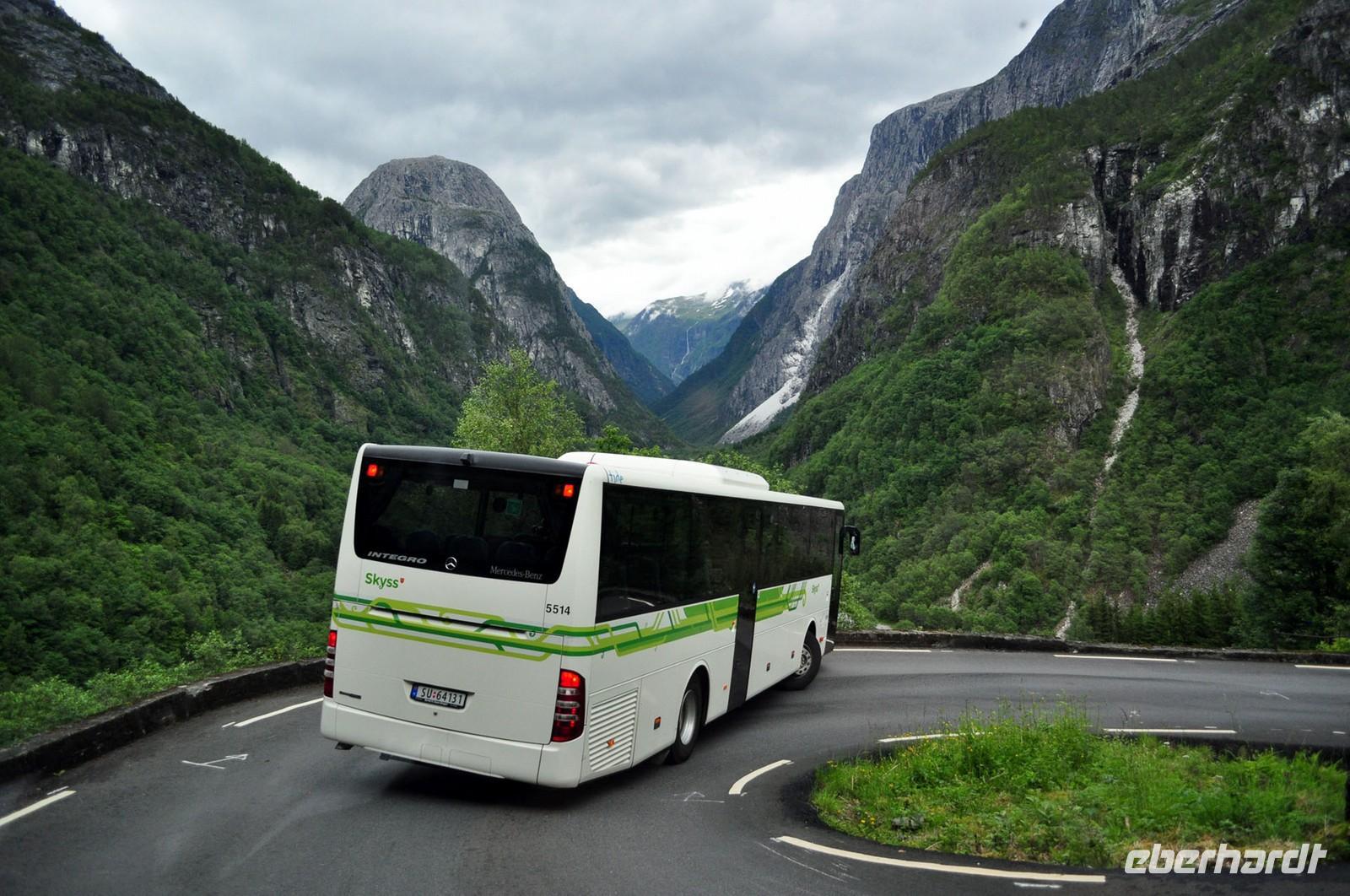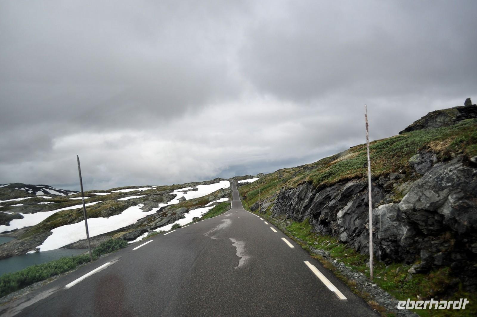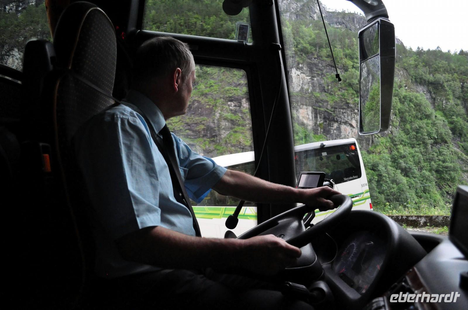 In elf Serpentinen windet sich die Sv 63 mit durchschnittlich 12% Steigung den Berg bzw. das steile Ende des Isterdals hinauf immer vorbei am Stigfossen, der sich hier über 320m in die Tiefe stürzt. Mit Aha, der norwegischen Musikgruppe und ihrem Titel "Stay on these roads" fahren wir schön langsam den Berg hinauf.