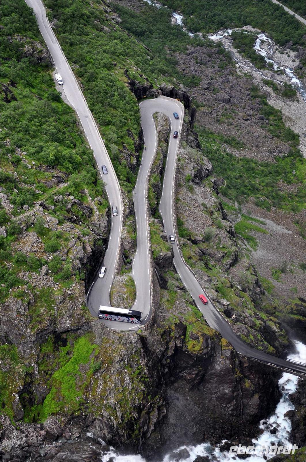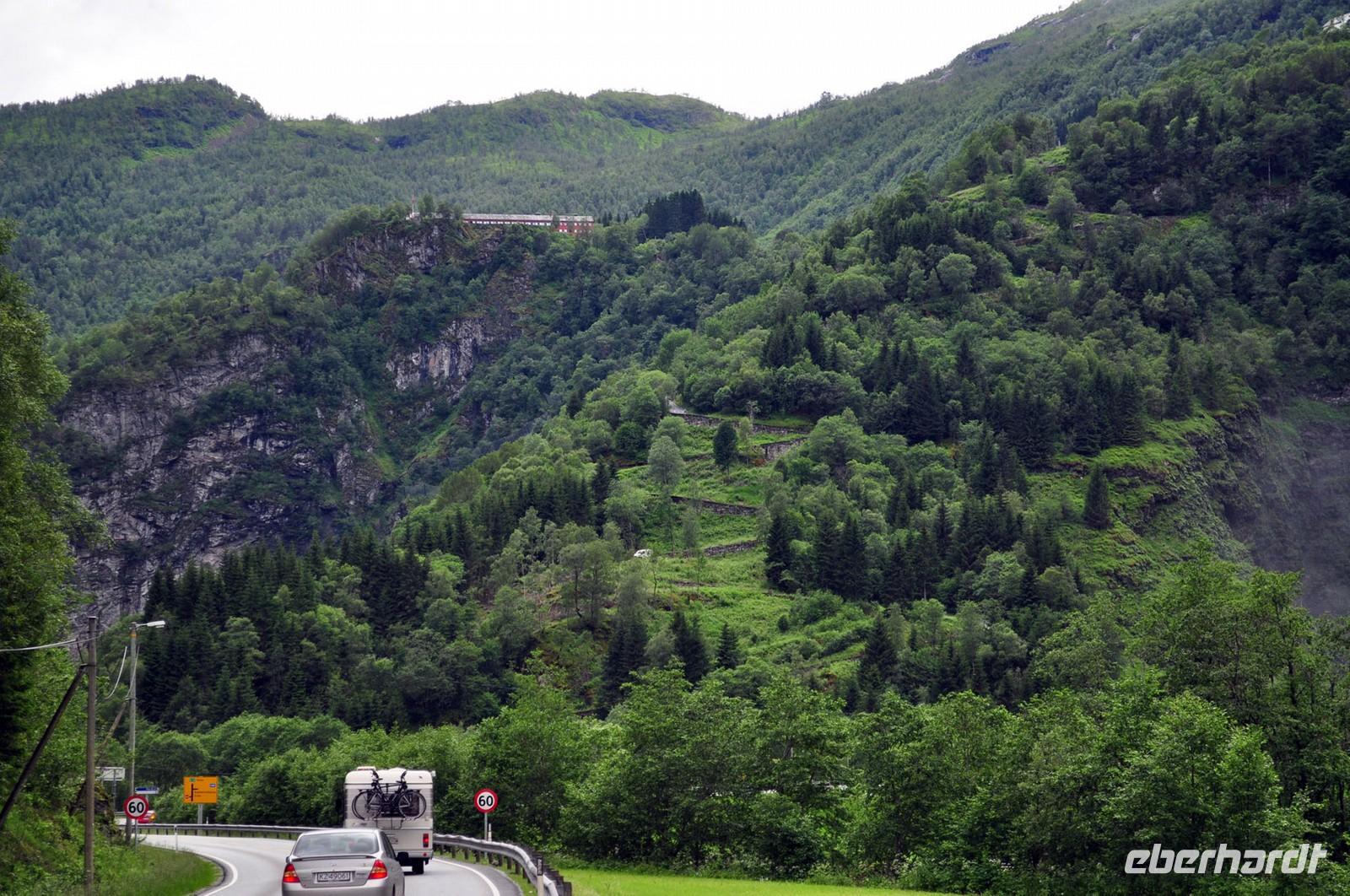 Aber Stalheim ist nicht nur bekannt für seinen tollen Ausblick, sondern auch für die steilste Strasse des Landes. Mit durchschnittlich 18% Gefälle überwinden wir in 13 Haarnadelkurven, die 350 Höhenmeter auf einer Länge von nur 1,5 km.