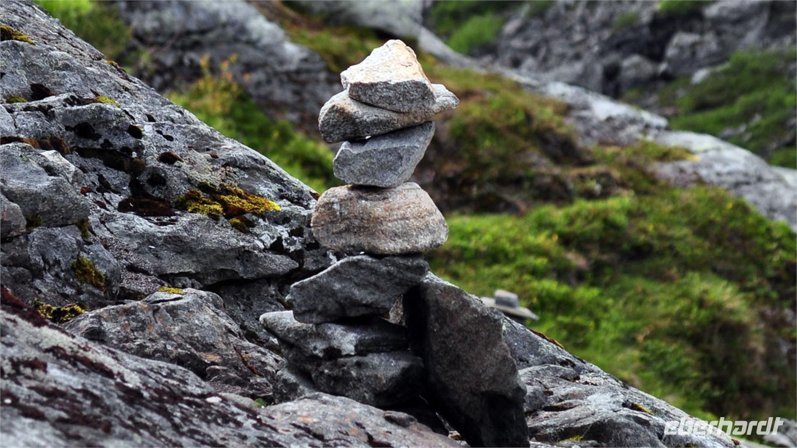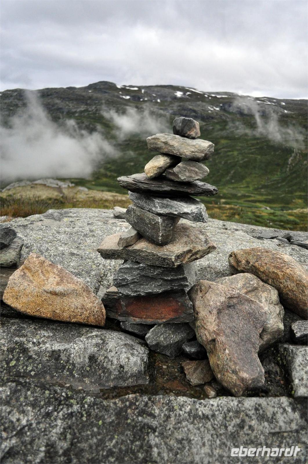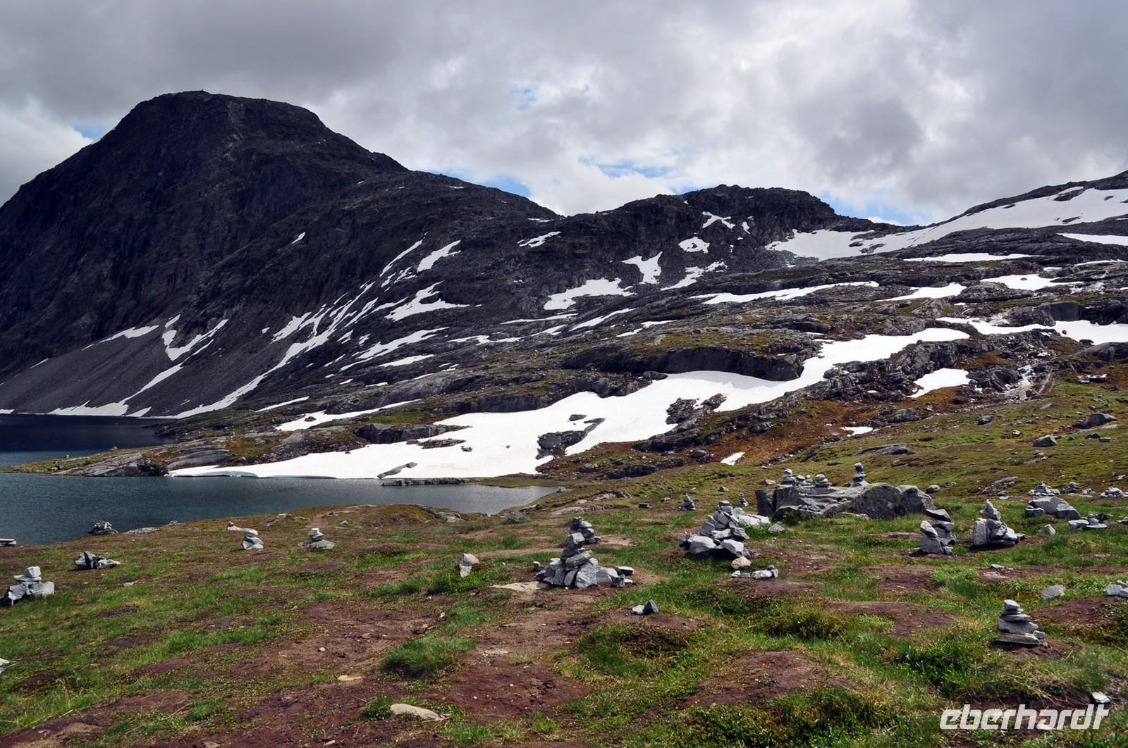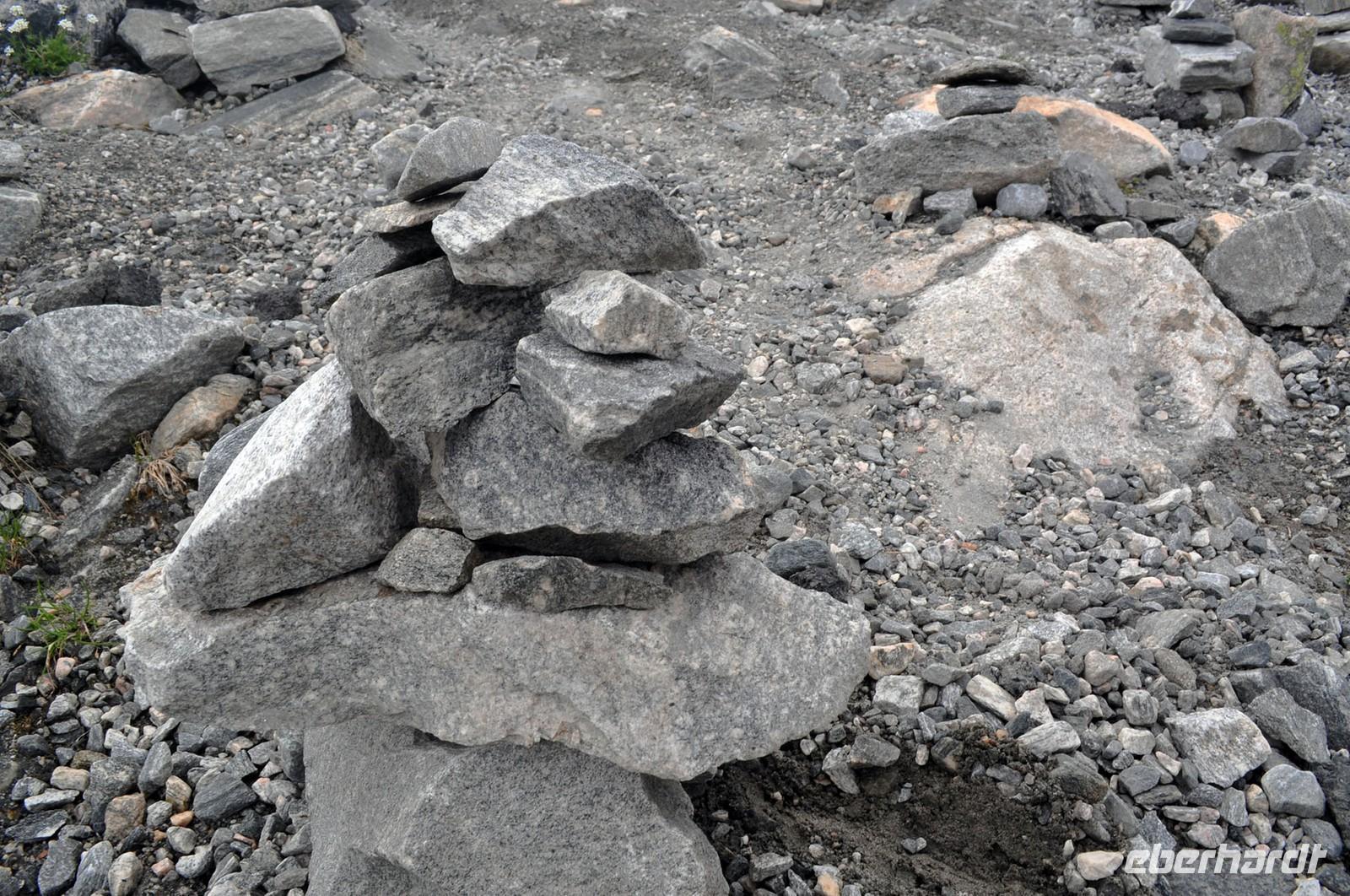 Nachdem noch für eine gute Abfahrt fleißig Steinmännchen gebaut worden (um die Trolle gnädig zu stimmen), ging es wieder talwärts vorbei an Gletscherseen (mit Eis), Schneefeldern und bizarren Hochgebirgsformationen.
