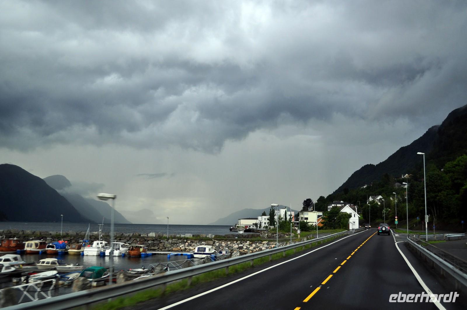 Vorbei an Voss erreichten wir am frühen Abend die regenreichsten Stadt Norwegens, die Stadt in der im Jahr dreimal soviel Niederschlag fällt wie in Hamburg. Und "wo böse Zungen behaupten, die Menschen hier seien mit Schwimmhäuten an den Füssen zur Welt gekommen und der Regenschirm sei ihr liebstes Utensil." (Reise Know How - Norwegen)