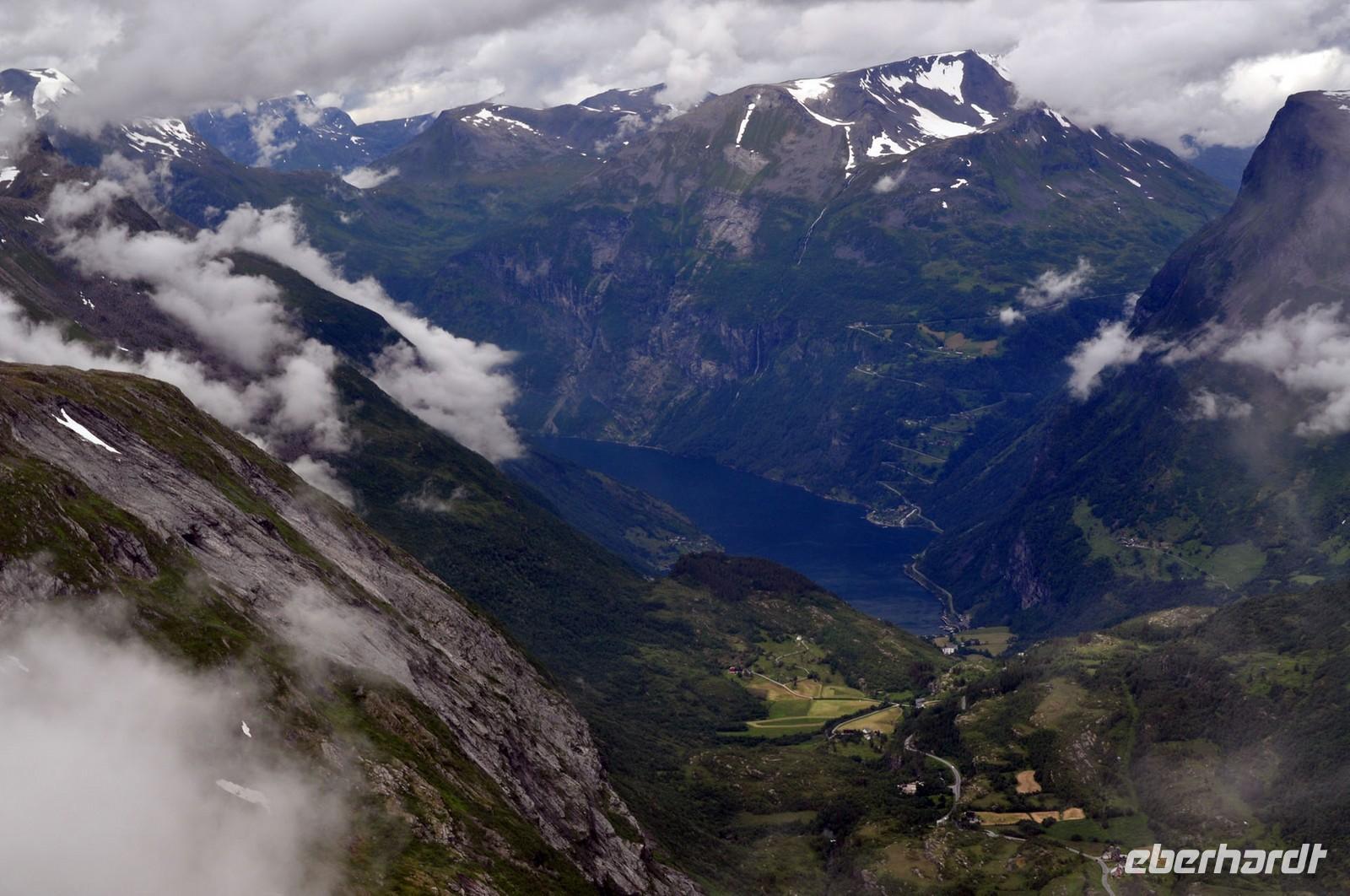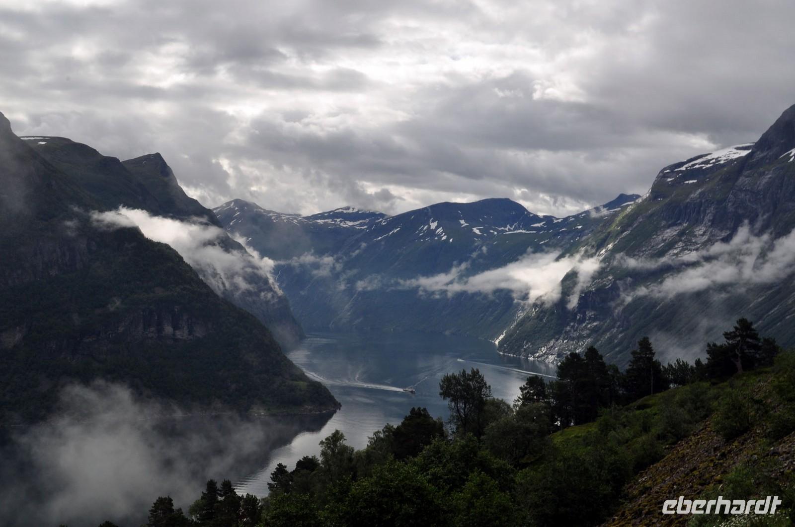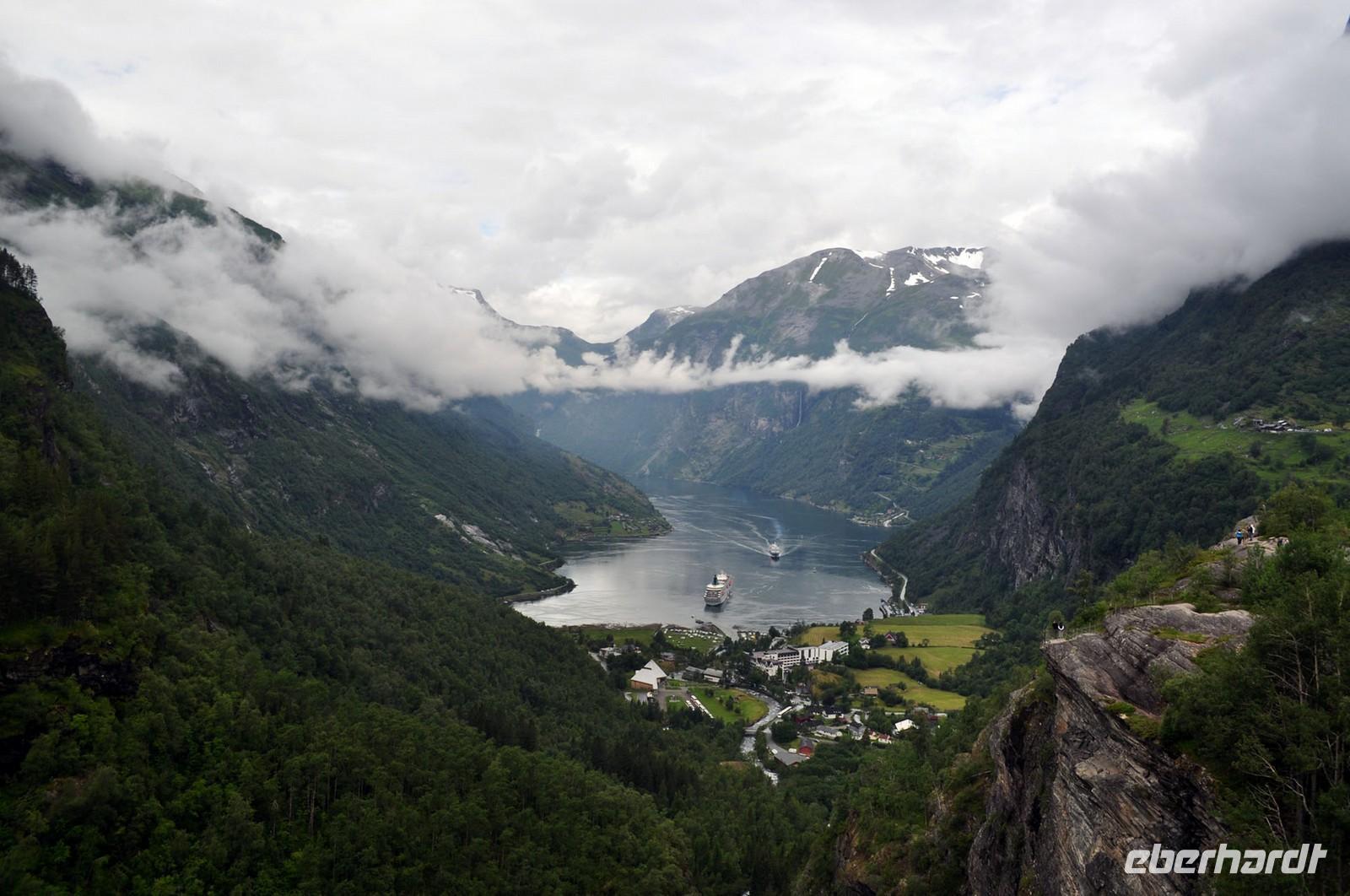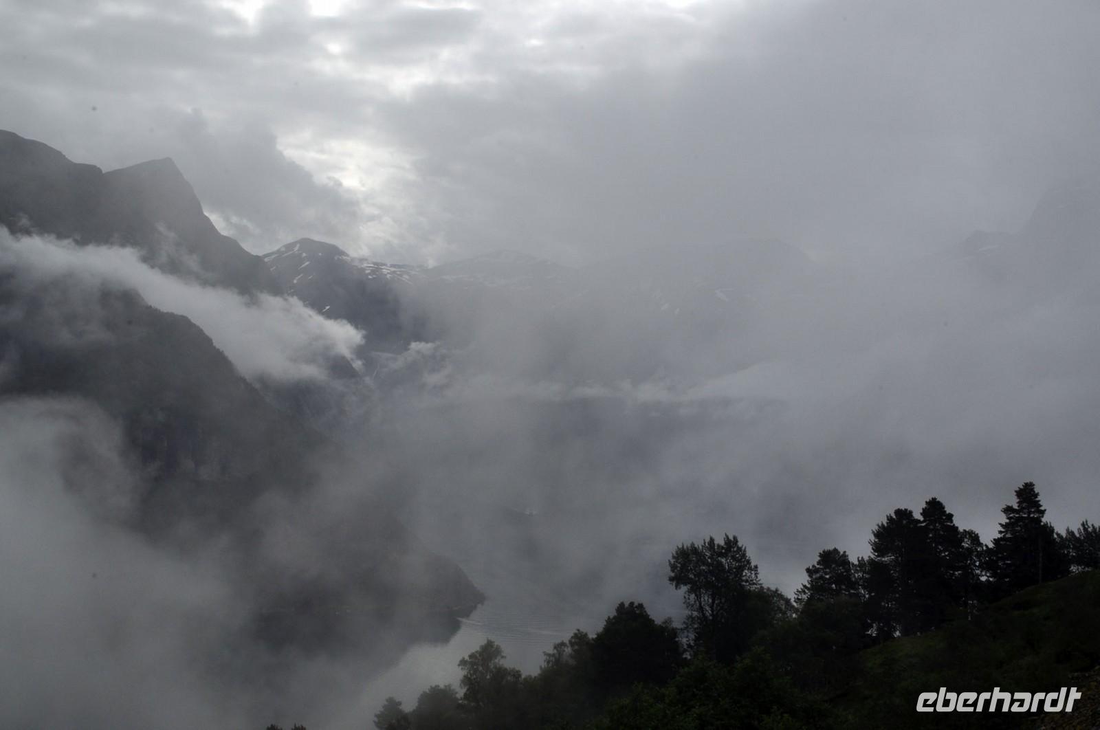 Bei mäßigen Wetter starten wir zu einem weiteren Höhepunkt unserer Reise dem Geiranger Fjord. Die Fjorde Nebel verhangen. Auch an einem Fotopunkt oberhalb von Hellesylt dem Ort am Eingang zum Fjord. Aber auch in diesem Fall, riss der Himmel plötzlich auf und gab den Blick frei auf den berühmtesten Fjord Norwegens.