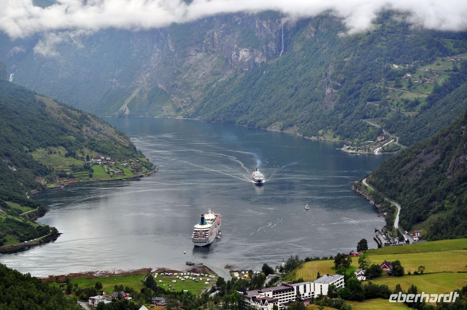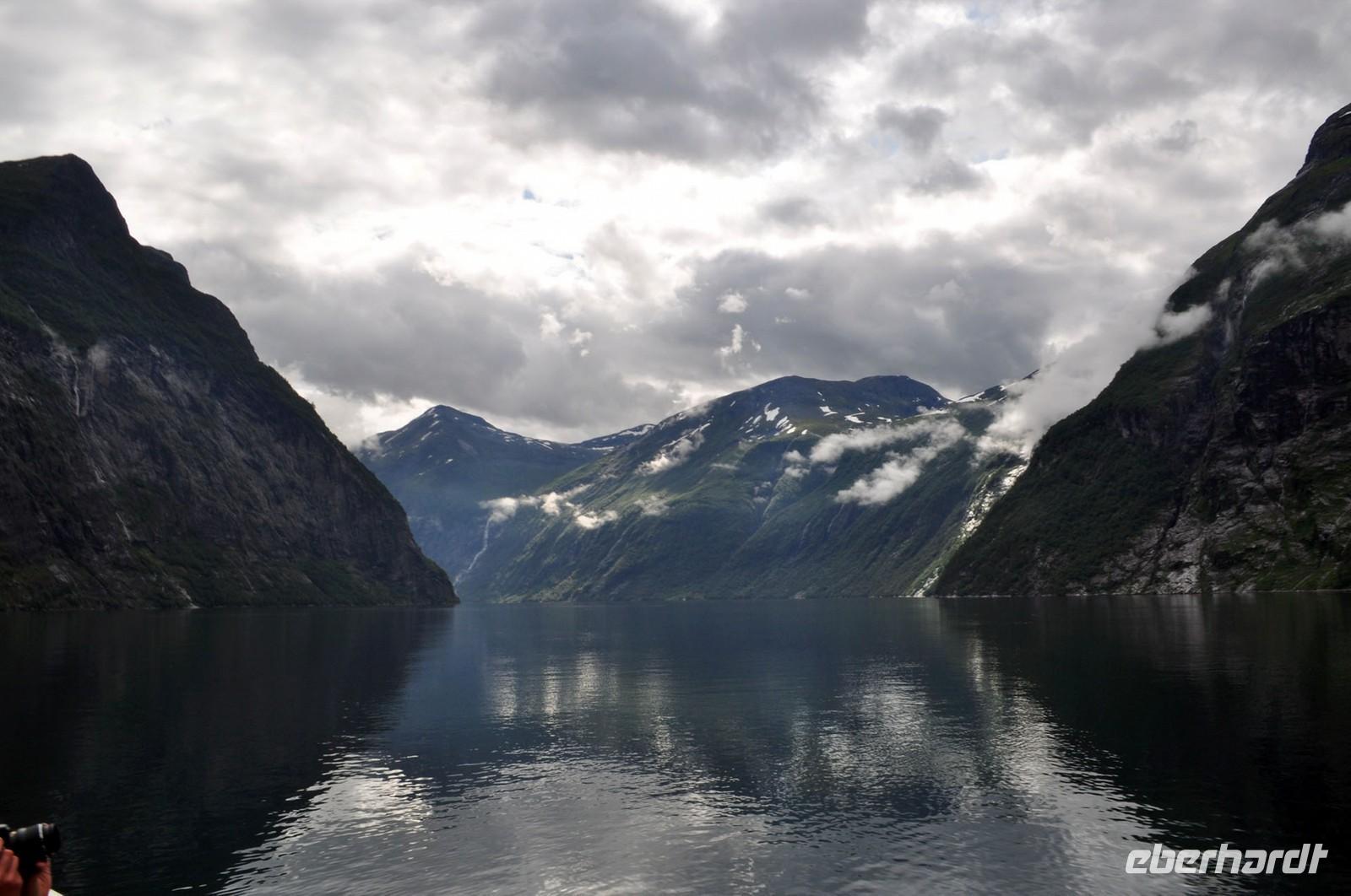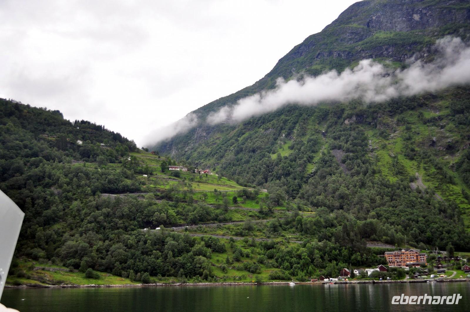 Bei mäßigen Wetter starten wir zu einem weiteren Höhepunkt unserer Reise dem Geiranger Fjord. Die Fjorde Nebel verhangen. Auch an einem Fotopunkt oberhalb von Hellesylt dem Ort am Eingang zum Fjord. Aber auch in diesem Fall, riss der Himmel plötzlich auf und gab den Blick frei auf den berühmtesten Fjord Norwegens.