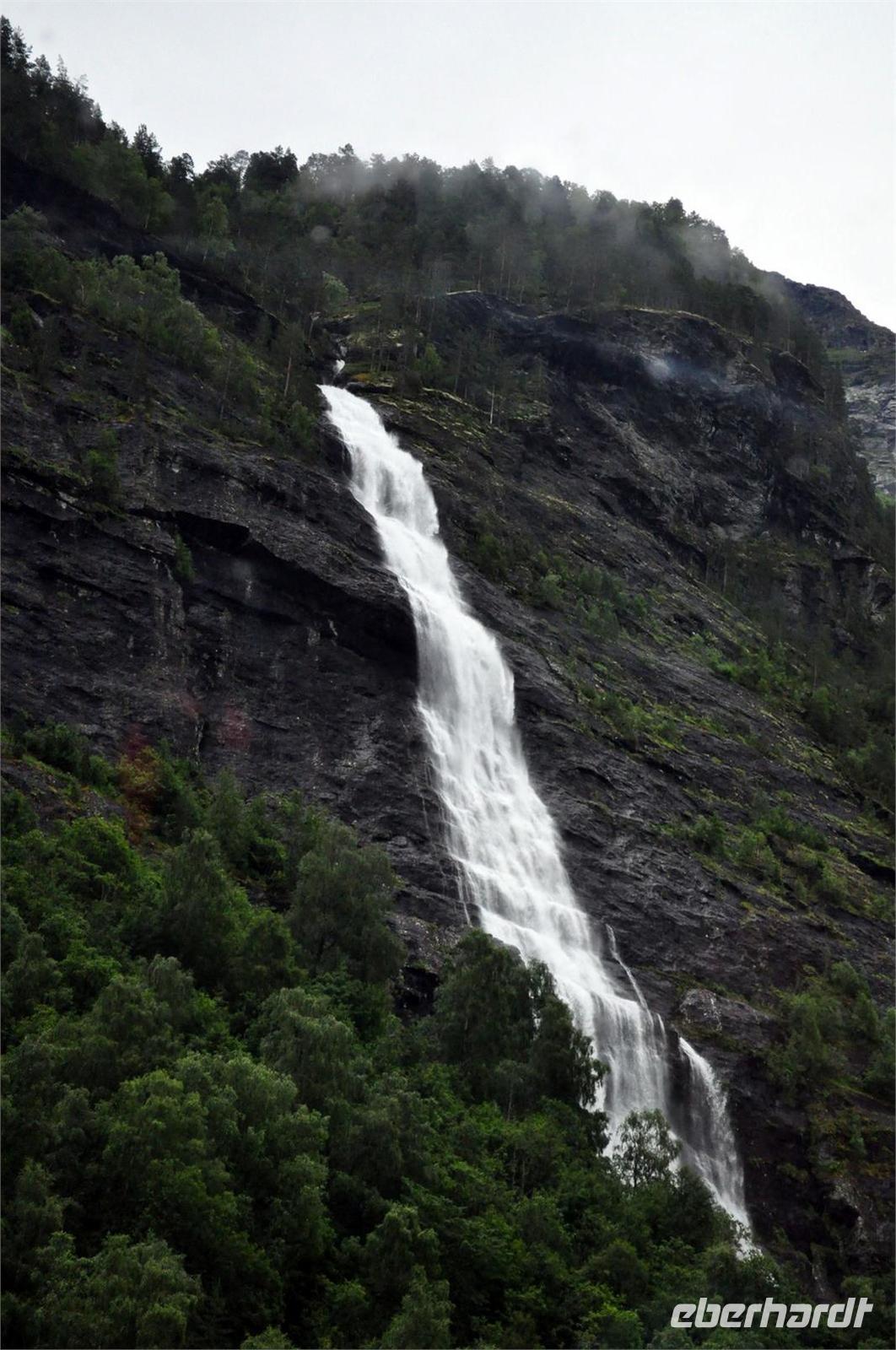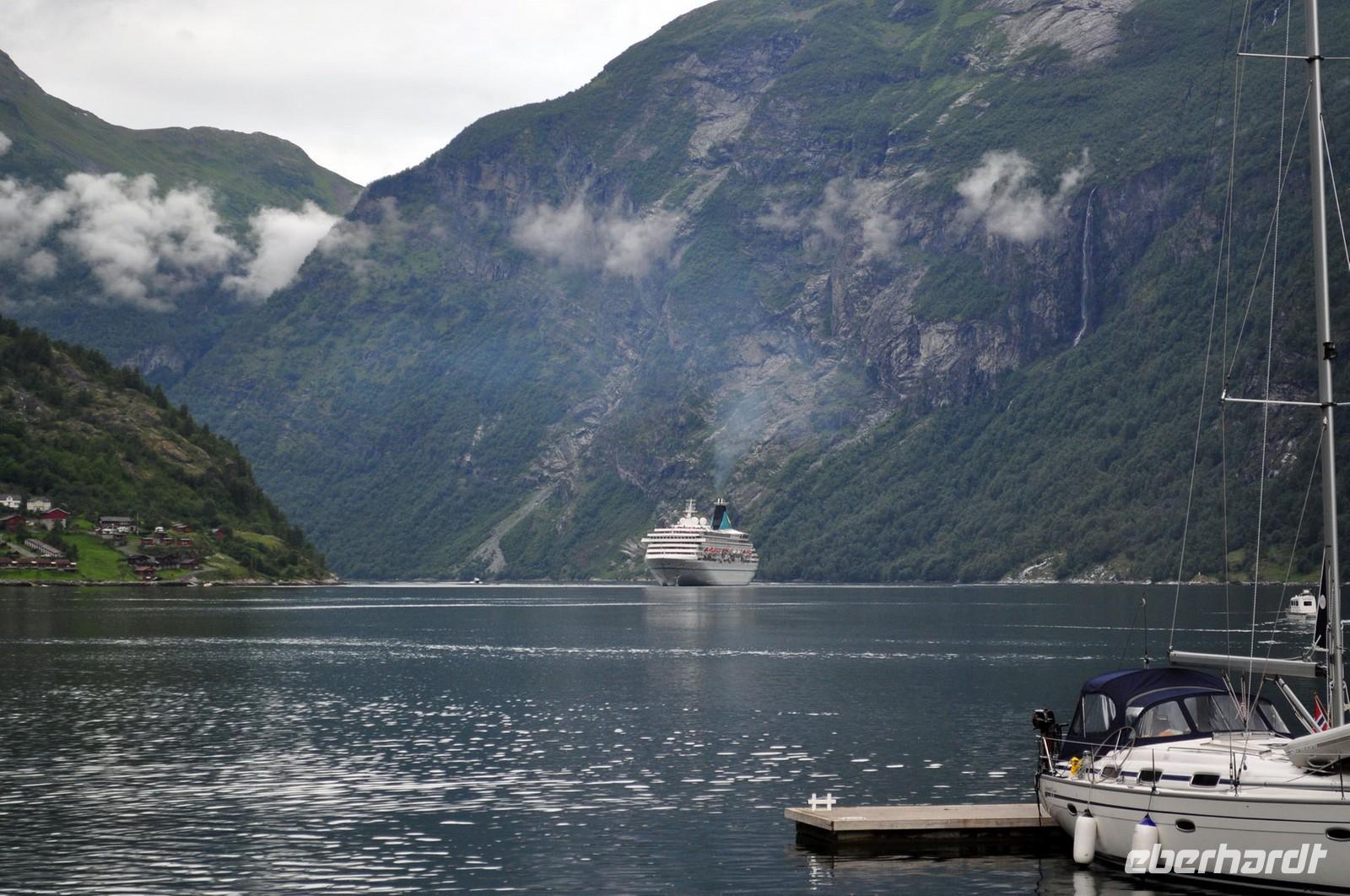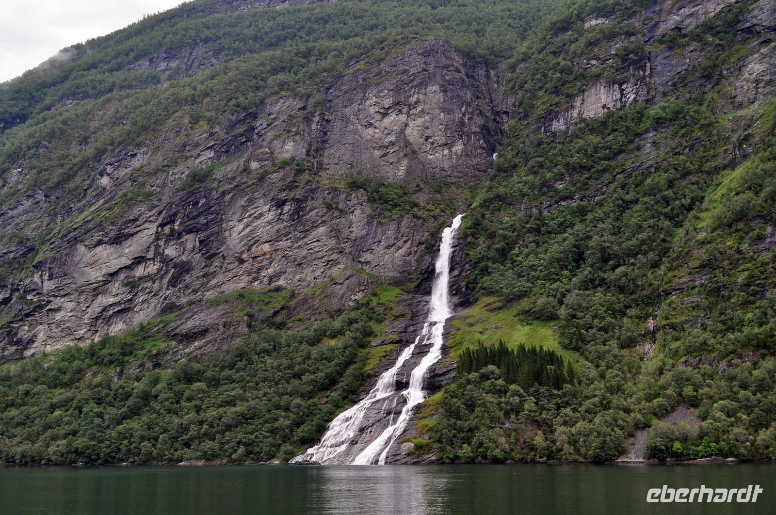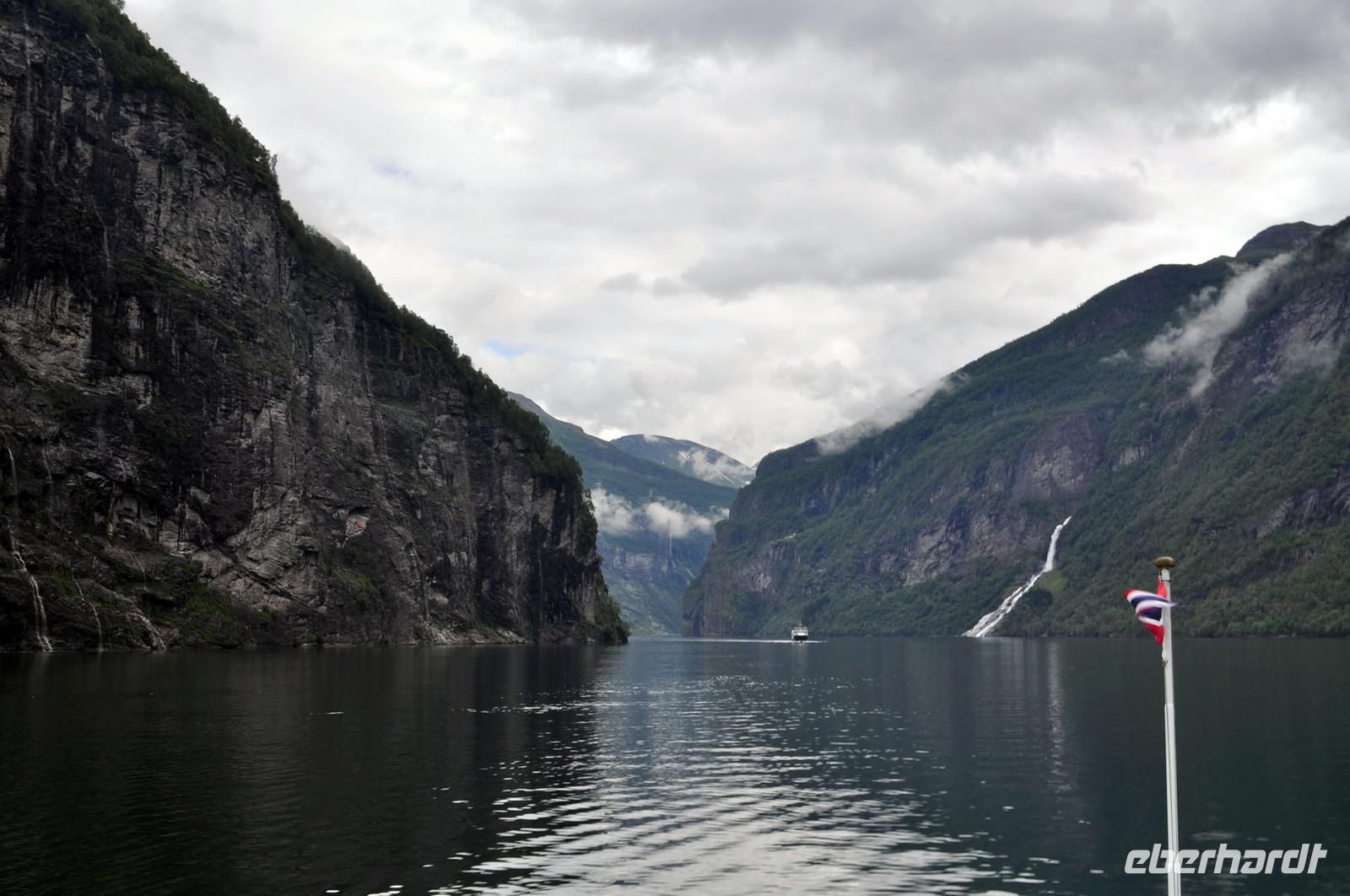 In Hellesylt schifften wir uns ein zu unserer Geiranger Kreuzfahrt. In etwa einer Stunde brachte uns das Schiff vorbei an steil aufragenden Felswänden, berühmten Wasserfällen wie den 7 Schwestern und dem Brautschleier bis zum hintersten Winkel des Fjordes genannt Geiranger.