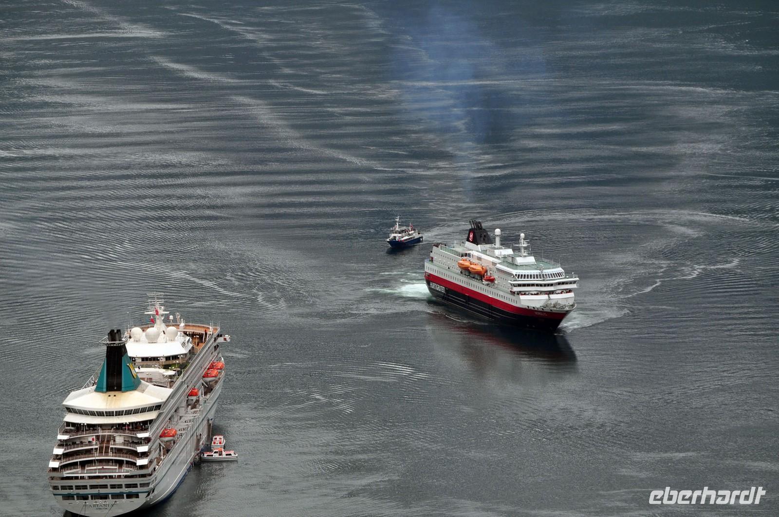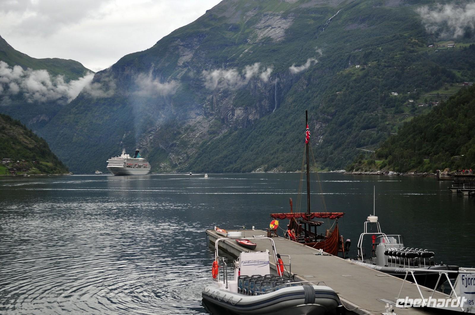 Nach ein wenig Freizeit im Ort setzten wir unsere Fahrt fort. Es ging steil bergauf zu wunderschönen Aussichtspunkten hoch über dem Fjord. Pünktlich um 13.30 Uhr traf "unser" Hurtigrutenschiff die MS Nordlys ein, die mittlerweile in Bergen war und sich nun wieder auf der nordgehenden Route befand. Sowohl das große Kreuzfahrtschiff wie auch die Hurtigruten wirken wie Spielzeugboote.